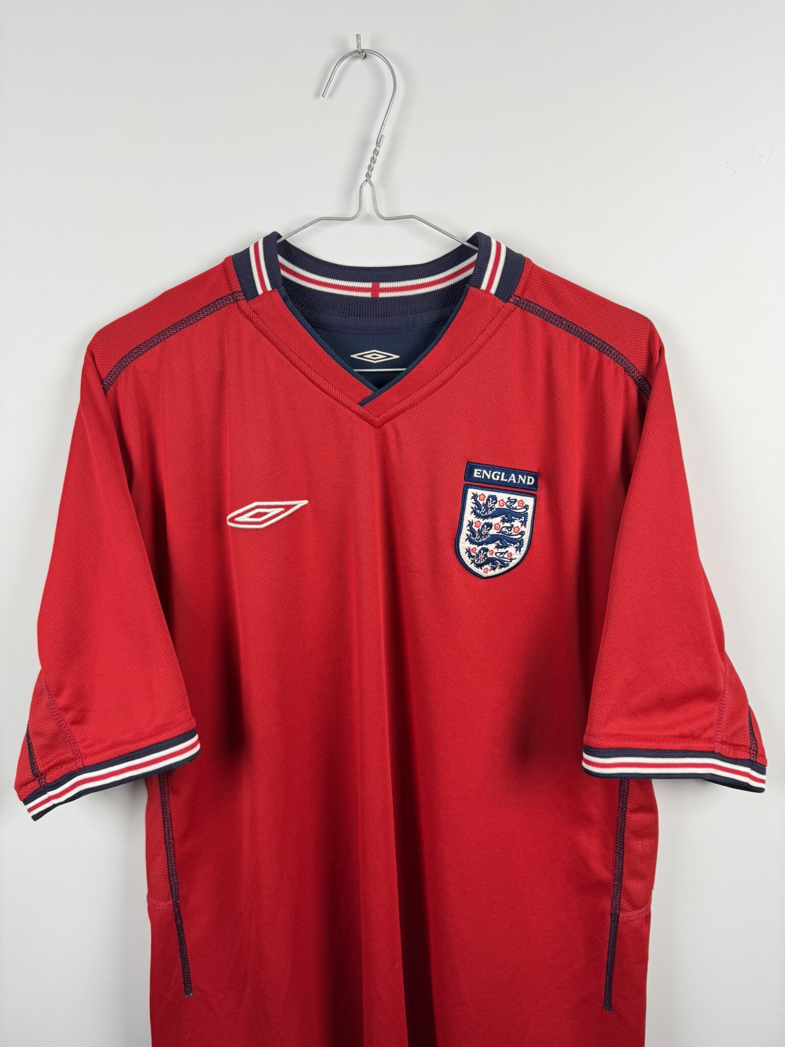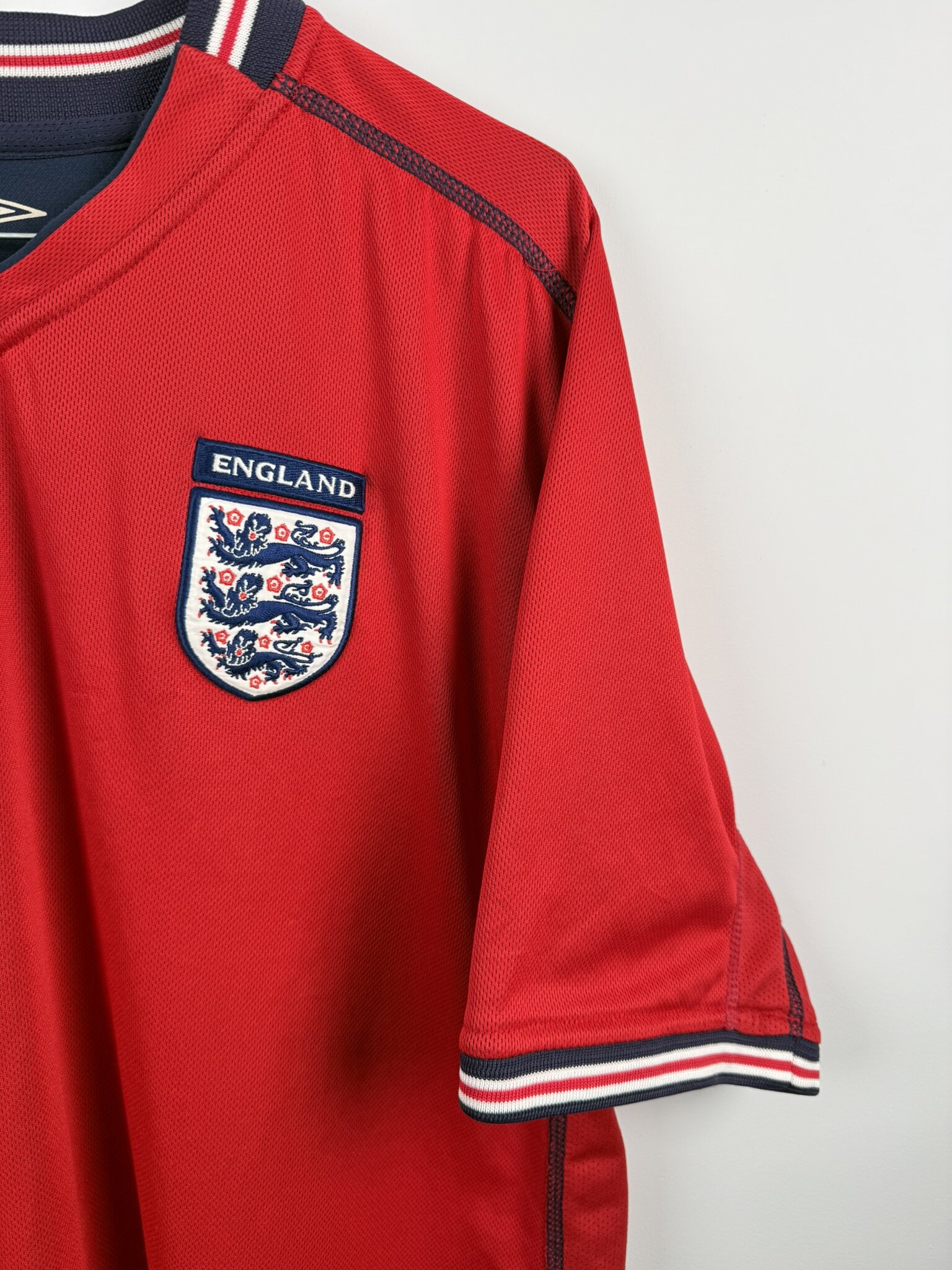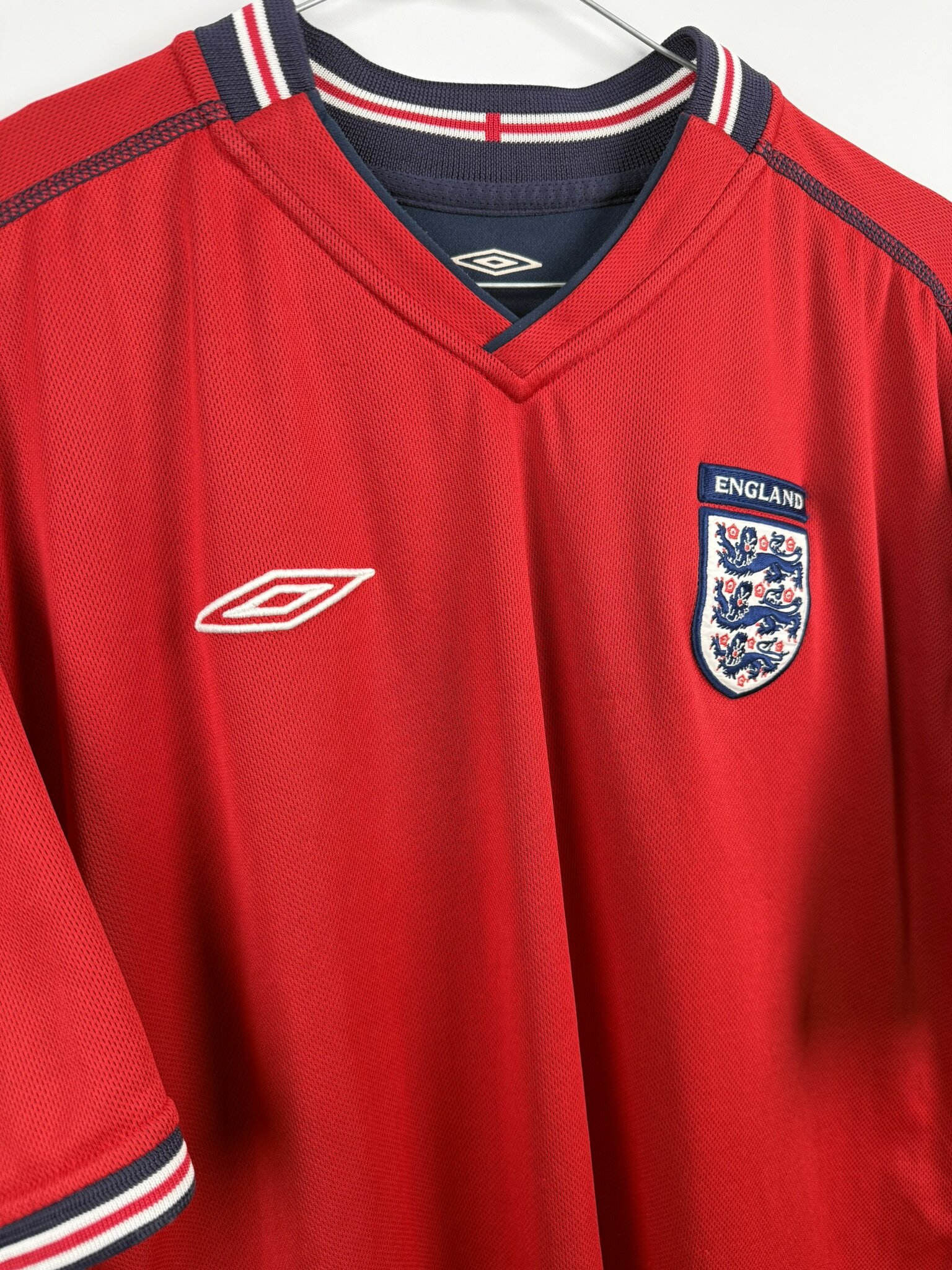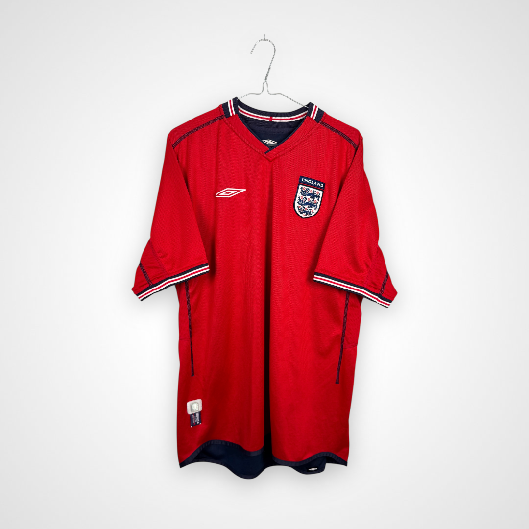 Oryginalna wyjazdowa koszulka reprezentacji Anglii produkcji Umbro z lat 2002-04. Lwy Albionu wystąpiły w tych trykotach podczas Mundialu rozgrywanego w 2002 roku w Japonii i Korei, gdzie odpadli w 1/4 finału, przegrywając z przyszłymi zwycięzcami turnieju, czyli reprezentacją Brazylii, w której szalał wtedy legendarny Luis Nazario De Lima, popularny Ronaldo.