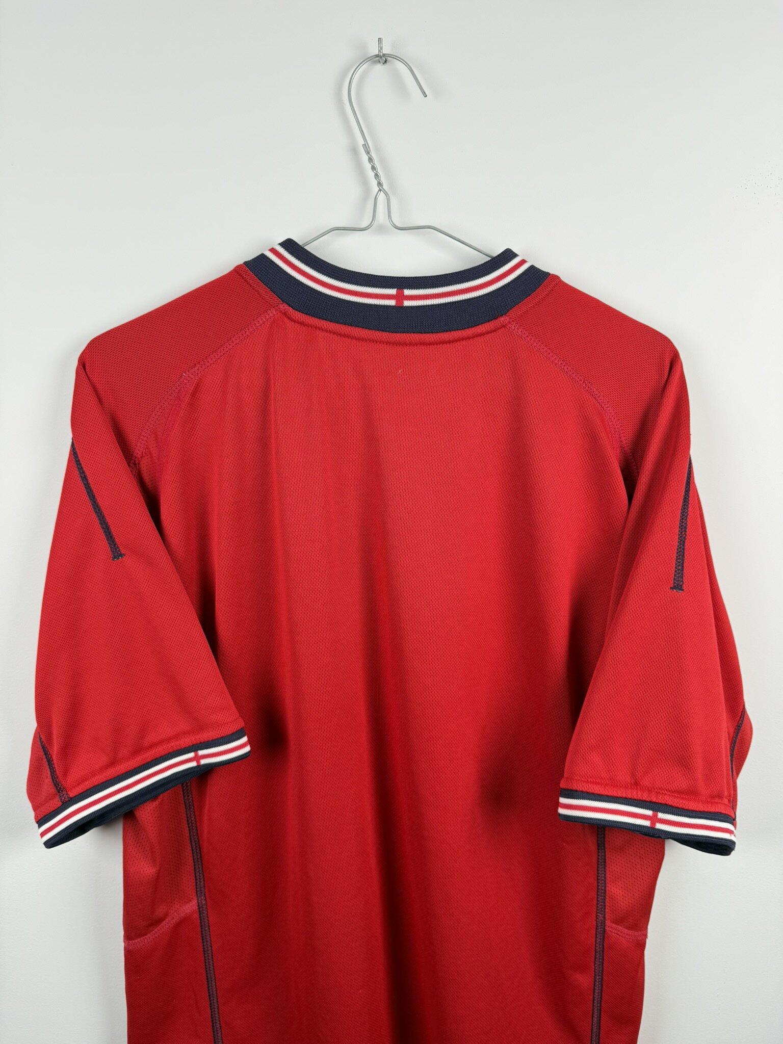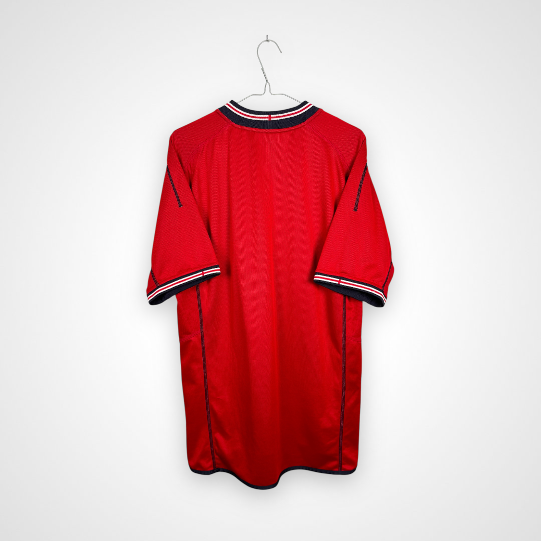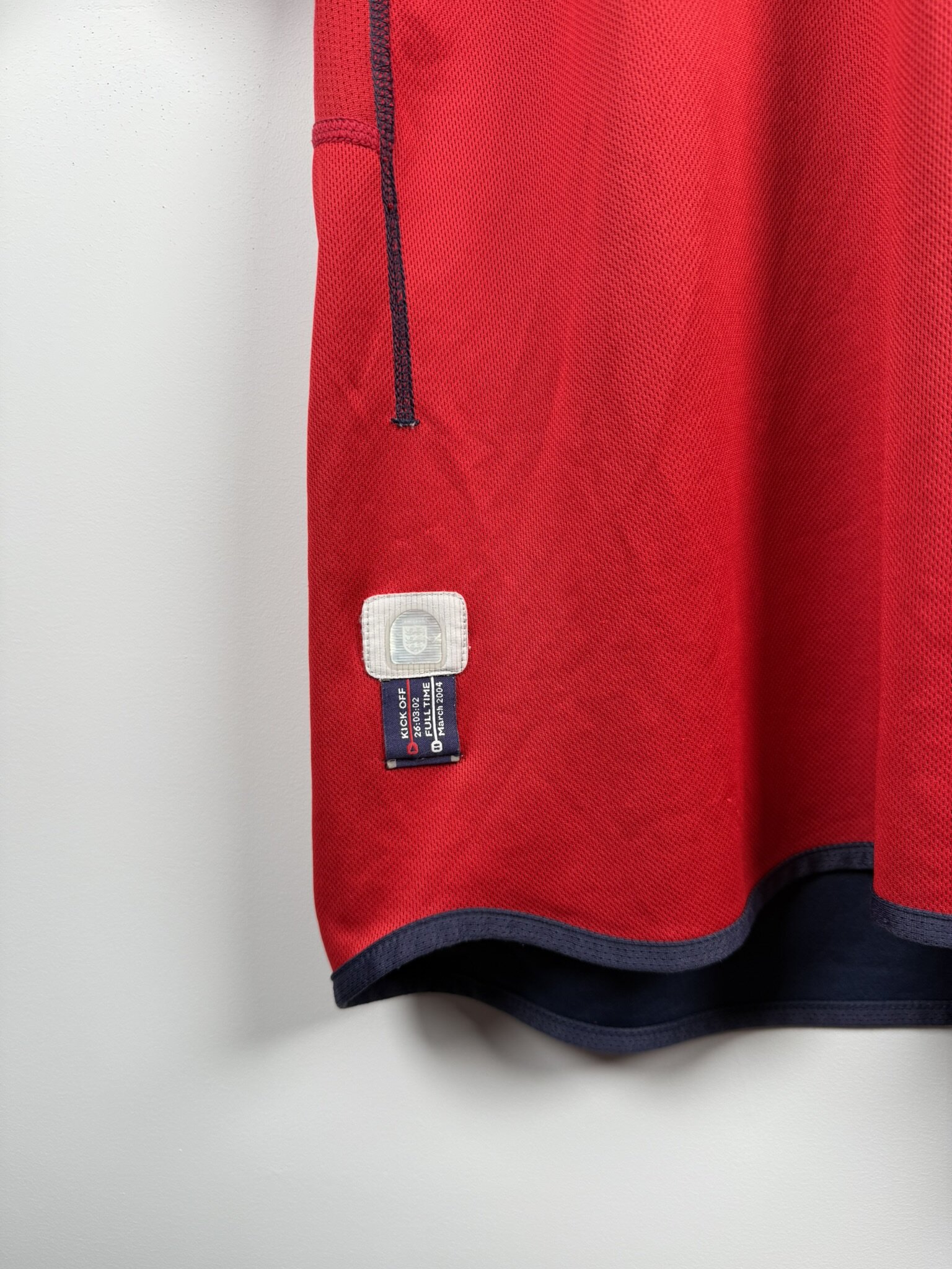 Oryginalna wyjazdowa koszulka reprezentacji Anglii produkcji Umbro z lat 2002-04. Lwy Albionu wystąpiły w tych trykotach podczas Mundialu rozgrywanego w 2002 roku w Japonii i Korei, gdzie odpadli w 1/4 finału, przegrywając z przyszłymi zwycięzcami turnieju, czyli reprezentacją Brazylii, w której szalał wtedy legendarny Luis Nazario De Lima, popularny Ronaldo.