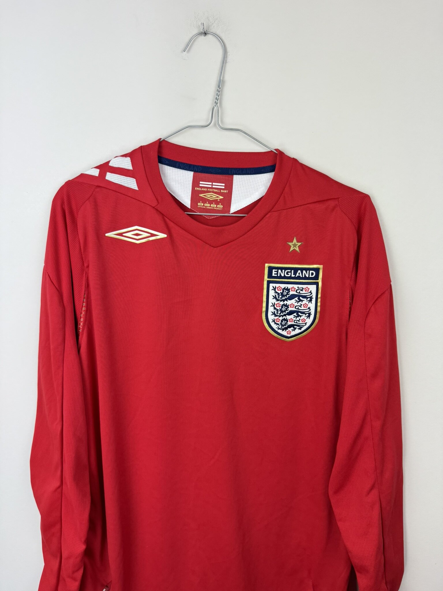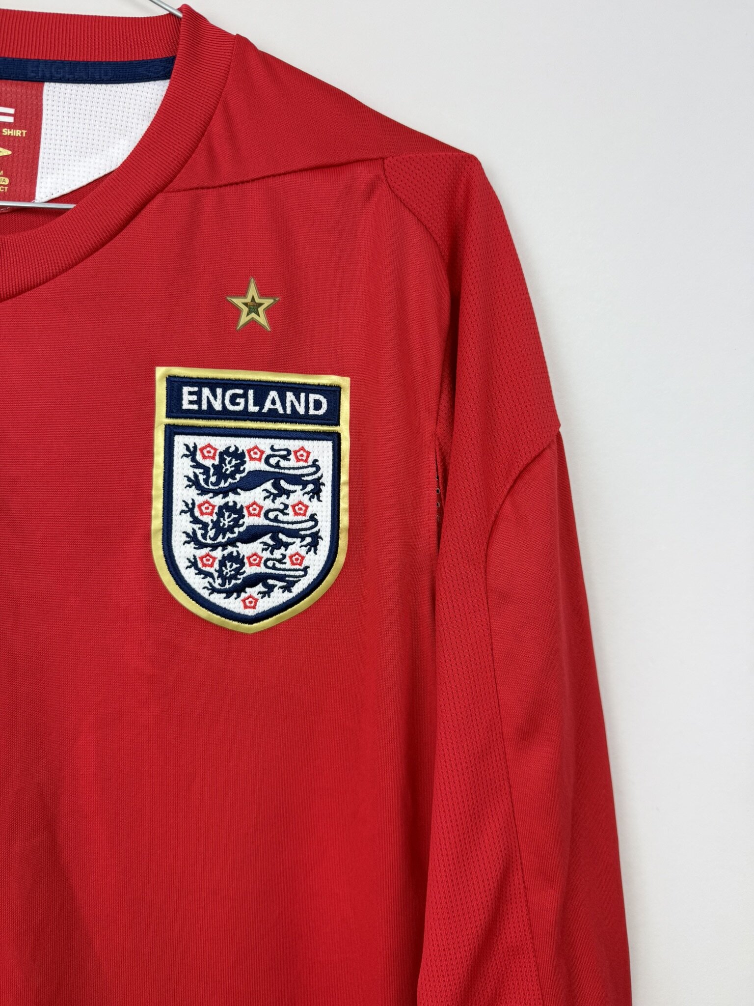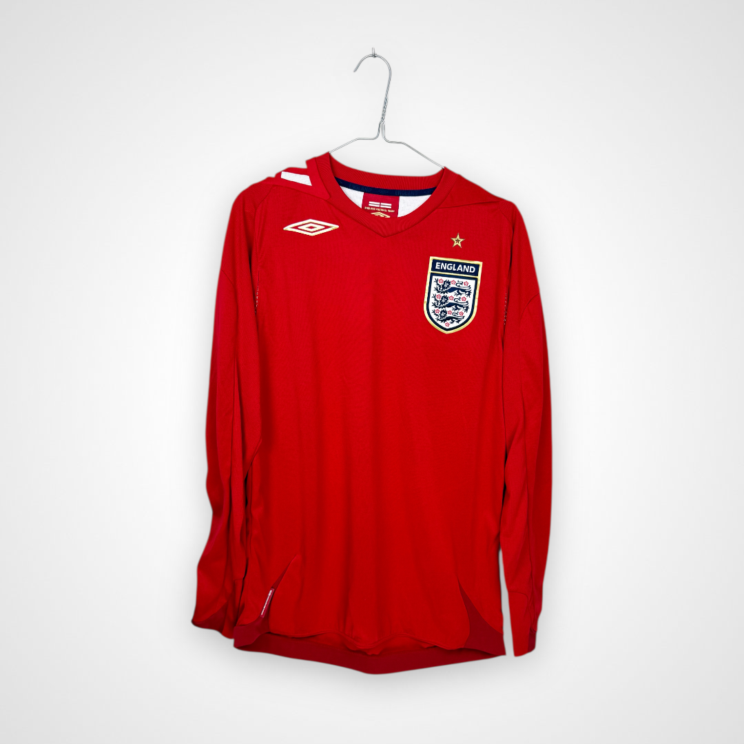 Ta oryginalna wyjazdowa koszulka reprezentacji Anglii z lat 2006–2008, wyprodukowana przez Umbro, to klasyczny model w czerwonym kolorze, który od dekad stanowi ikoniczny element wizerunku „Synów Albionu”. Egzemplarz w wersji z długim rękawem wyróżnia się eleganckim i minimalistycznym designem, charakterystycznym dla koszulek narodowych tego okresu.