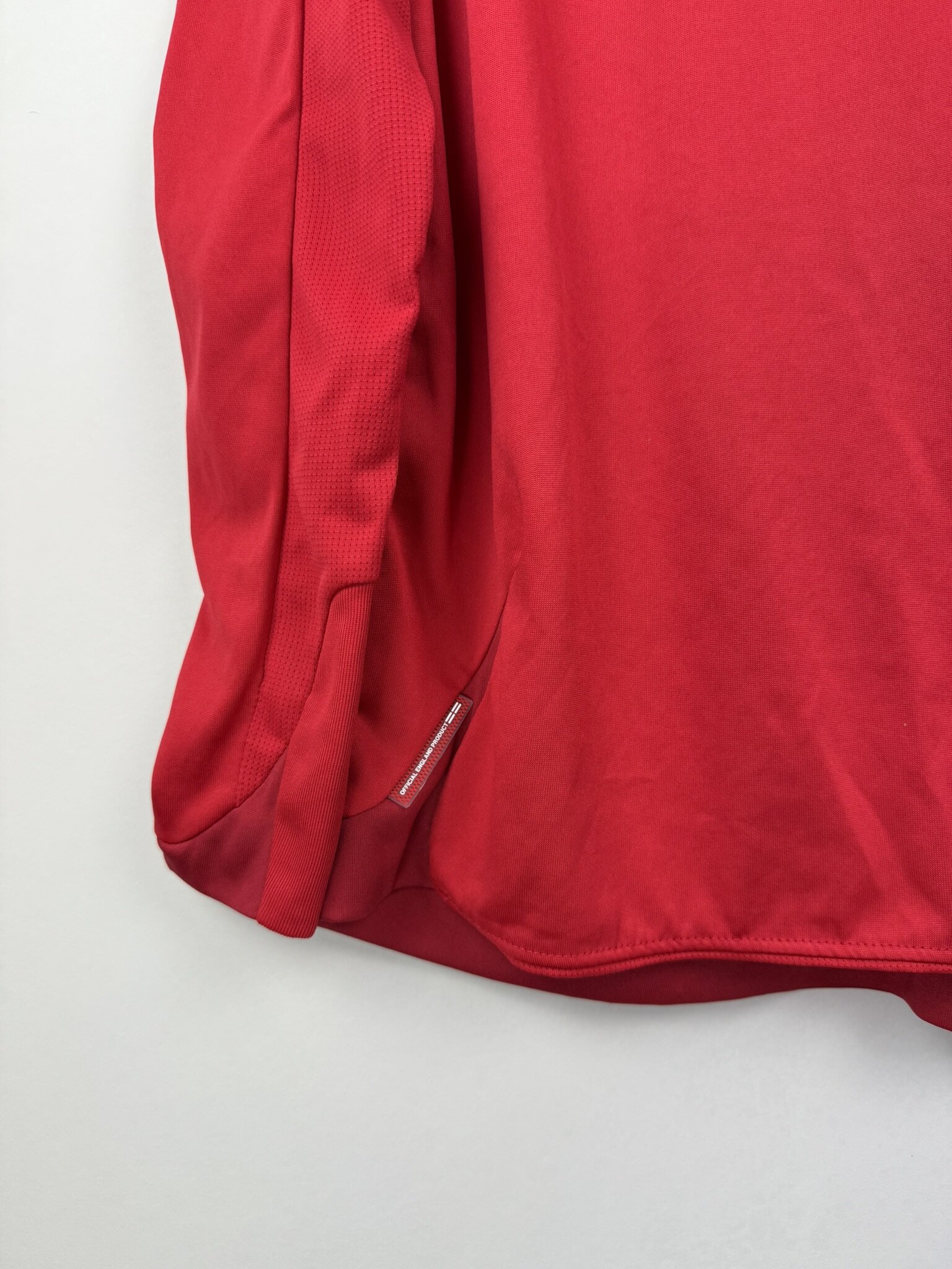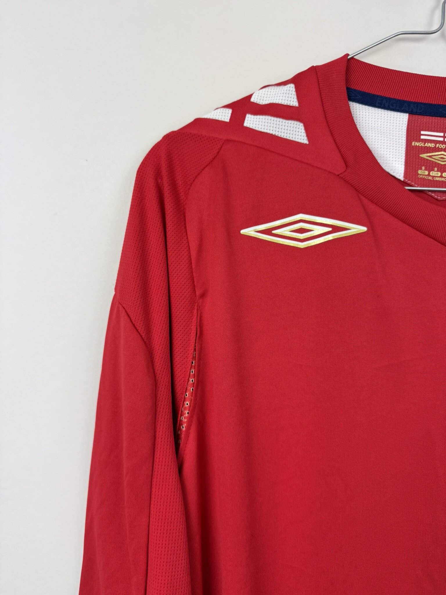 Na piersi umieszczono herb Angielskiej Federacji Piłkarskiej (FA) z trzema lwami, logo Umbro oraz subtelne złote detale, które podkreślają prestiż reprezentacyjnego stroju. Koszulka wykonana została w technologii Umbro X-Static, dzięki czemu zapewniała zawodnikom komfort, oddychalność i dopasowanie podczas gry na najwyższym poziomie.