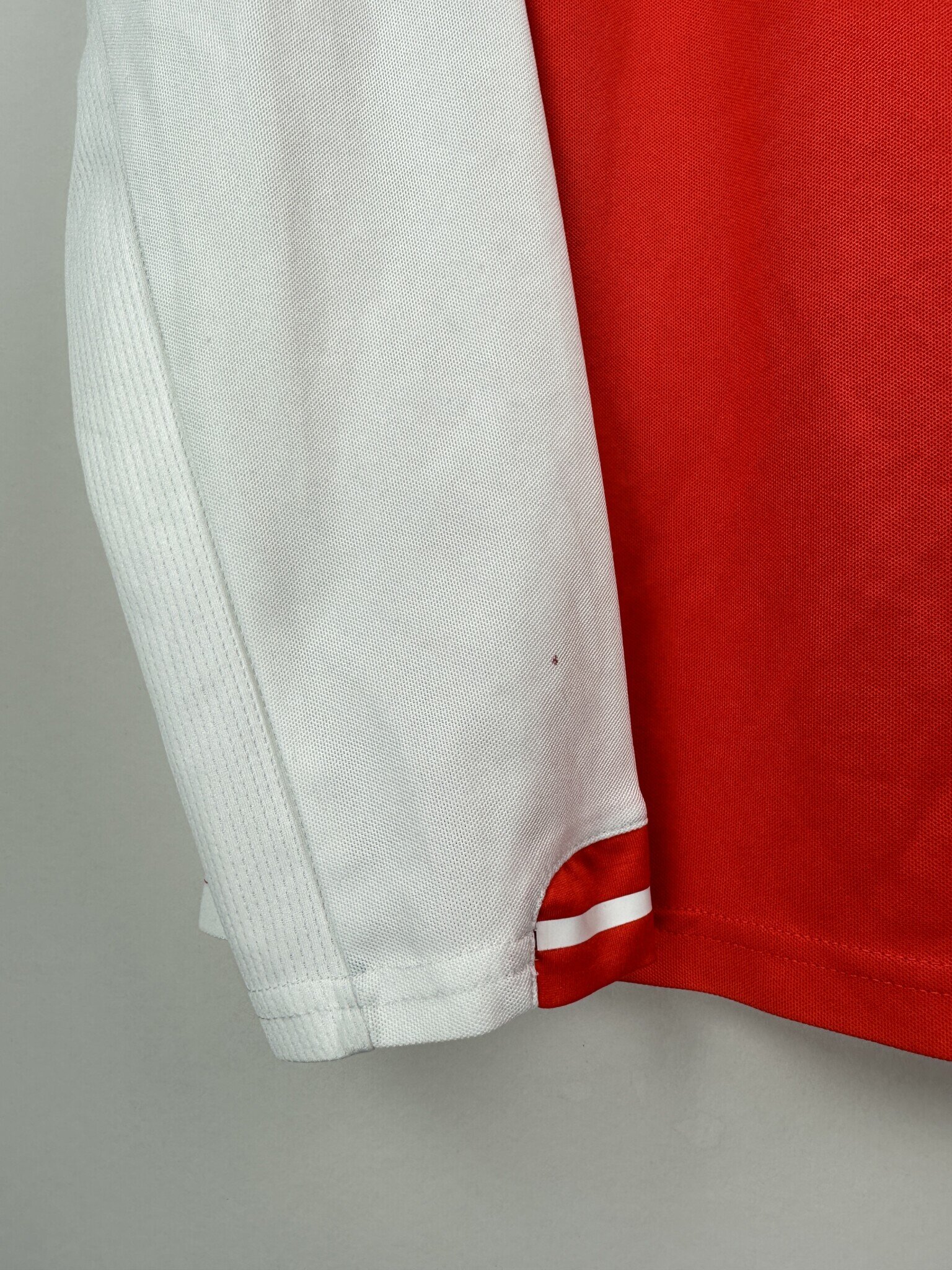 Stan: Dobry – dwa mikro zabrudzenia na prawym rękawie i zaciągnięcie. oraz brak białych pasków, które odpadły na froncie.