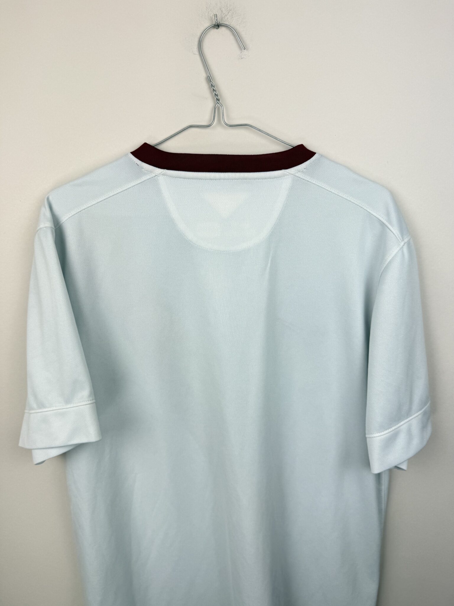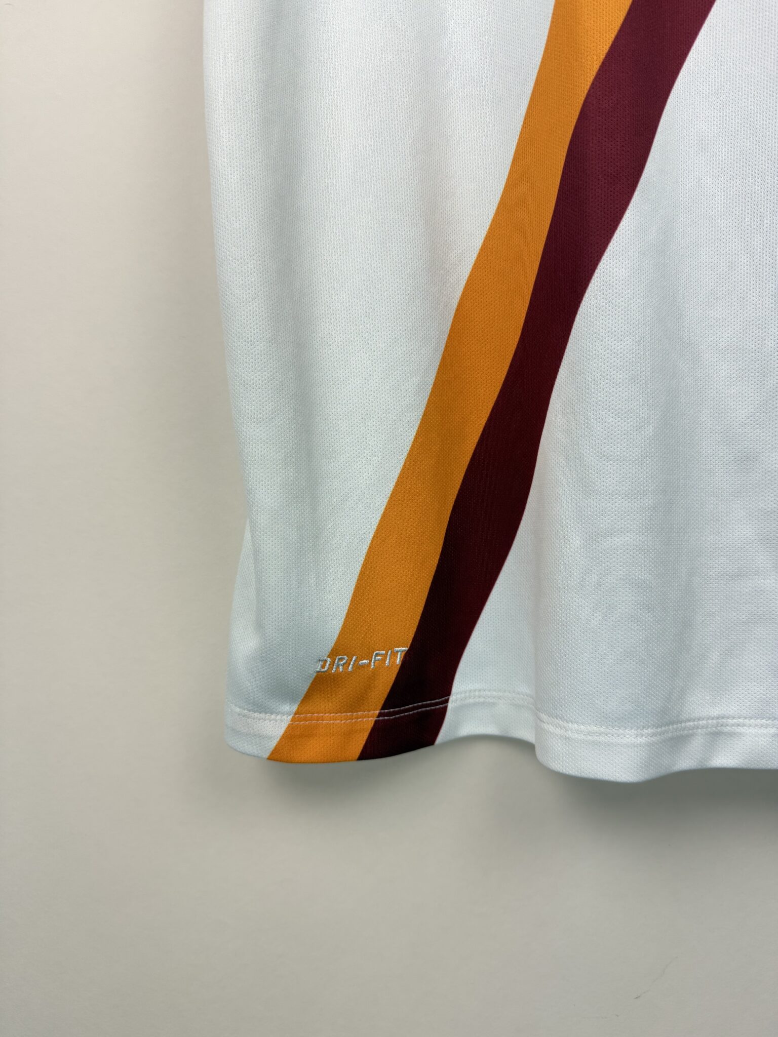 Prezentujemy wyjazdową koszulkę piłkarską AS Roma z sezonu 2014/15, zaprojektowaną przez legendarną markę Nike. Ten model wyróżnia się elegancką, jasną kolorystyką w odcieniu kości słoniowej, którą przełamują subtelne bordowe i pomarańczowe detale. Na lewej piersi widnieje herb Giallorossich, symbolizujący bogatą historię rzymskiego klubu, a po prawej stronie minimalistyczne logo Nike. Koszulka ma klasyczny, lekko dopasowany krój, który idealnie łączy styl z funkcjonalnością.