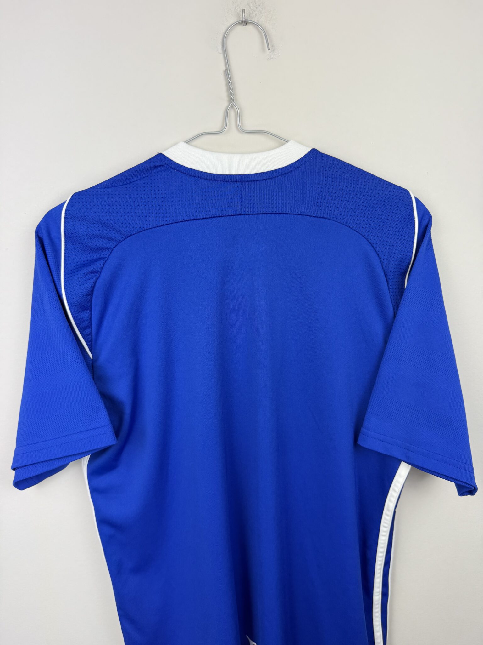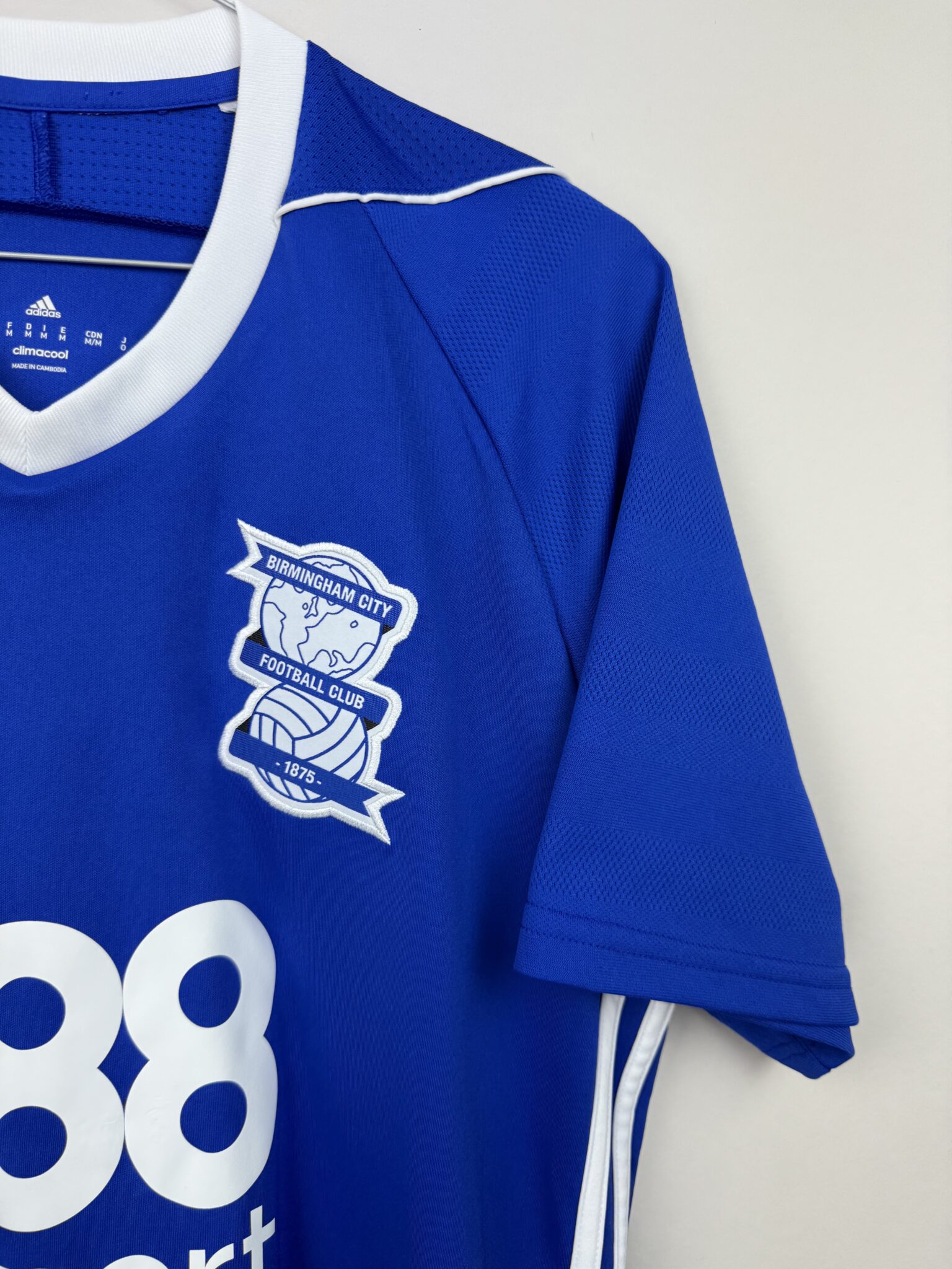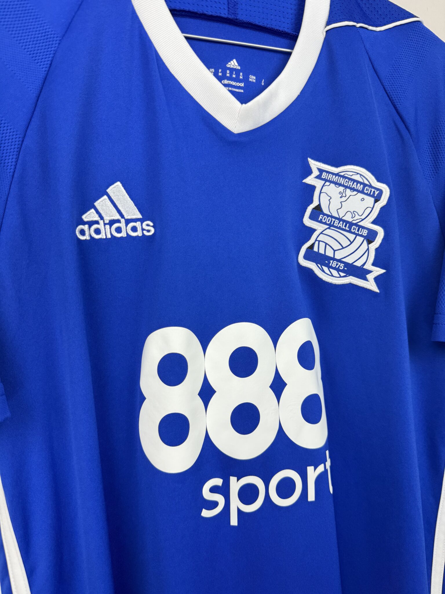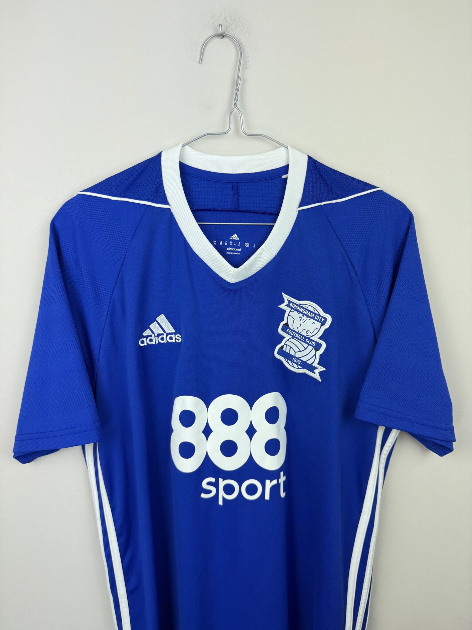 Przedstawiamy domową koszulkę piłkarską Birmingham City z sezonu 2017/18, stworzoną przez renomowaną firmę Adidas, która w tym czasie była oficjalnym dostawcą sprzętu dla klubu. Ten model wyróżnia się klasycznym niebieskim kolorem z białymi detalami, idealnie oddającym tradycyjną stylistykę „The Blues”. Na froncie widnieje oficjalny herb Birmingham City, charakterystyczne logo Adidasa oraz emblemat sponsora głównego 888Sport, co nadaje koszulce autentyczny, meczowy charakter.