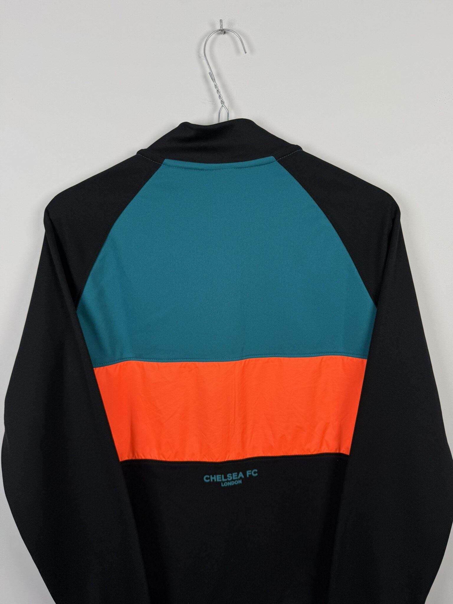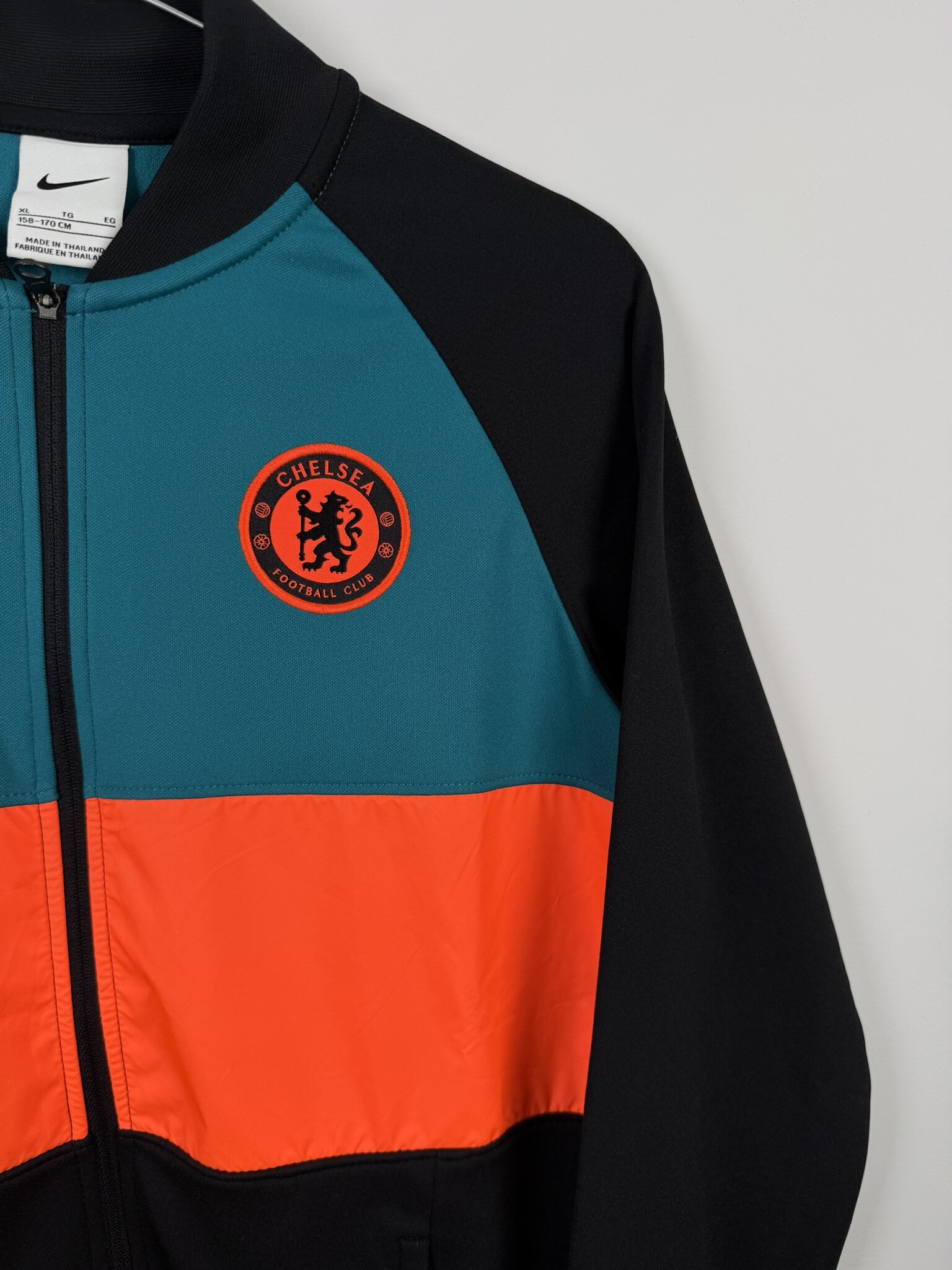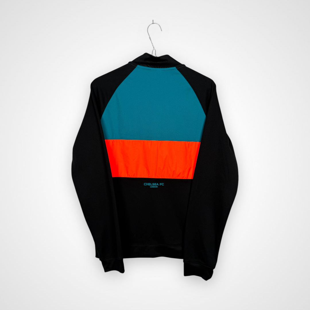 Ta oryginalna bluza klubowa Chelsea FC z sezonu 2021/22, wyprodukowana przez Nike, to młodzieżowy model na wzrost 158 cm. Utrzymana w eleganckiej czarnej bazie, wyróżnia się nowoczesnym designem z dużymi, kontrastującymi prostokątnymi panelami w kolorze turkusowym oraz pomarańczowym umieszczonymi na froncie. Całość dopełnia zamek błyskawiczny oraz krótki kołnierzyk, które podkreślają sportowy i funkcjonalny charakter bluzy.