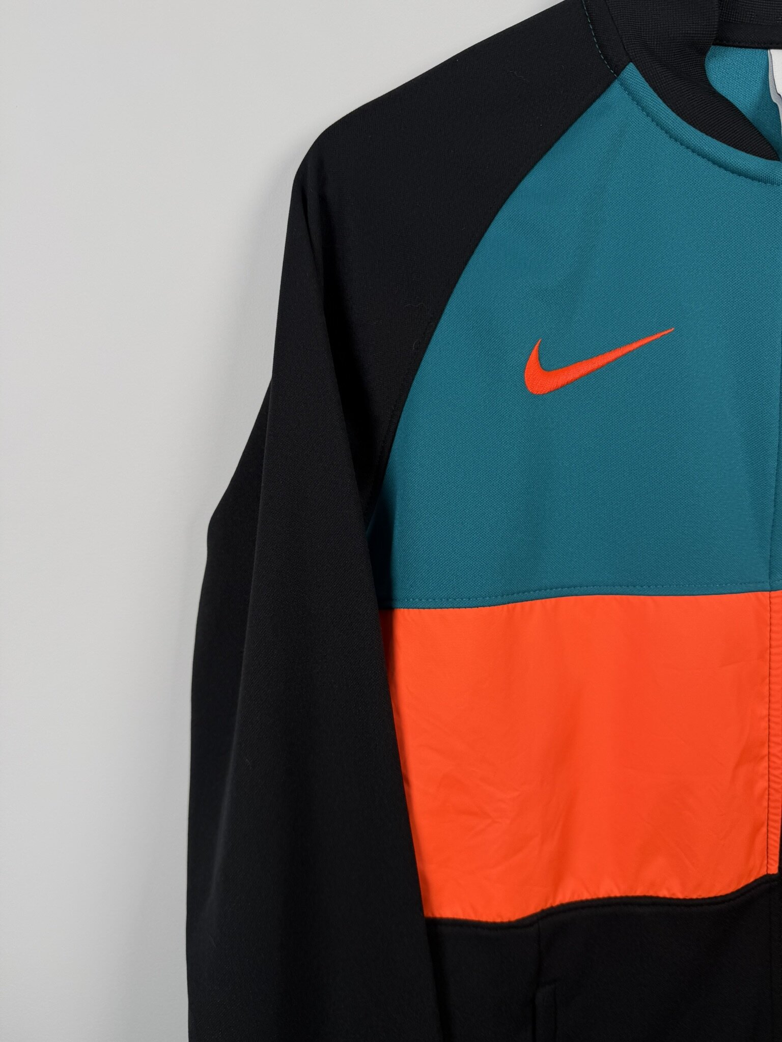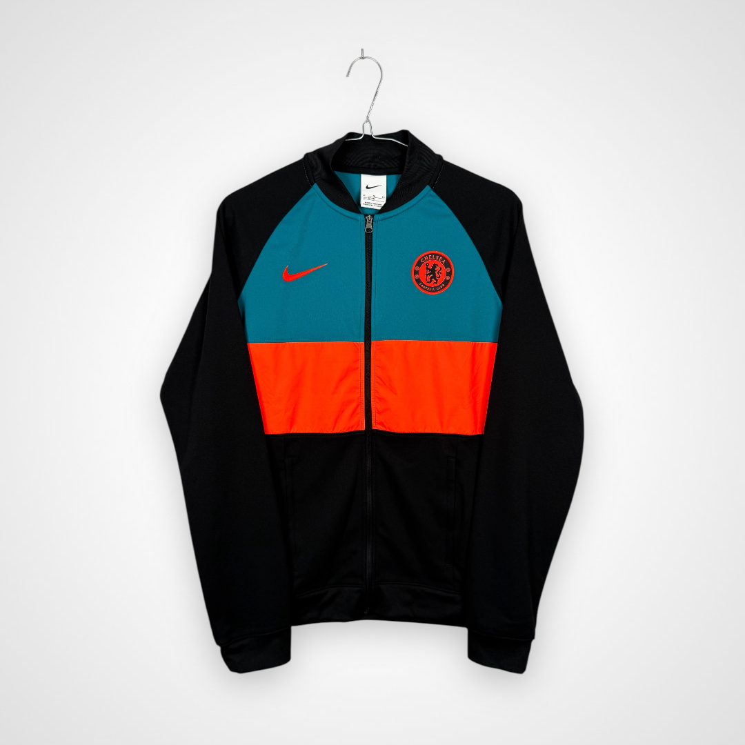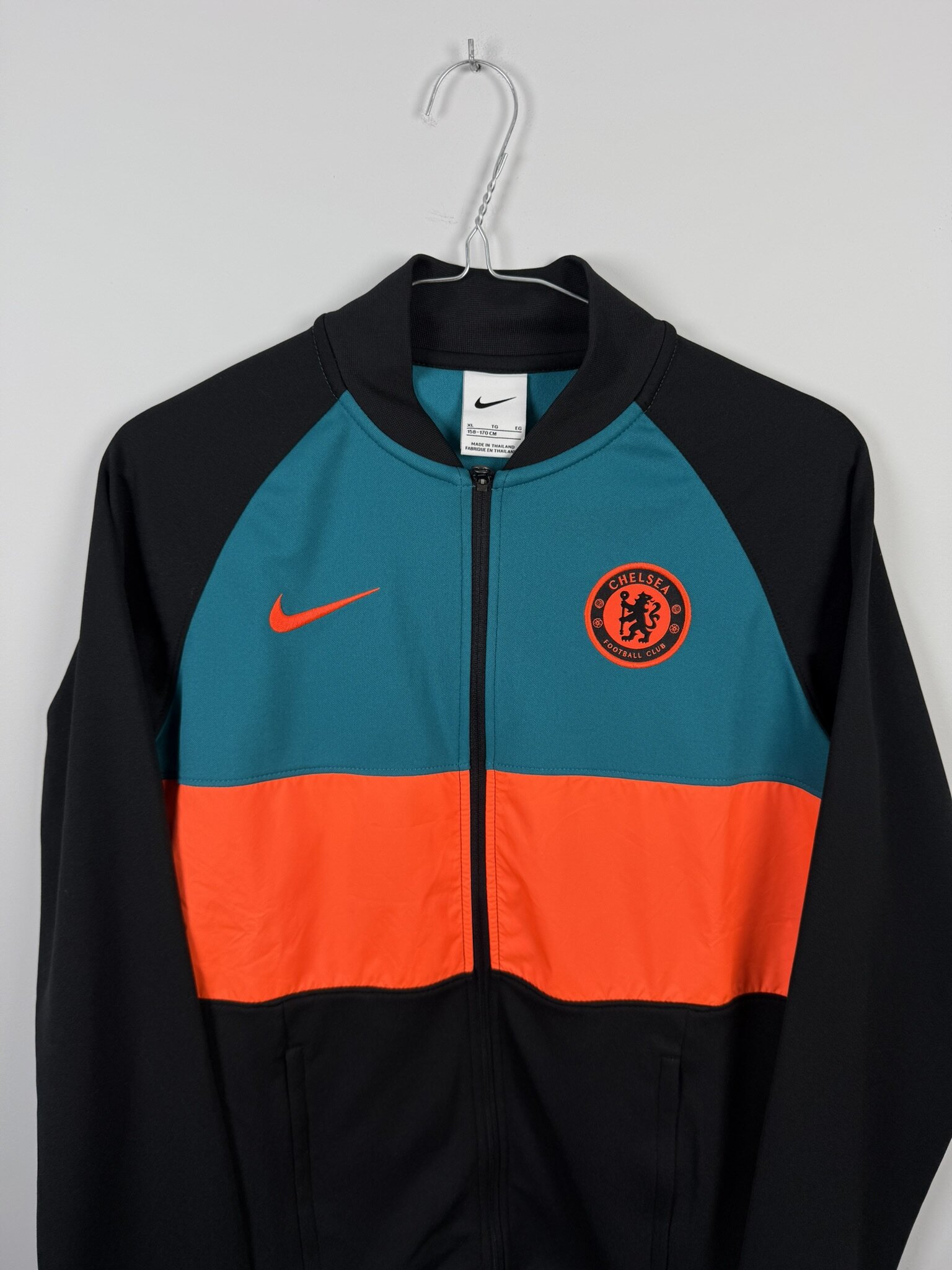 Ta oryginalna bluza klubowa Chelsea FC z sezonu 2021/22, wyprodukowana przez Nike, to młodzieżowy model na wzrost 158 cm. Utrzymana w eleganckiej czarnej bazie, wyróżnia się nowoczesnym designem z dużymi, kontrastującymi prostokątnymi panelami w kolorze turkusowym oraz pomarańczowym umieszczonymi na froncie. Całość dopełnia zamek błyskawiczny oraz krótki kołnierzyk, które podkreślają sportowy i funkcjonalny charakter bluzy.