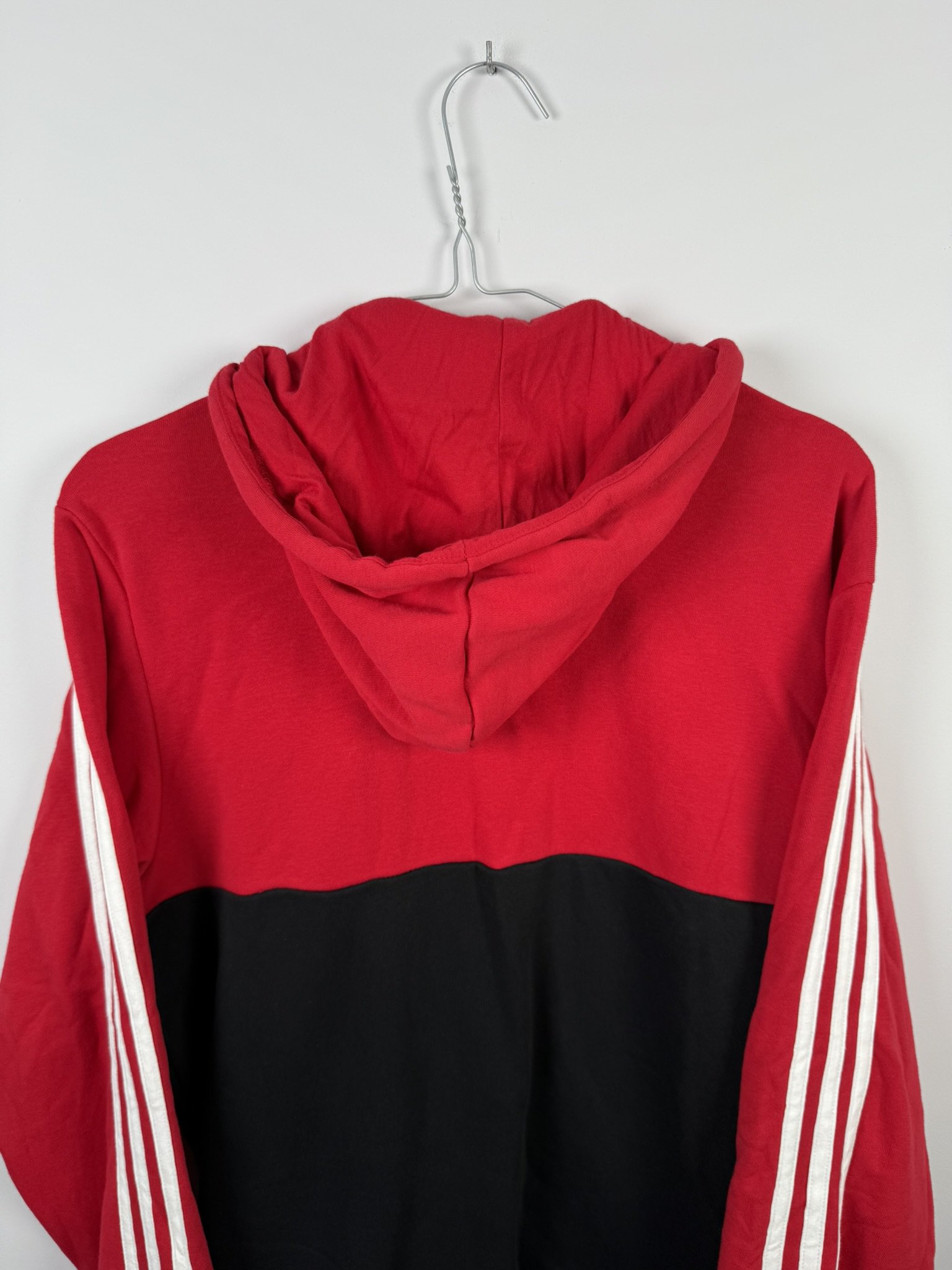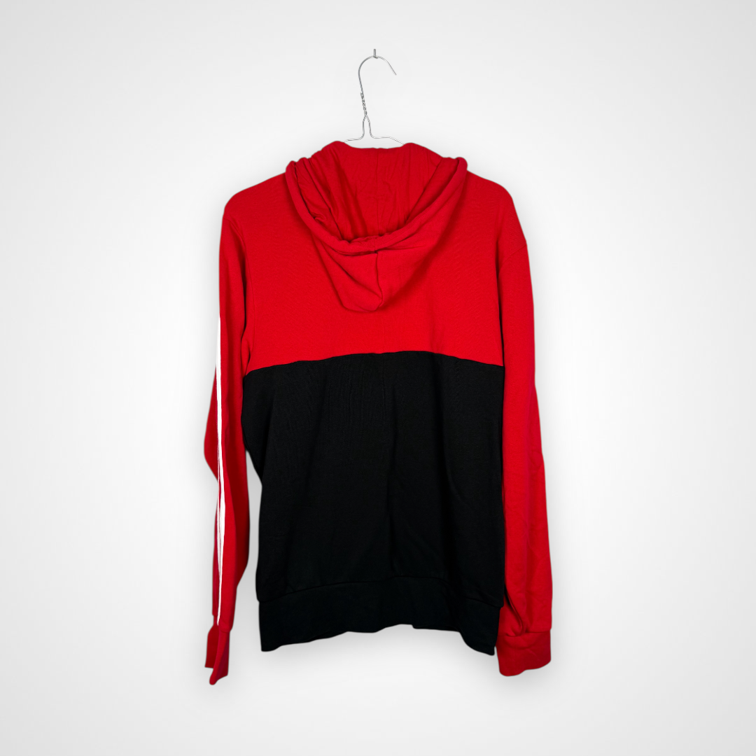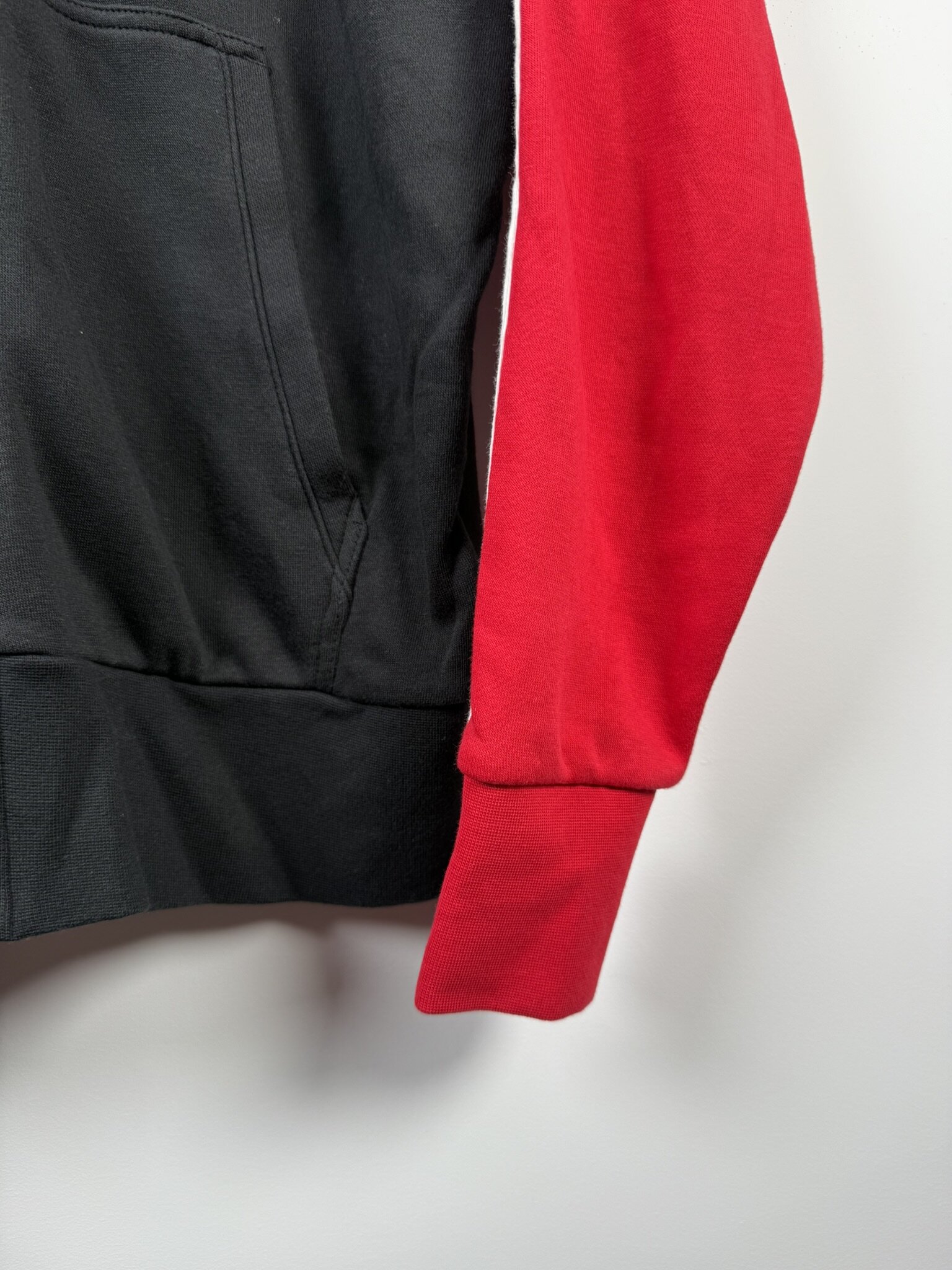 Ta bawełniana bluza rozpinana Manchesteru United z sezonu 2016/17, wyprodukowana przez Adidasa, to oficjalny element klubowej kolekcji lifestyle’owej, który łączy w sobie sportowy styl, wygodę i klubową tożsamość. Utrzymana w charakterystycznych dla klubu barwach – intensywnej czerwieni i czerni, została dodatkowo ozdobiona białymi trzema paskami na rękawach, będącymi znakiem rozpoznawczym niemieckiego producenta.