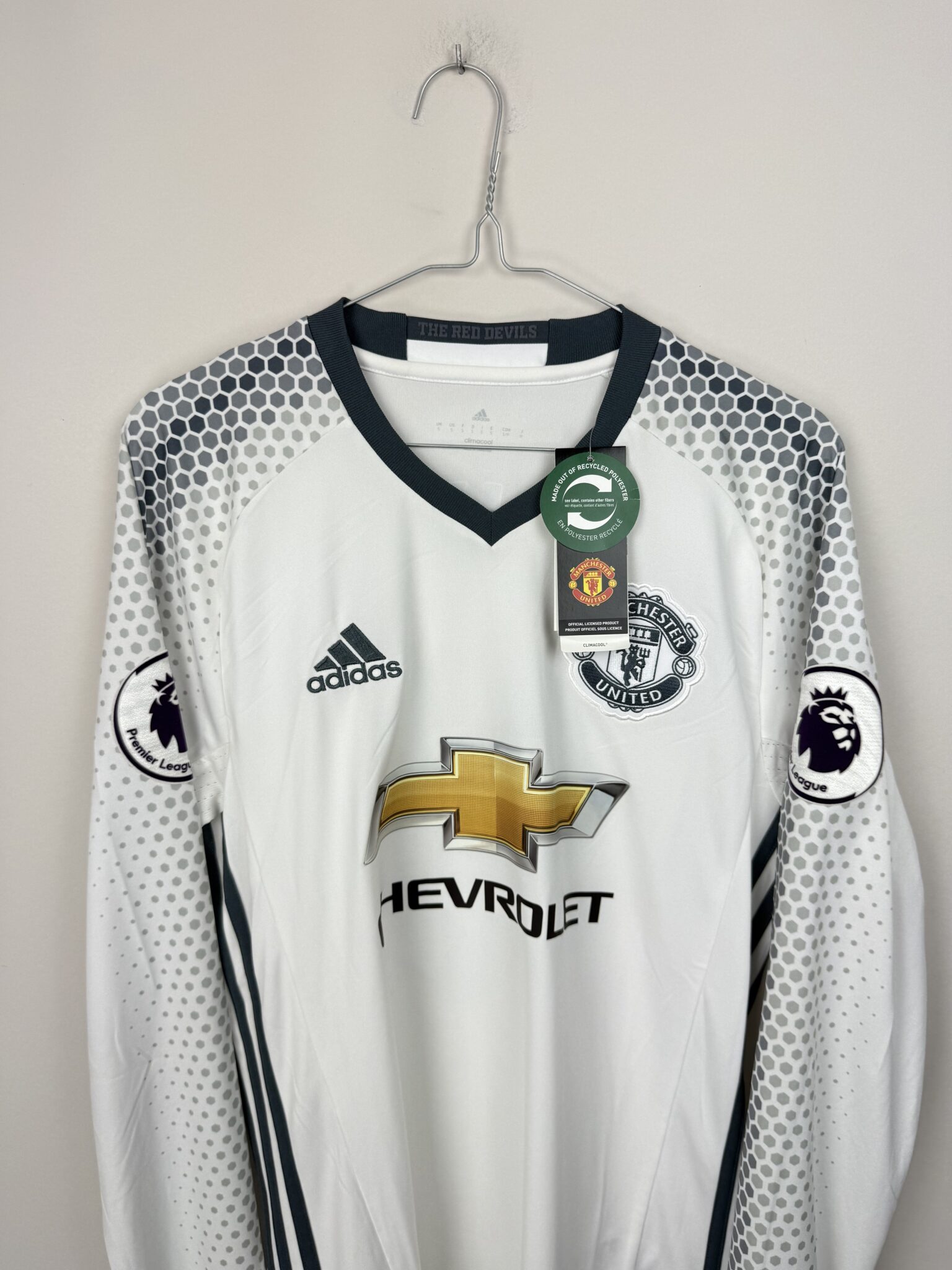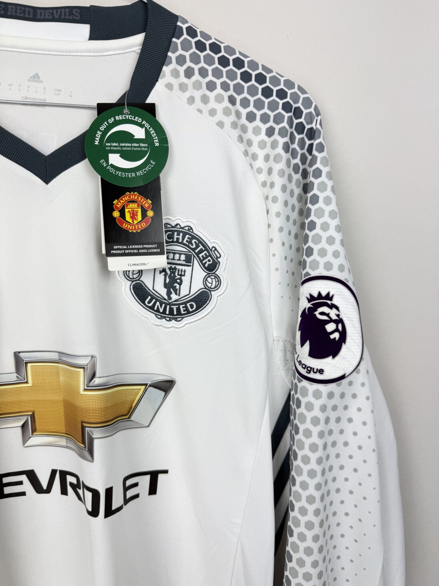 Przedstawiamy oryginalną, trzecią koszulkę piłkarską Manchesteru United z sezonu 2016/17, wyprodukowaną przez firmę Adidas, w wyjątkowej wersji z długim rękawem, oficjalnym nadrukiem Zlatana Ibrahimovicia oraz emblematem Premier League na rękawku. Koszulka posiada jeszcze oryginalne metki sklepowe, co czyni ją szczególnie atrakcyjną dla kolekcjonerów.