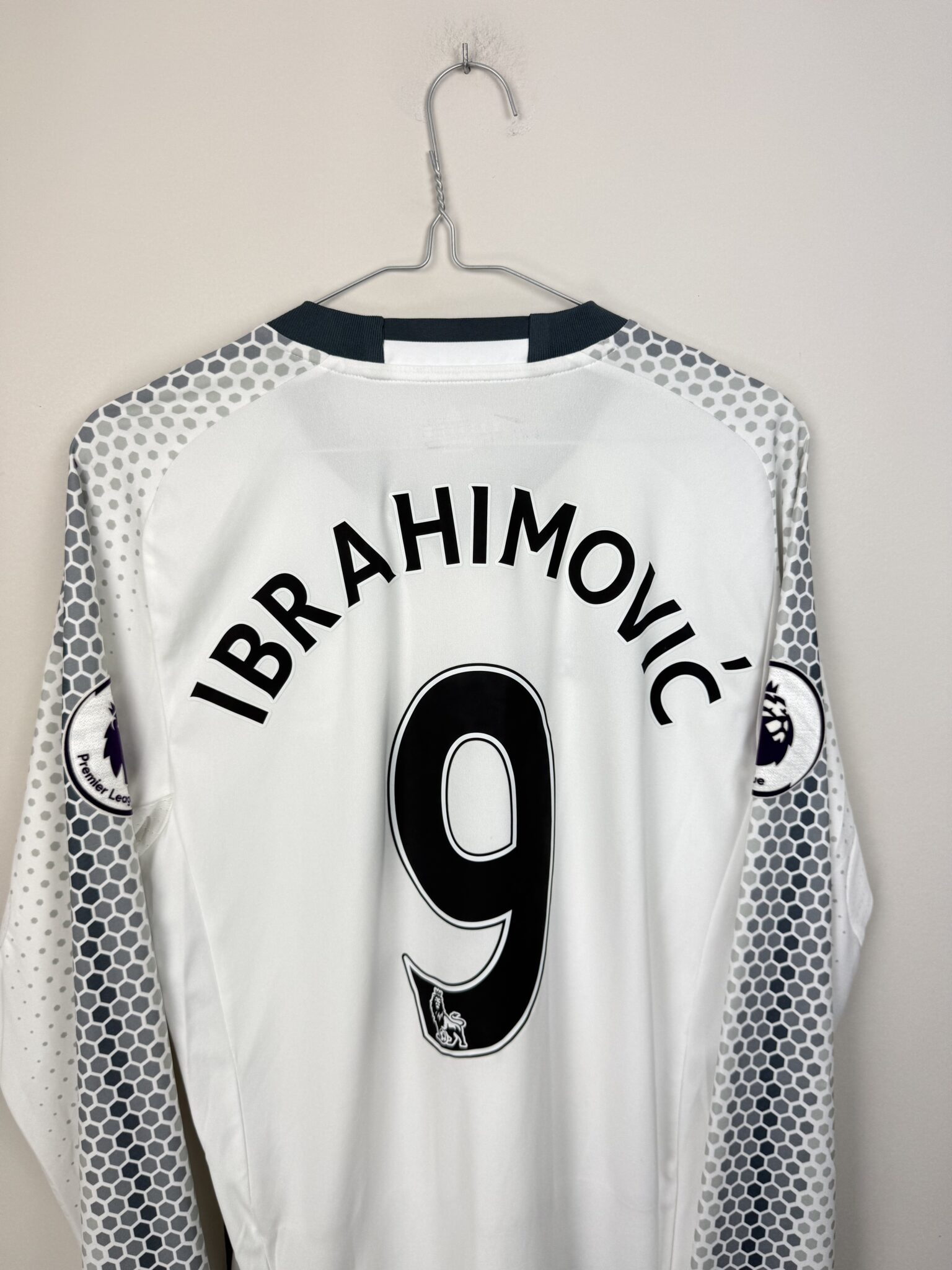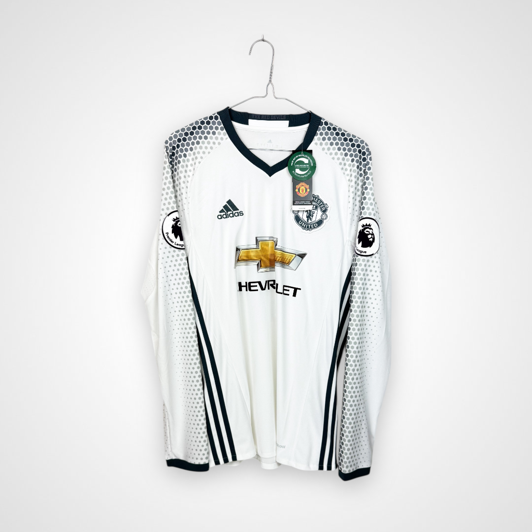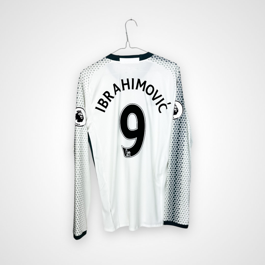 Oryginalna trzecia koszulka piłkarska Manchesteru United – Adidas 2016/17 z długim rękawem, nadrukiem Zlatana Ibrahimovicia i emblematem ligowym.