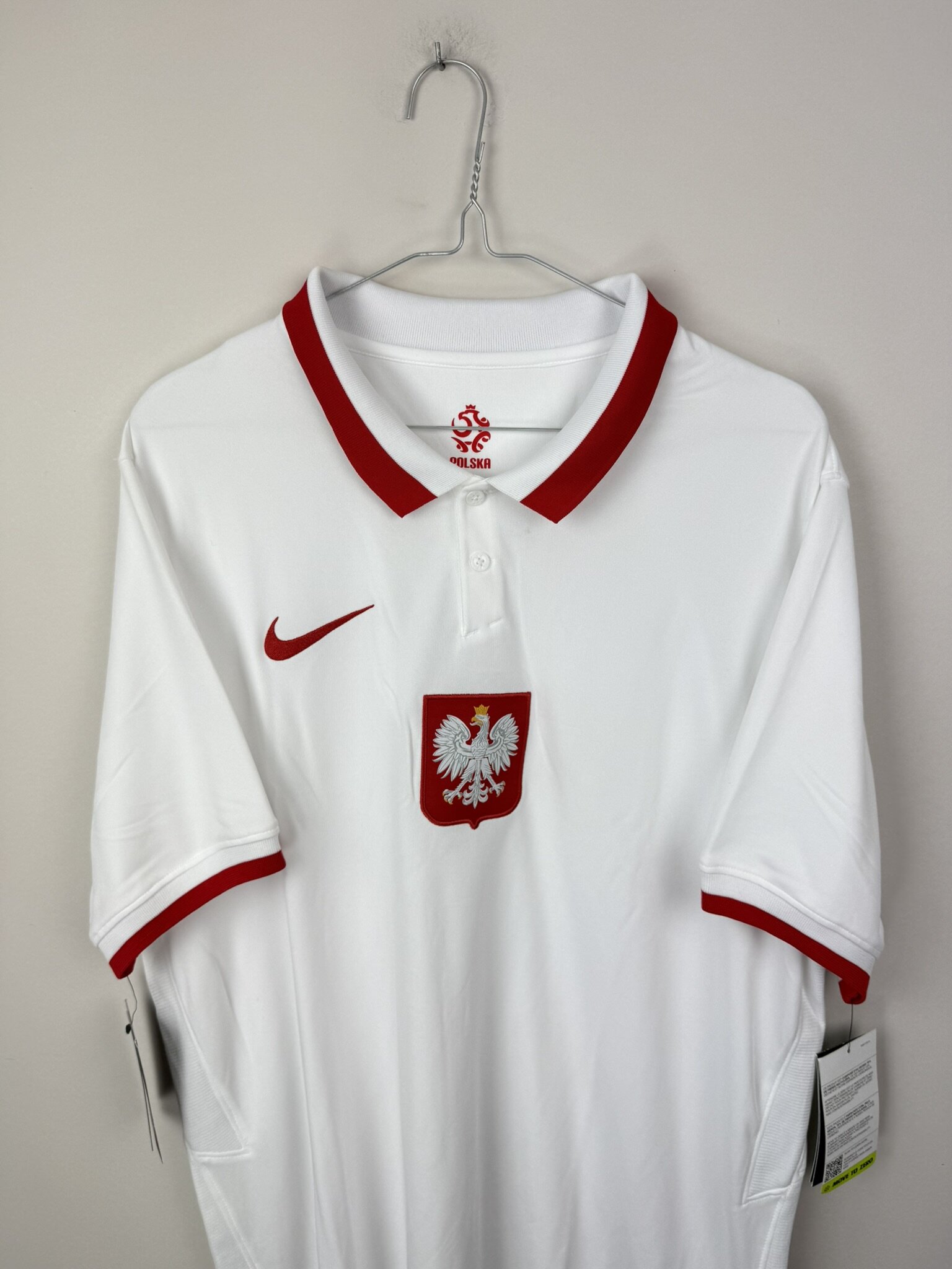Co istotne, koszulka jest zachowana w stanie nowym, z kompletem metek sklepowych, co czyni ją wyjątkową pozycją w każdej kolekcji. To doskonała okazja dla każdego, kto chce posiadać część historii polskiego futbolu, a jednocześnie cieszyć się produktem w idealnym stanie.