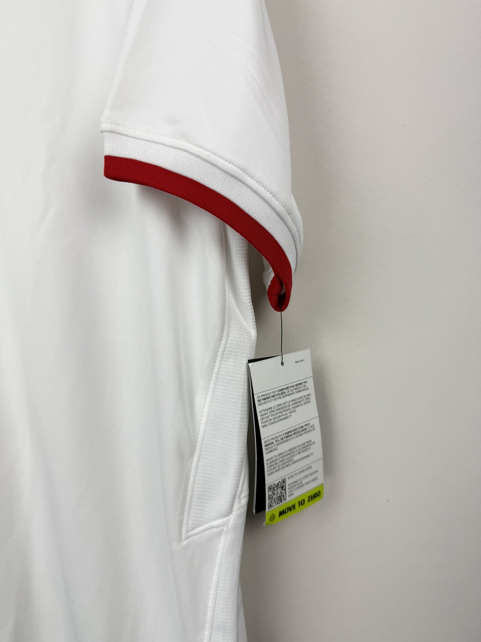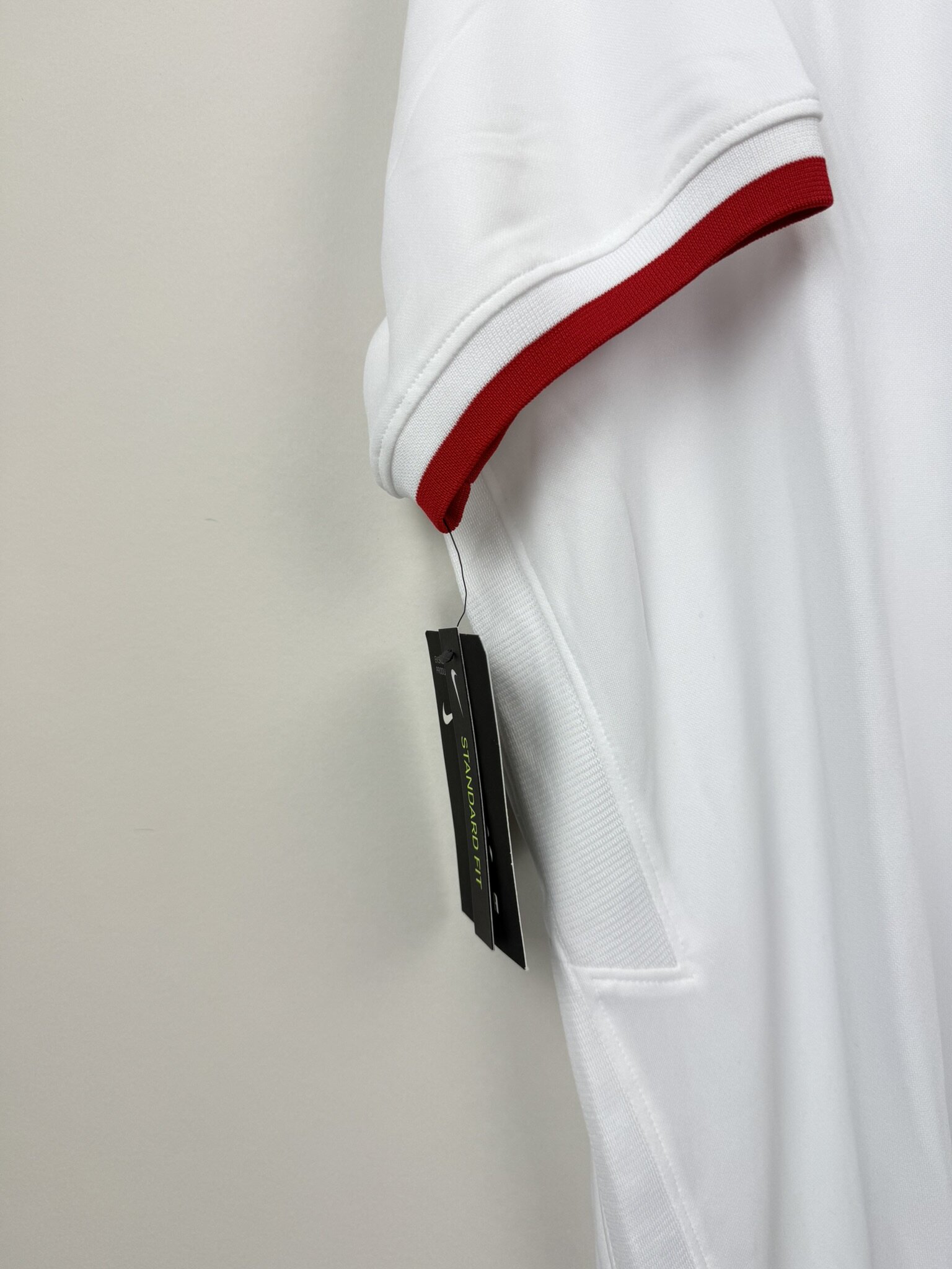 Koszulka została zaprezentowana w minimalistycznym, ale eleganckim stylu, z czerwonym kołnierzykiem i czerwonymi akcentami na końcówkach rękawów, które nadają jej subtelnego sportowego charakteru. Herb Polski, czyli biały orzeł, umieszczony jest centralnie na piersi, co podkreśla dumę narodową i symbolizuje przynależność do reprezentacji kraju. Na prawej piersi znajduje się logo Nike, co stanowi gwarancję jakości i autentyczności produktu.