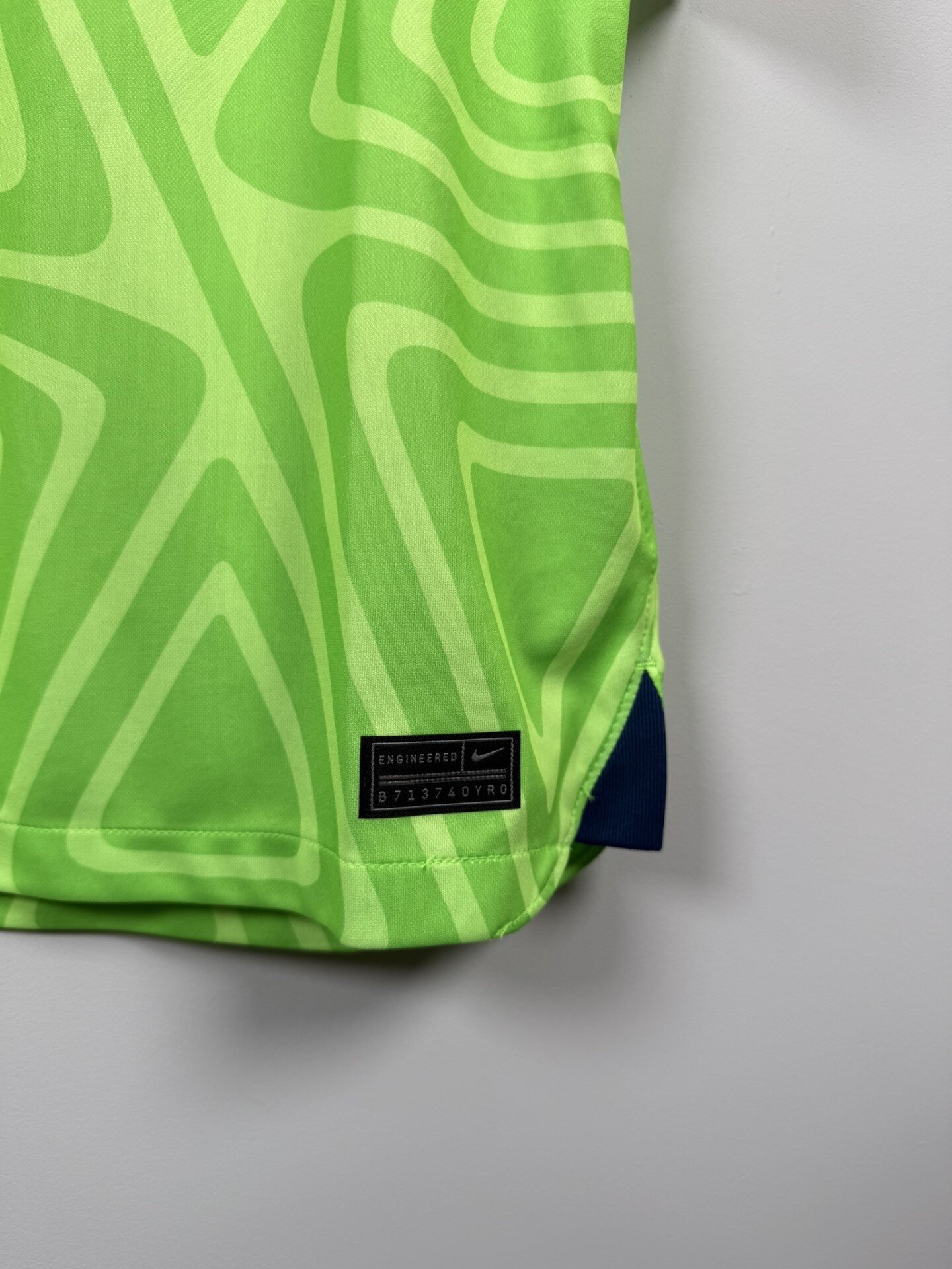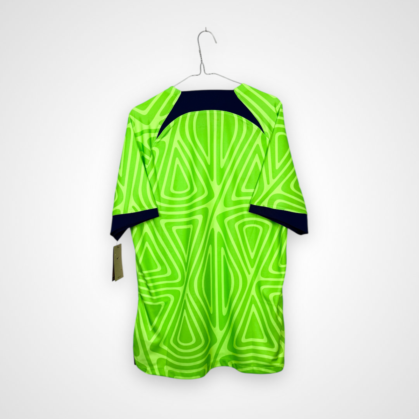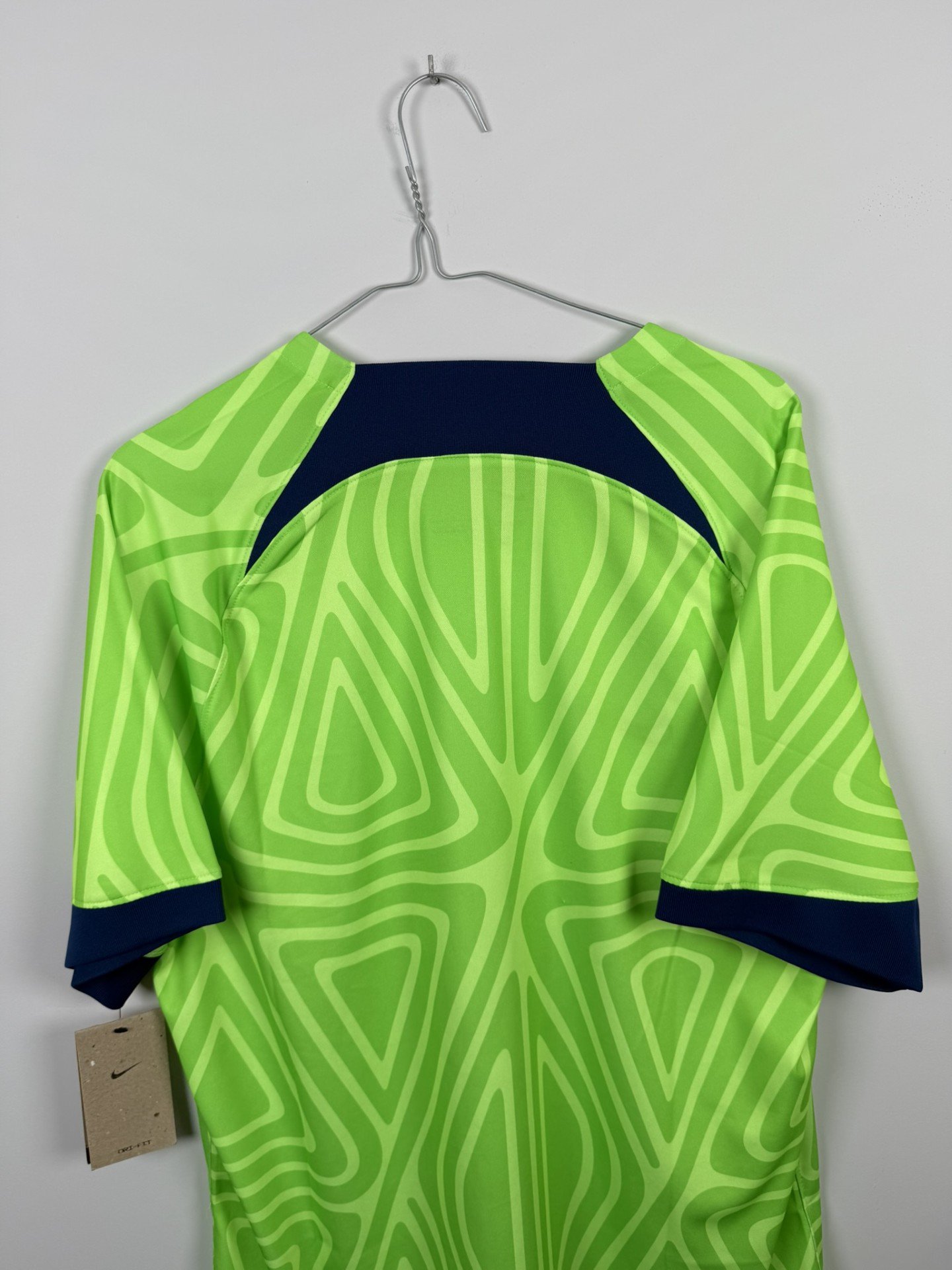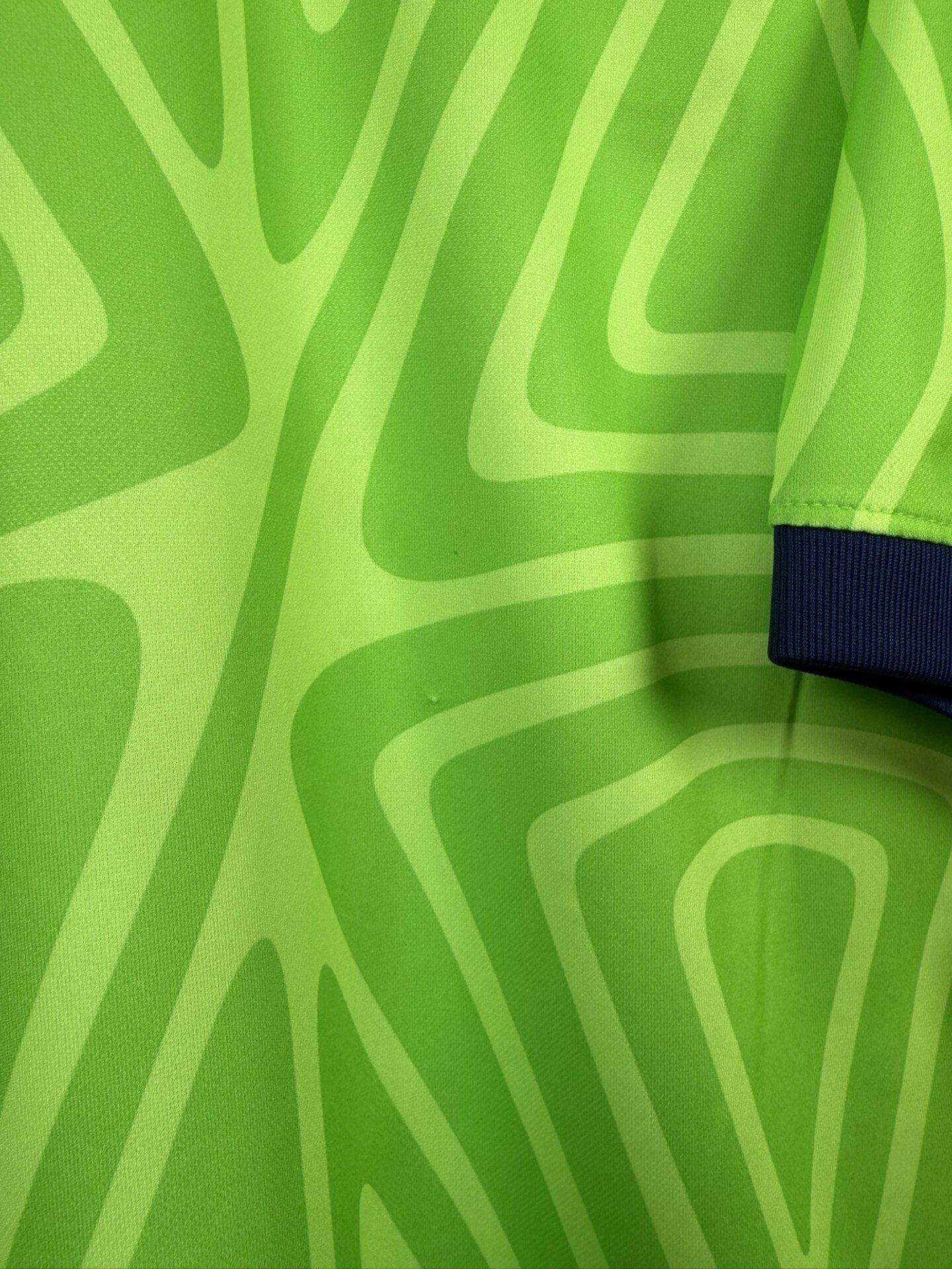 Ta oryginalna domowa koszulka VfL Wolfsburg z sezonu 2022/23 została zaprojektowana przez markę Nike i zachowała się w stanie fabrycznym, z metkami sklepowymi, co czyni ją jeszcze bardziej atrakcyjną dla kolekcjonerów. Utrzymana w charakterystycznej dla „Wilków” jasnozielonej kolorystyce, wyróżnia się nowoczesnym wzorem na materiale, podkreślającym dynamiczny styl klubu.