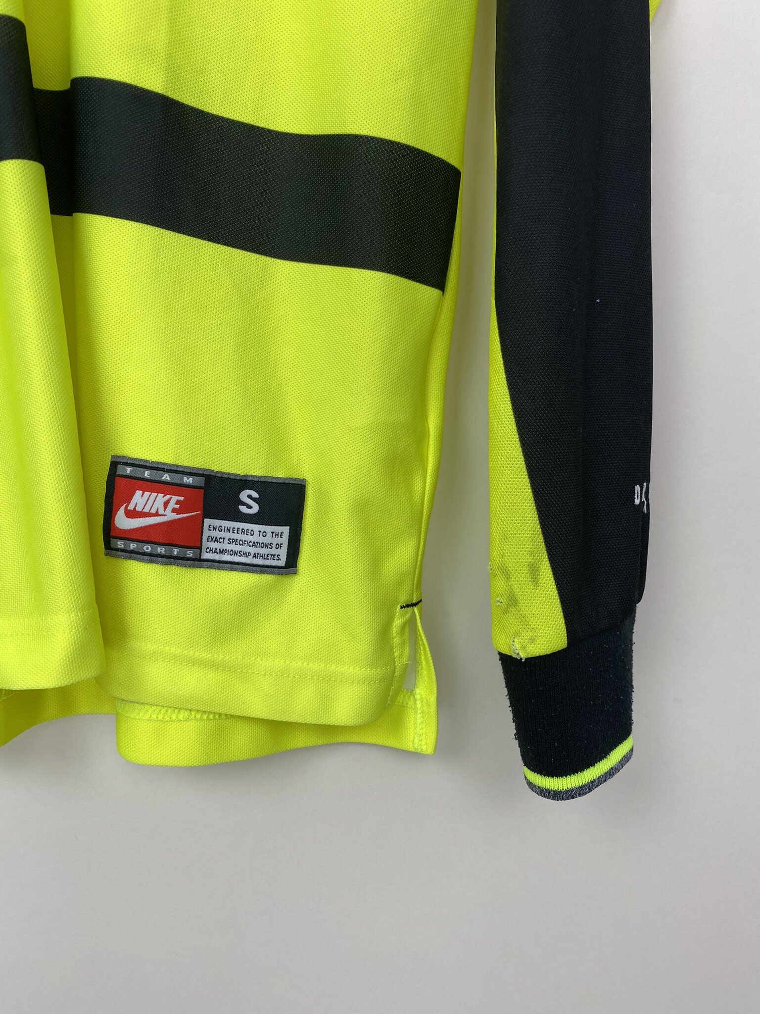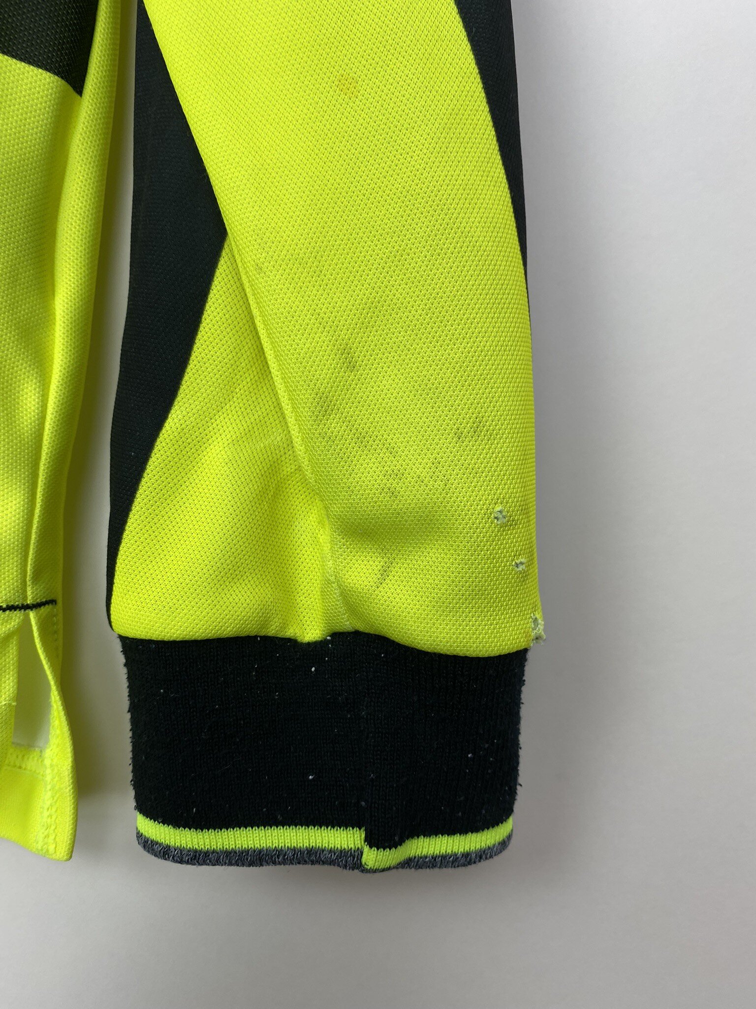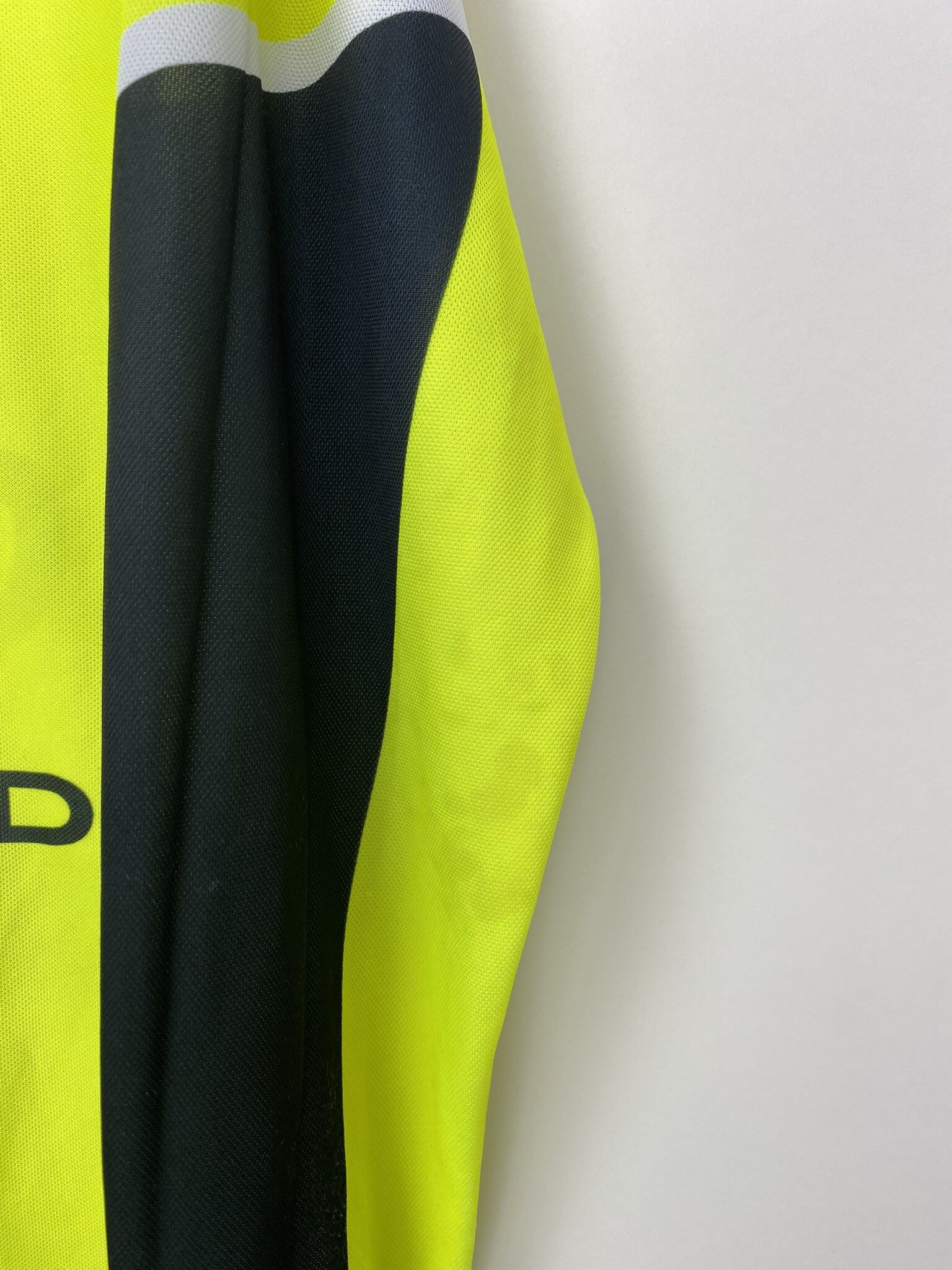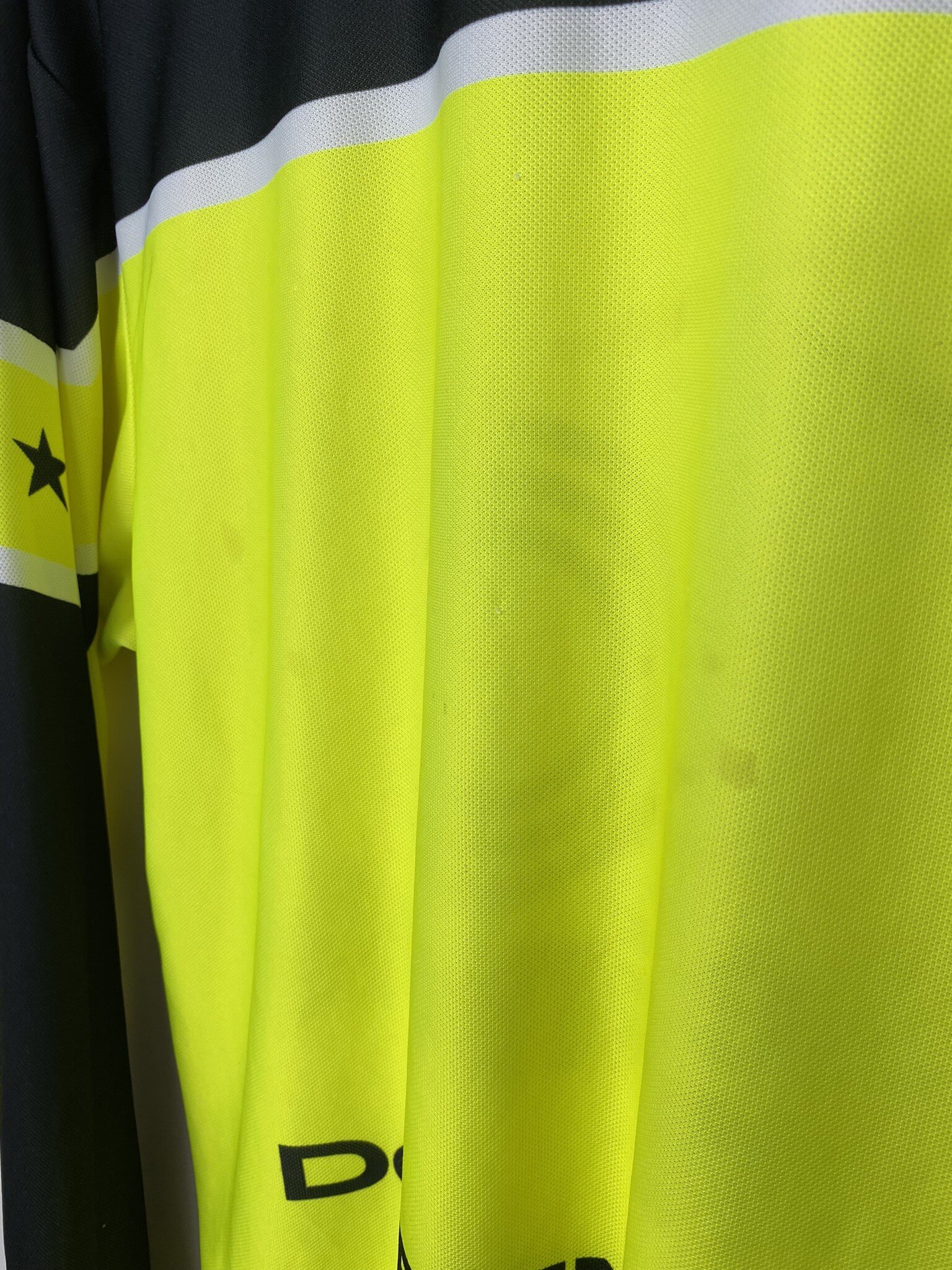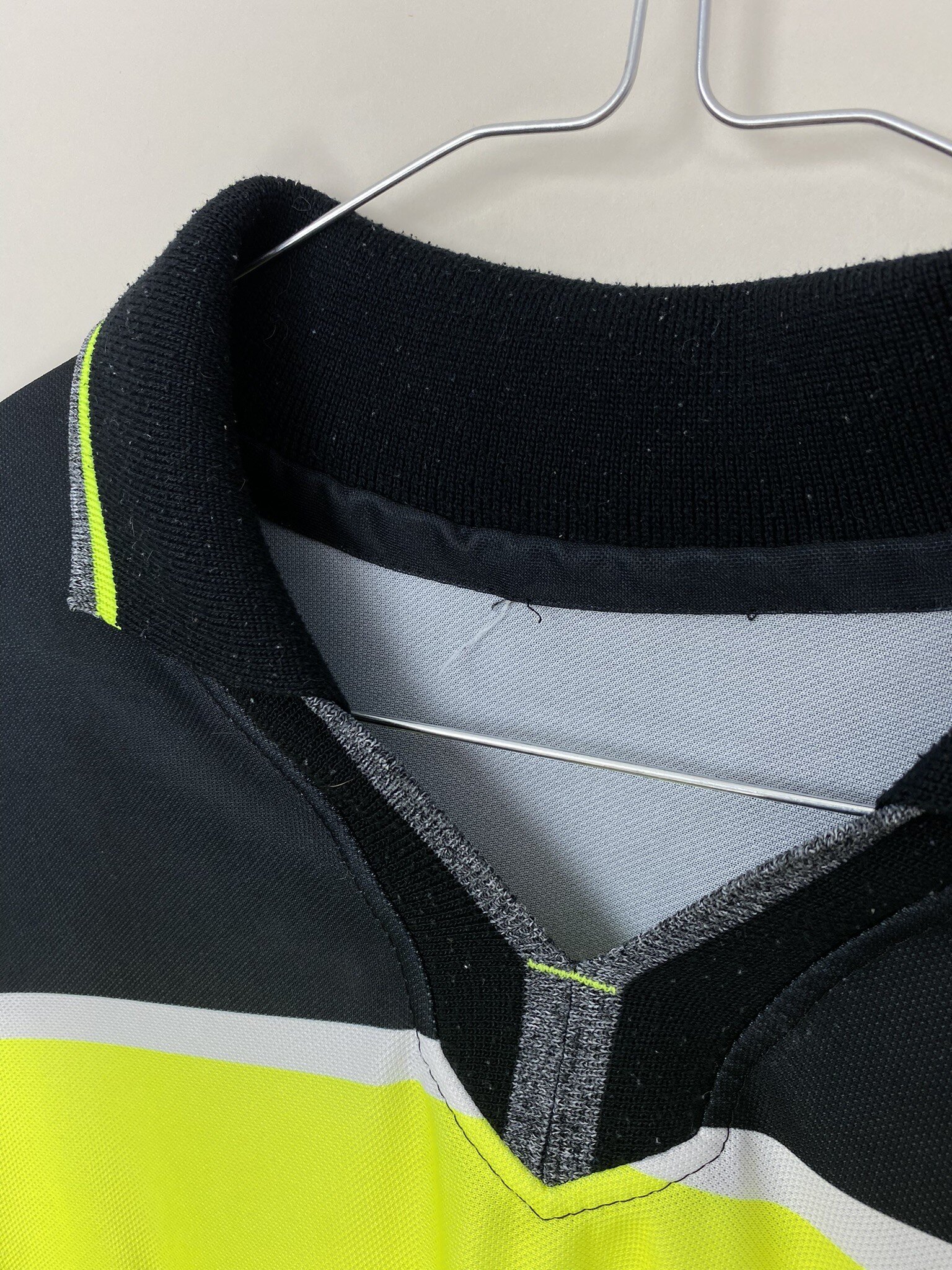 Stan: Słaby – na powierzchni koszulki występują plamy, końcówka jednego rękawa jest zabrudzona oraz zniszczona, a metka z rozmiarem jest ucięta.