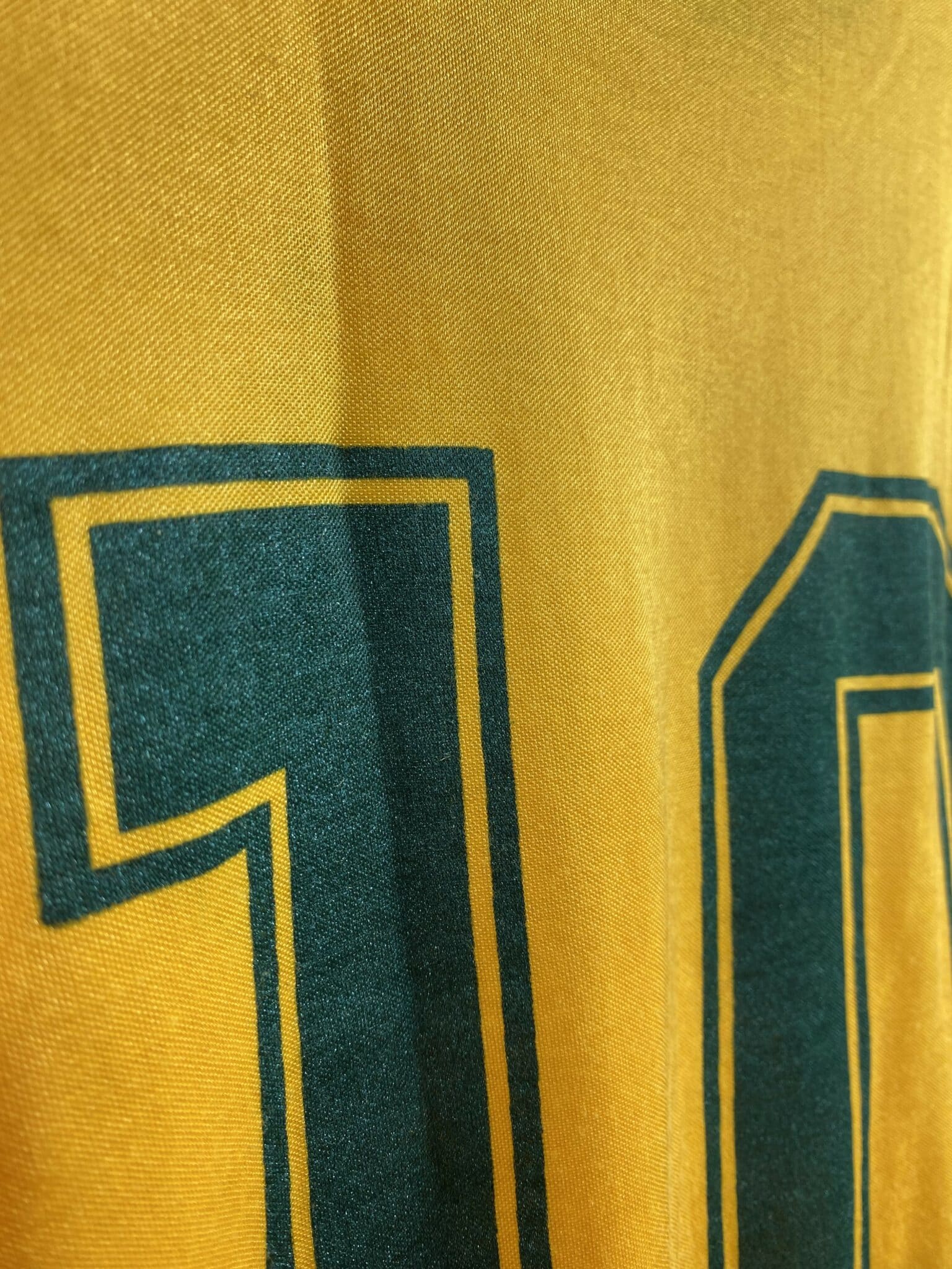 Ta wyjątkowa koszulka Brazylii 1981/82 utrzymana jest w klasycznych żółto-zielonych barwach Canarinhos, które od lat stanowią symbol stylu i tradycji brazylijskiej piłki. Na plecach widnieje legendarny numer 10, w którym w tamtym okresie występował Zico – jeden z największych piłkarzy w historii futbolu, znany ze swojej techniki, wizji gry i skuteczności w ataku.