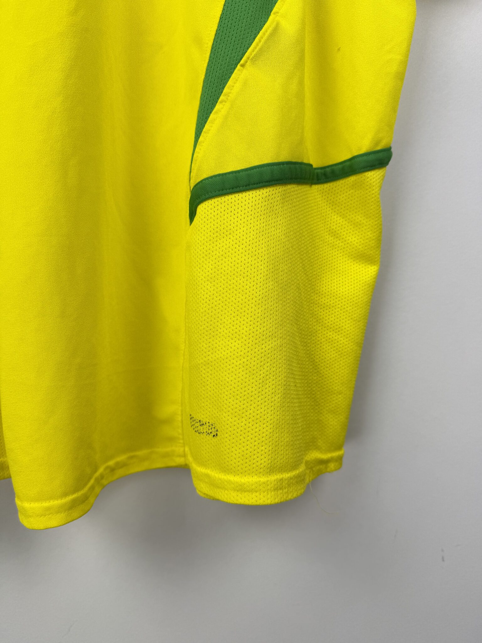 Ta oryginalna domowa koszulka reprezentacji Brazylii z lat 2002–2004 to kultowy model wyprodukowany przez Nike, który towarzyszył „Canarinhos” podczas jednego z najbardziej pamiętnych okresów w historii brazylijskiego futbolu. Utrzymana w klasycznym, intensywnie żółtym kolorze z zielonymi wstawkami na rękawach i kołnierzyku, koszulka odzwierciedla ikoniczne barwy narodowe Brazylii. Na plecach widnieje numer 9, który w tamtym okresie nosił sam Ronaldo Luís Nazário de Lima – legenda światowego futbolu i bohater mundialu w Korei i Japonii.