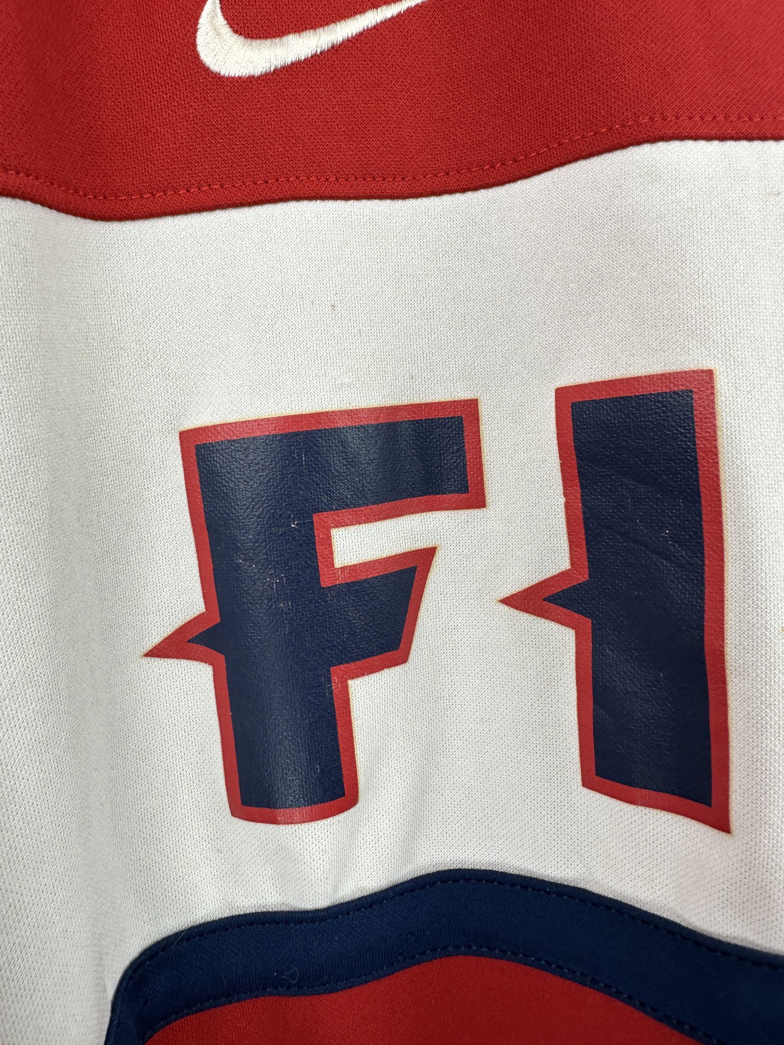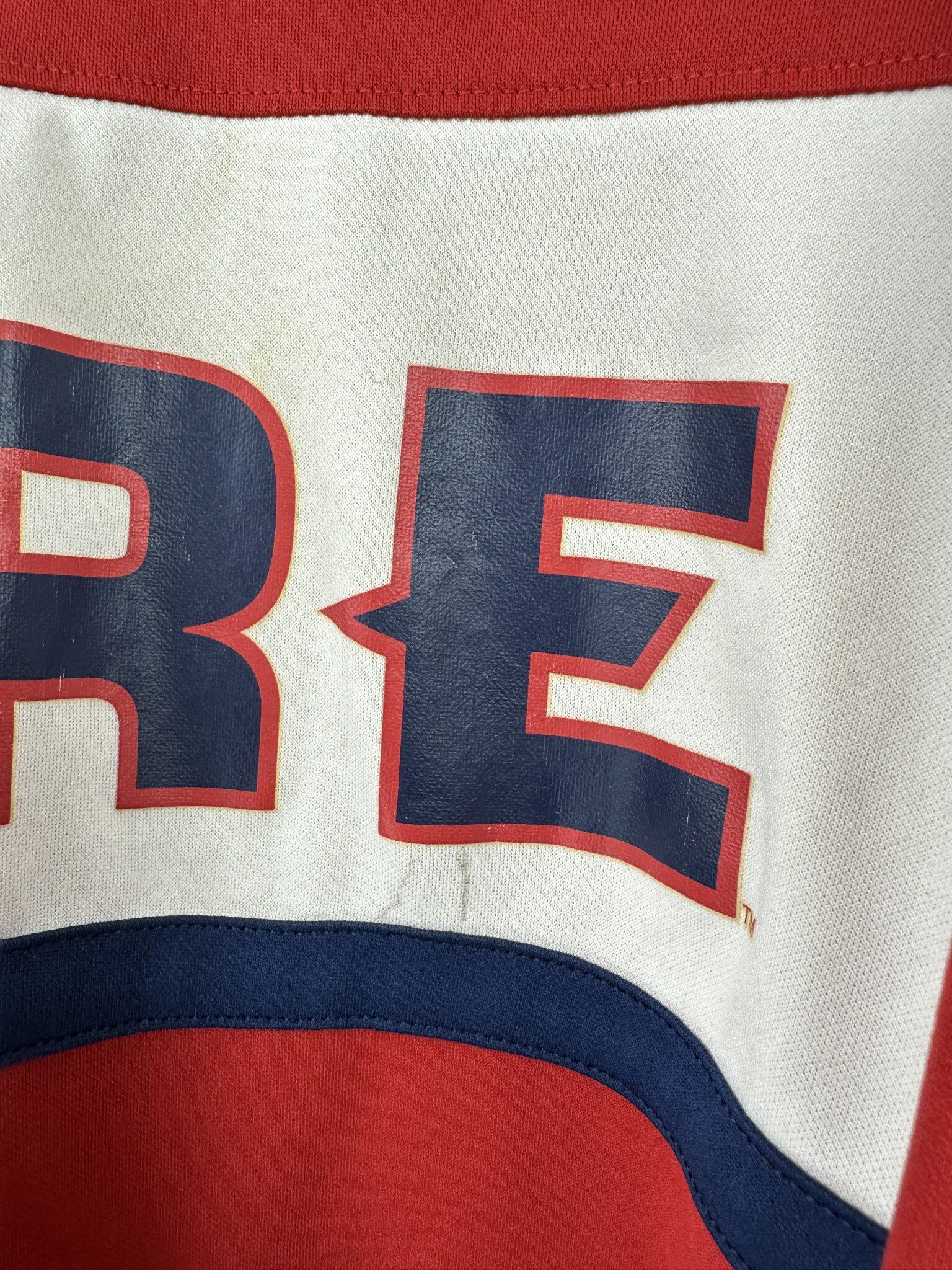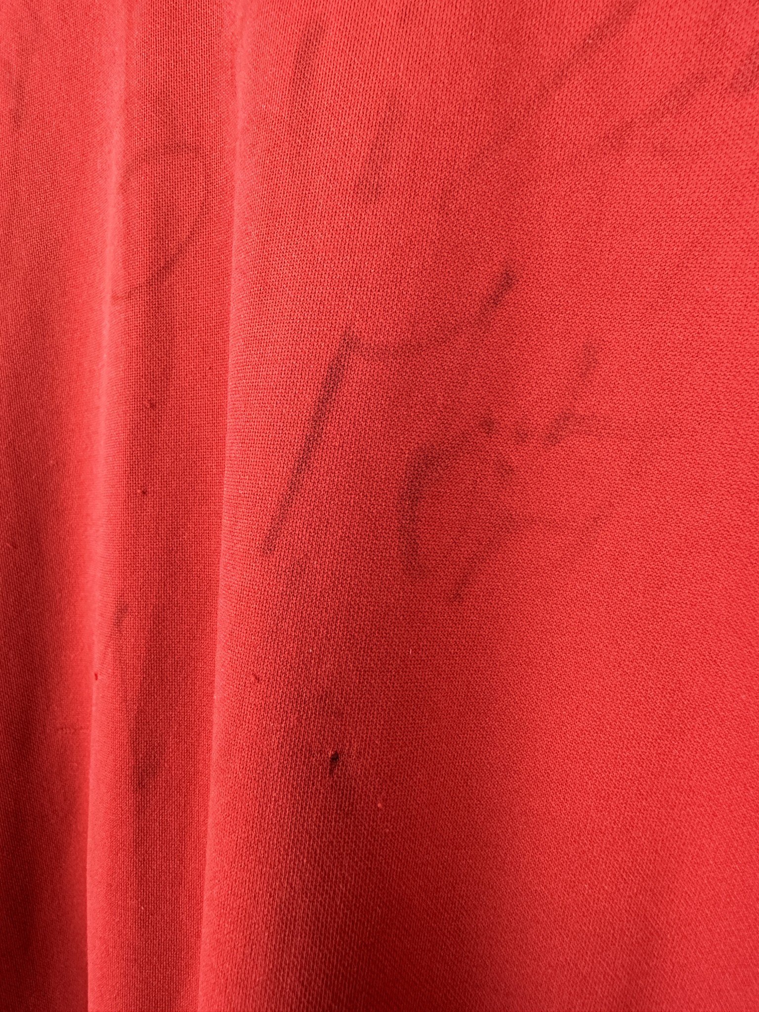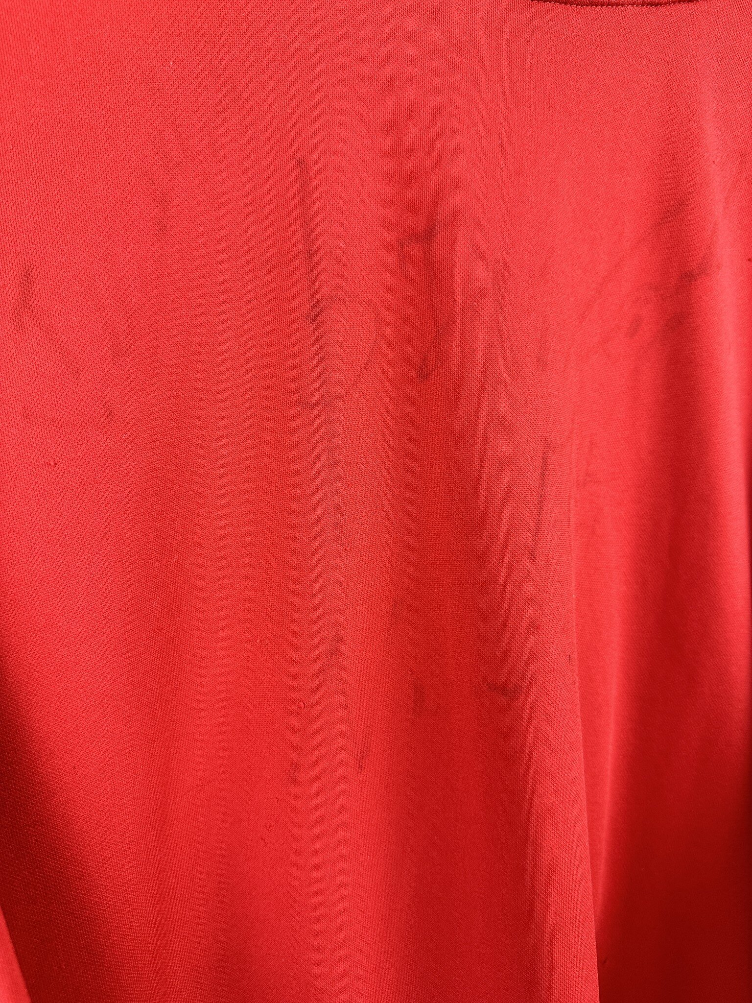 Stan: Zadowalający – popękany i zabrudzony nadruk sponsora na froncie, kilka niewielkich zaciągnięć, mikro dziurka na plecach oraz ślad po niezidentyfikowanym autografie na plecach.