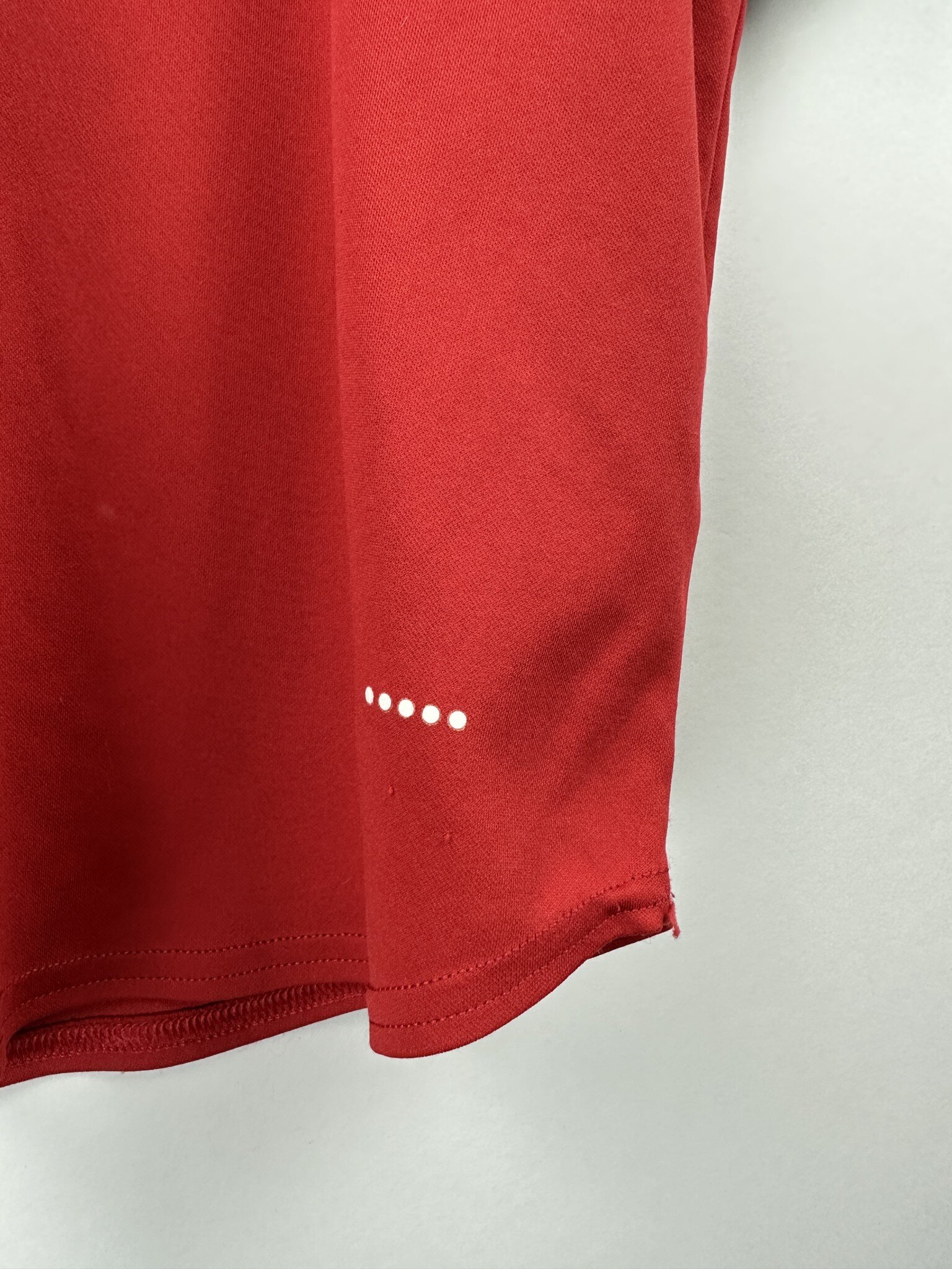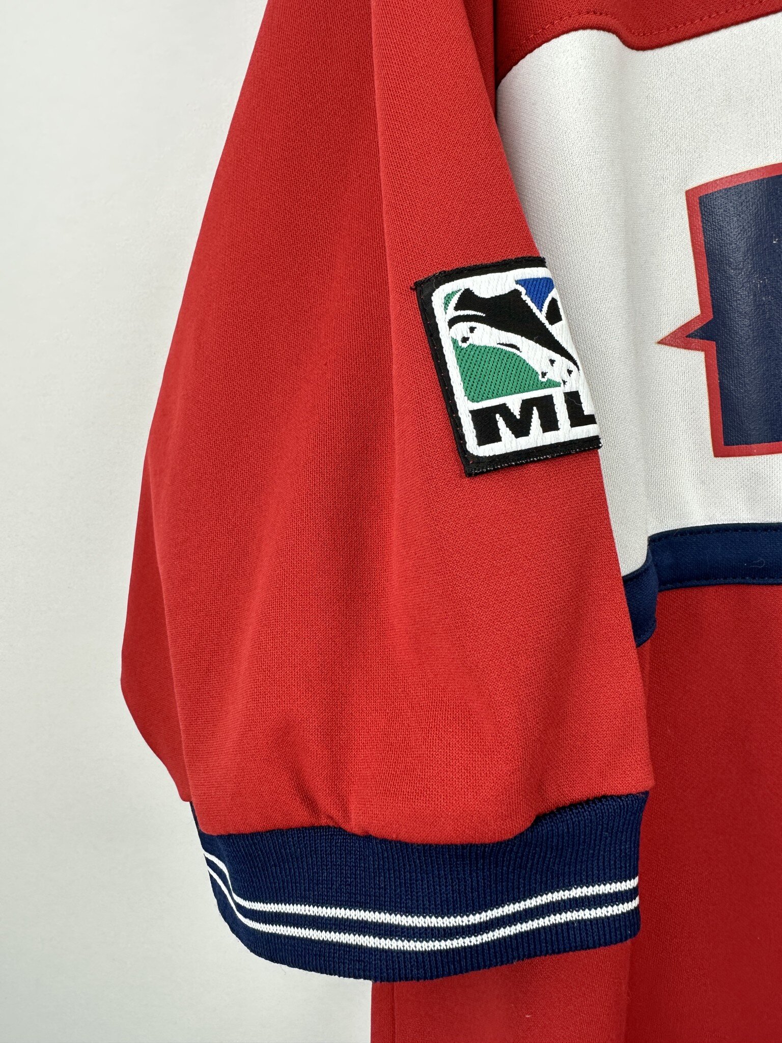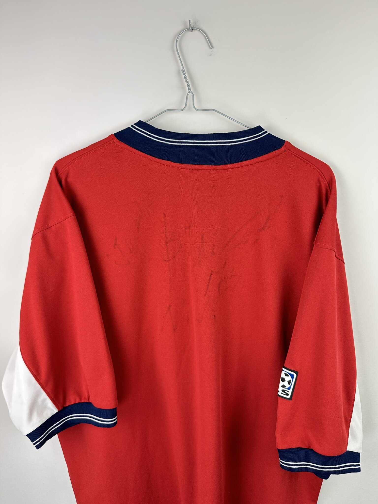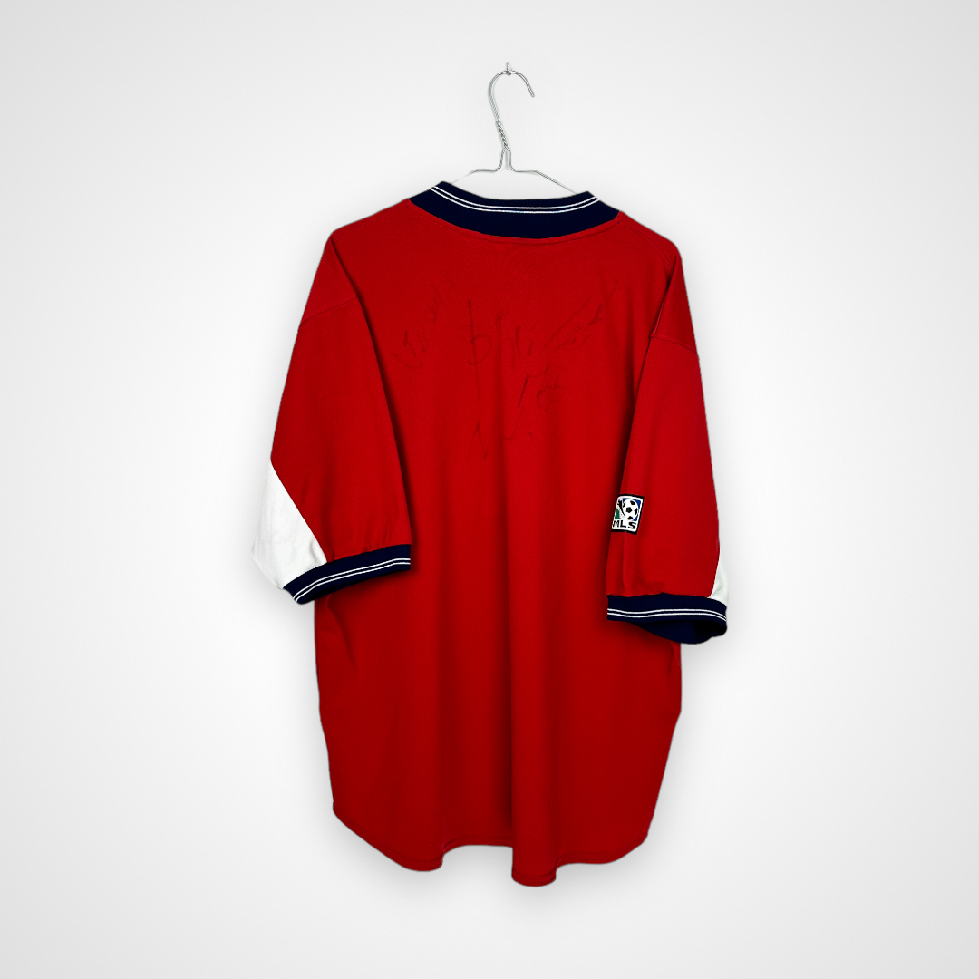 Stan: Zadowalający – popękany i zabrudzony nadruk sponsora na froncie, kilka niewielkich zaciągnięć, mikro dziurka na plecach oraz ślad po niezidentyfikowanym autografie na plecach.
