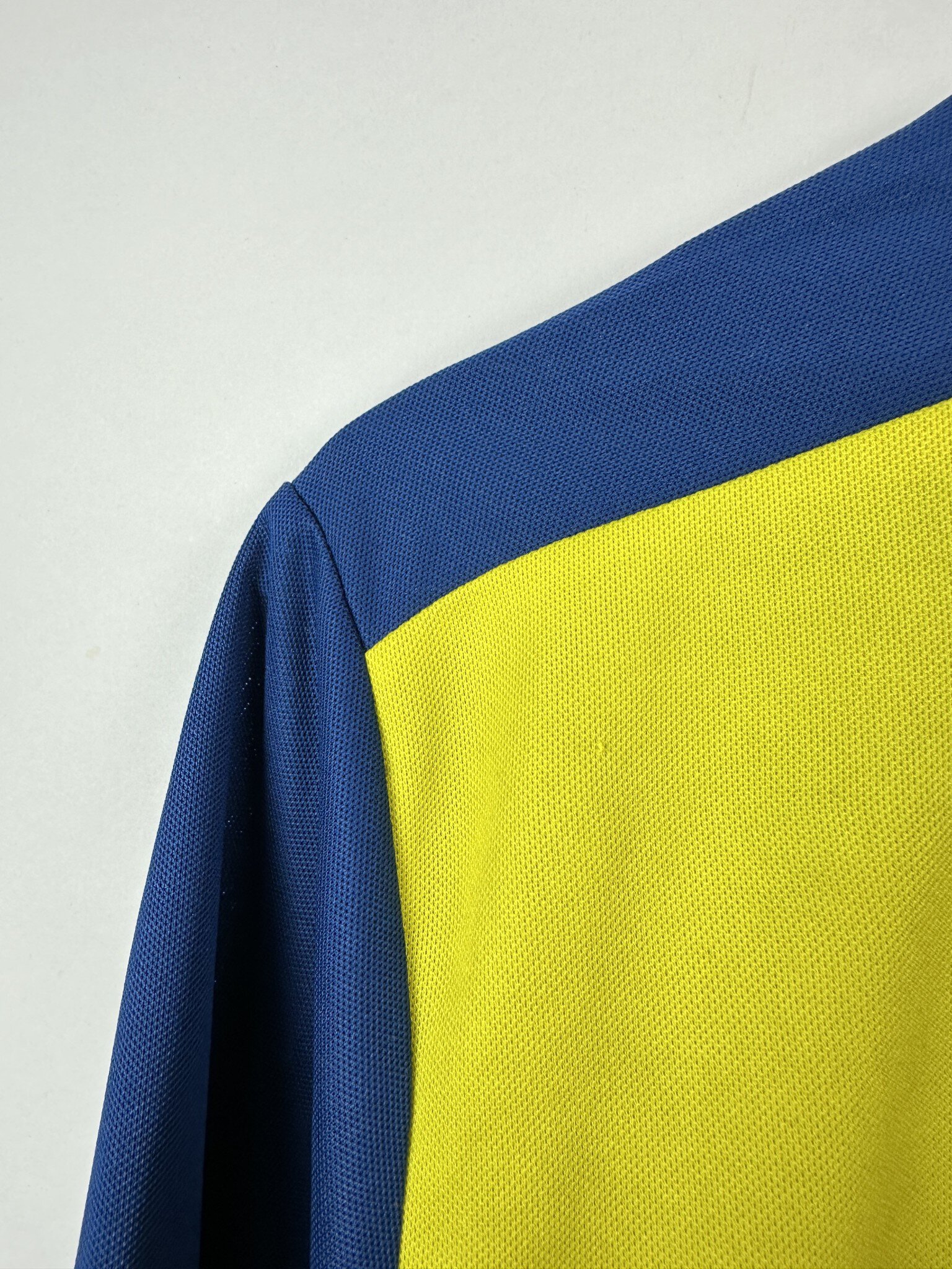 Stan: Zadowalający – zmarszczone cyfry na plecach, materiał stracił mocno swój naturalny kolor, oraz mikro zaciągnięcie i zabrudzenie na plecach.