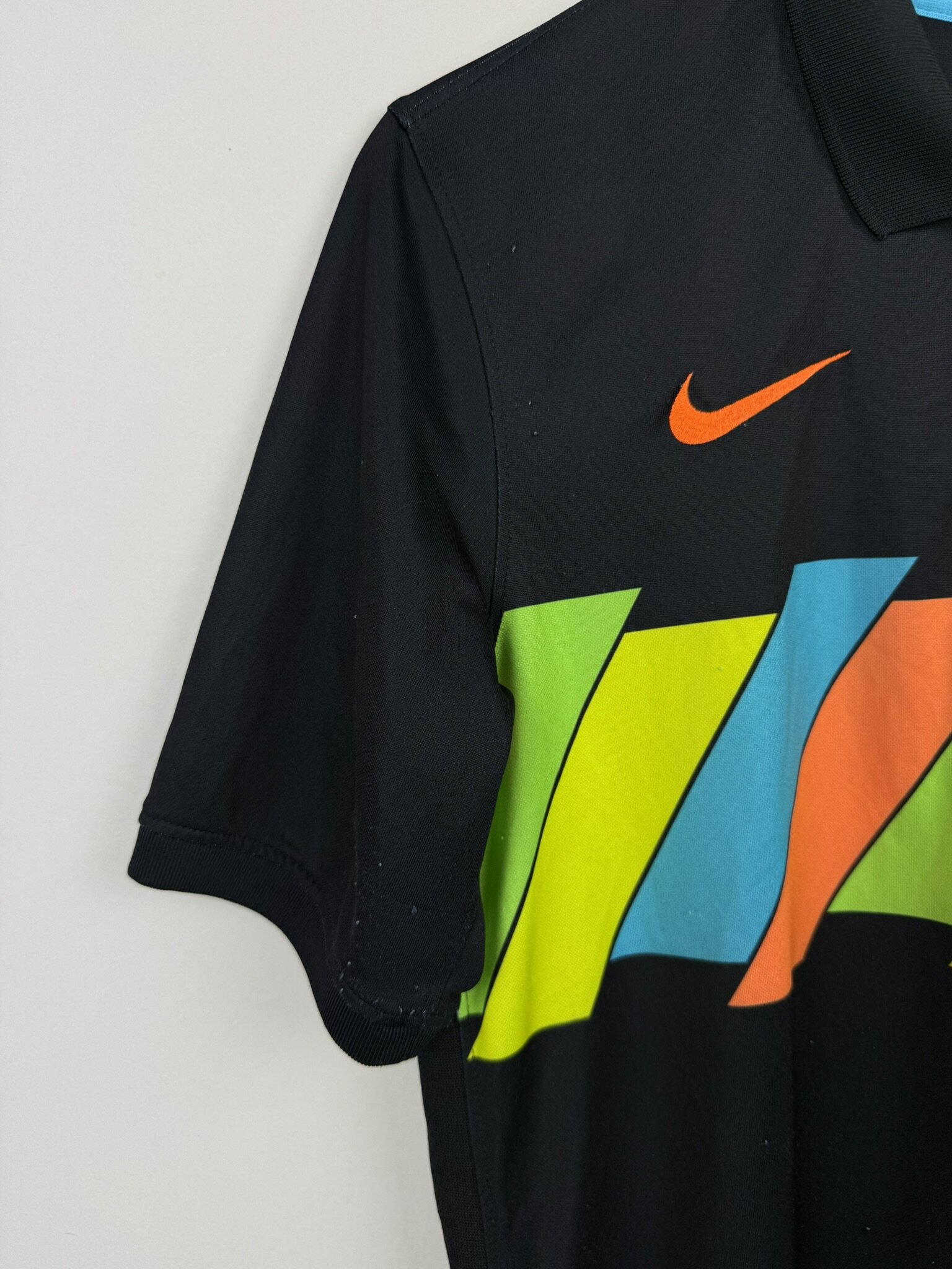 Ta oryginalna koszulka piłkarska Interu Mediolan z sezonu 2021/22 to oficjalny model trzeciego kompletu meczowego, wyprodukowany przez firmę Nike w rozmiarze młodzieżowym na 164 cm wzrostu. To wyjątkowy projekt, który wyróżnia się nowoczesnym i odważnym designem – koszulka posiada czarną bazę, na której umieszczono kolorowe, skośne paski. Ten geometryczny wzór nadaje całości dynamicznego i futurystycznego charakteru, idealnie wpisując się w koncepcję nowoczesnej identyfikacji wizualnej klubu.