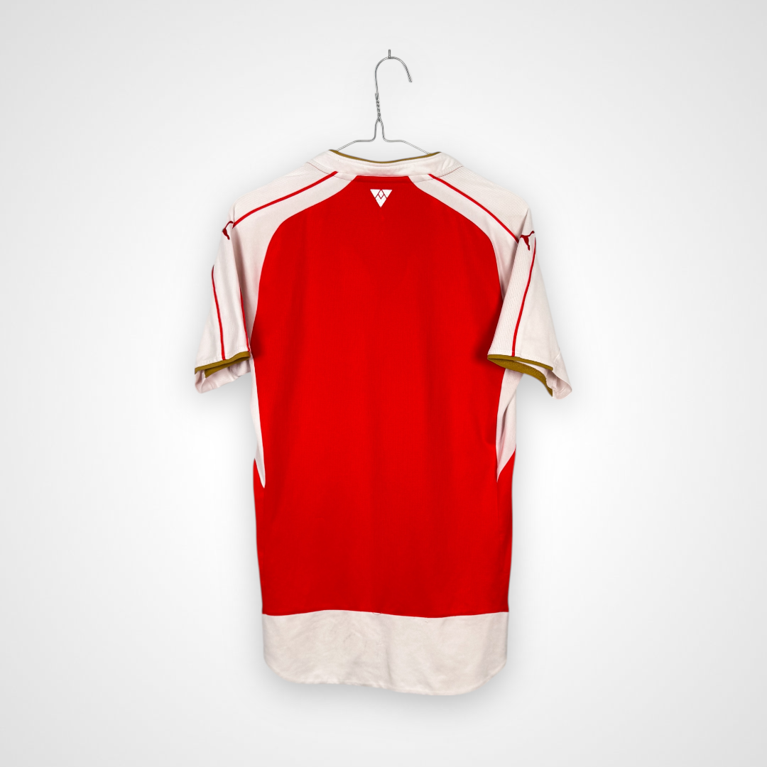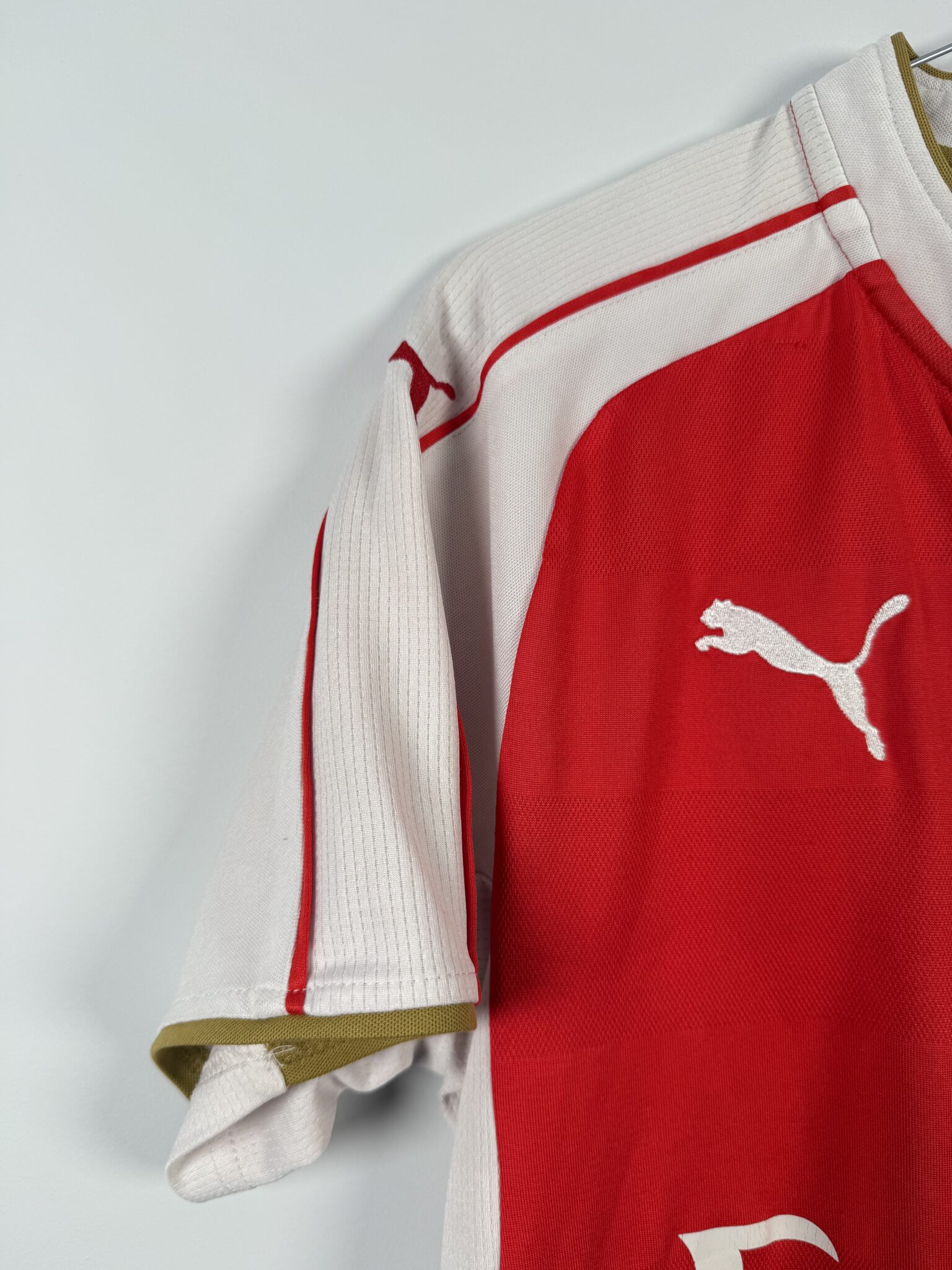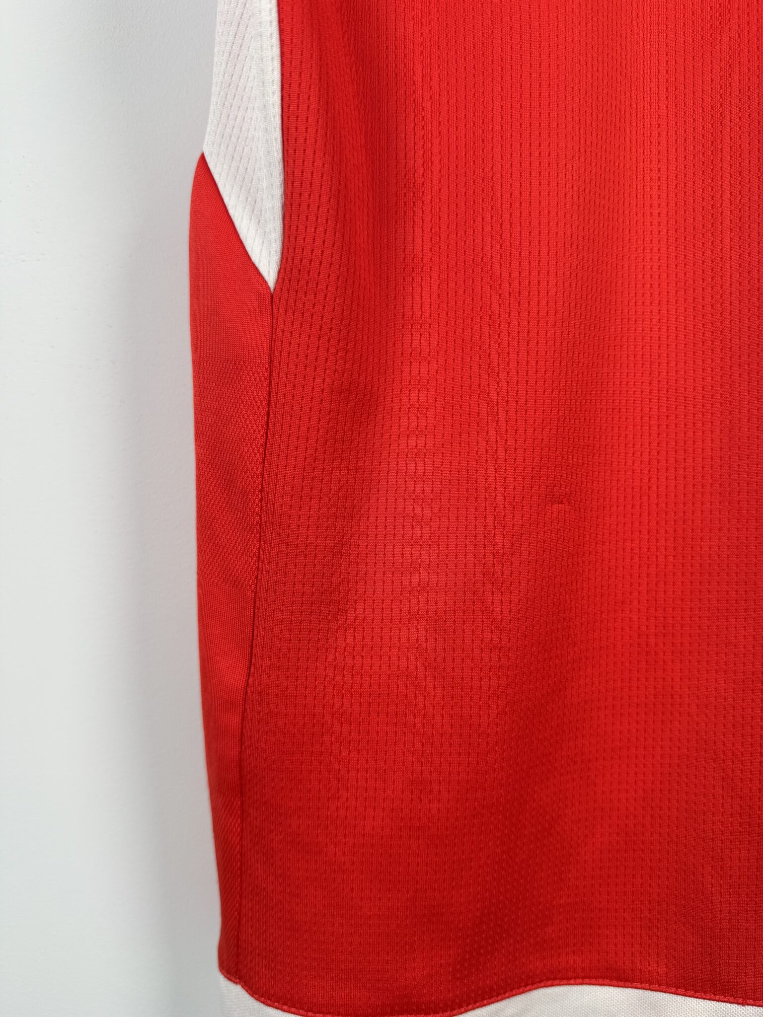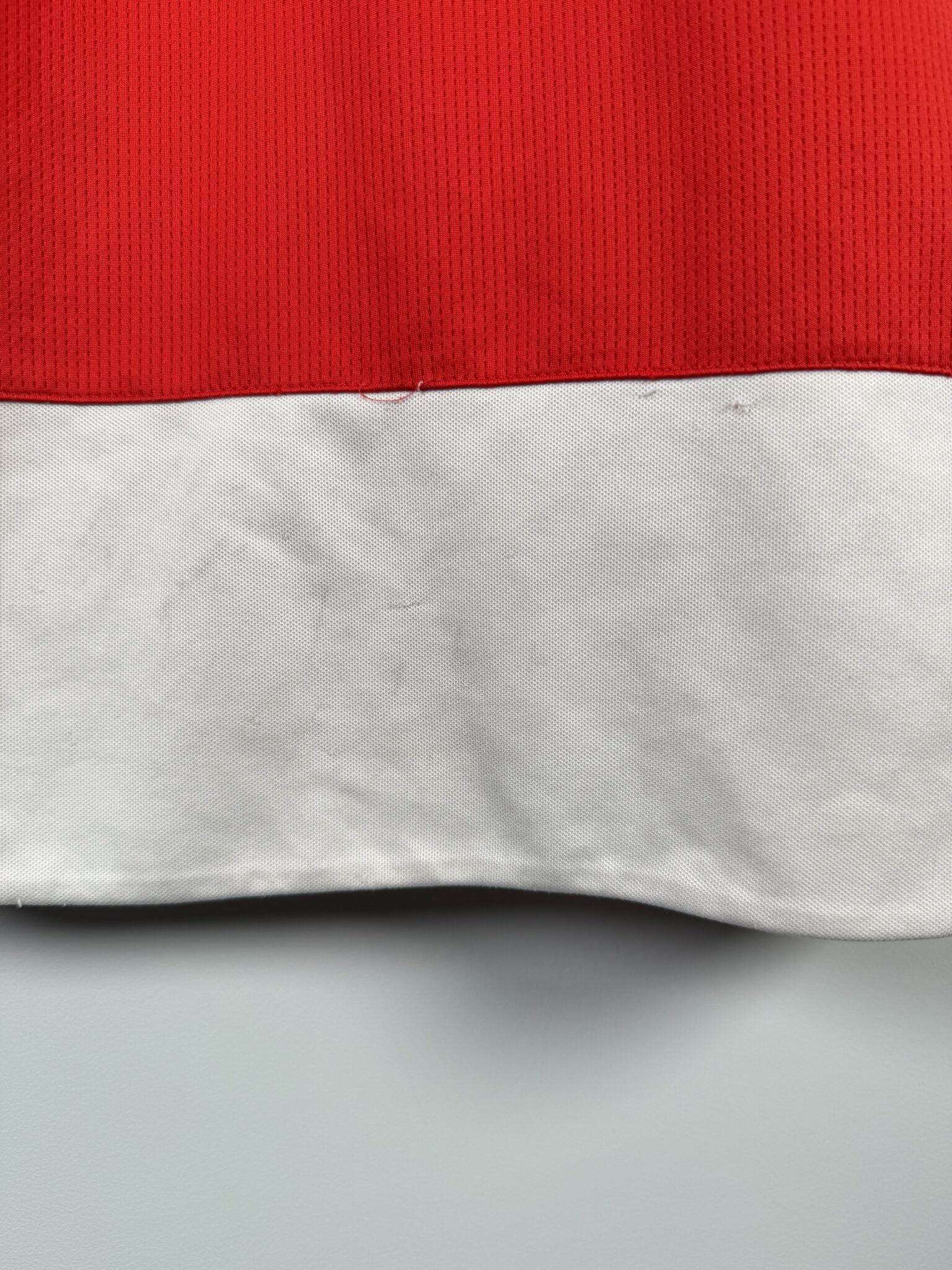 Ta oryginalna domowa koszulka Arsenal FC z sezonu 2015/16, wyprodukowana przez Pumę, to elegancki model w klasycznych czerwono-białych barwach „The Gunners”. Projekt wyróżnia się nowoczesnym krojem z subtelnymi złotymi detalami oraz charakterystycznym białym panelem na rękawach i ramionach, które dodają koszulce wyjątkowej estetyki.