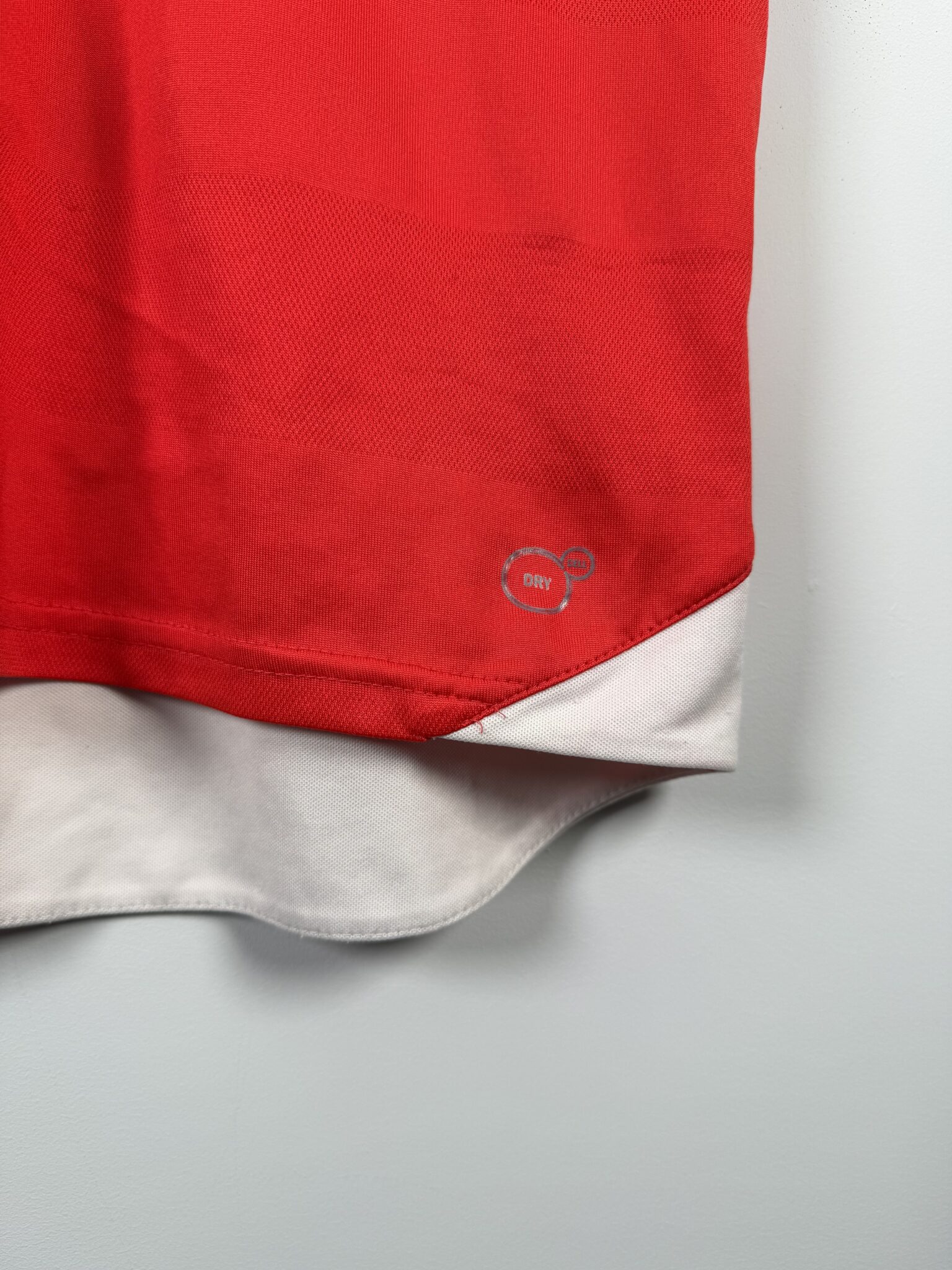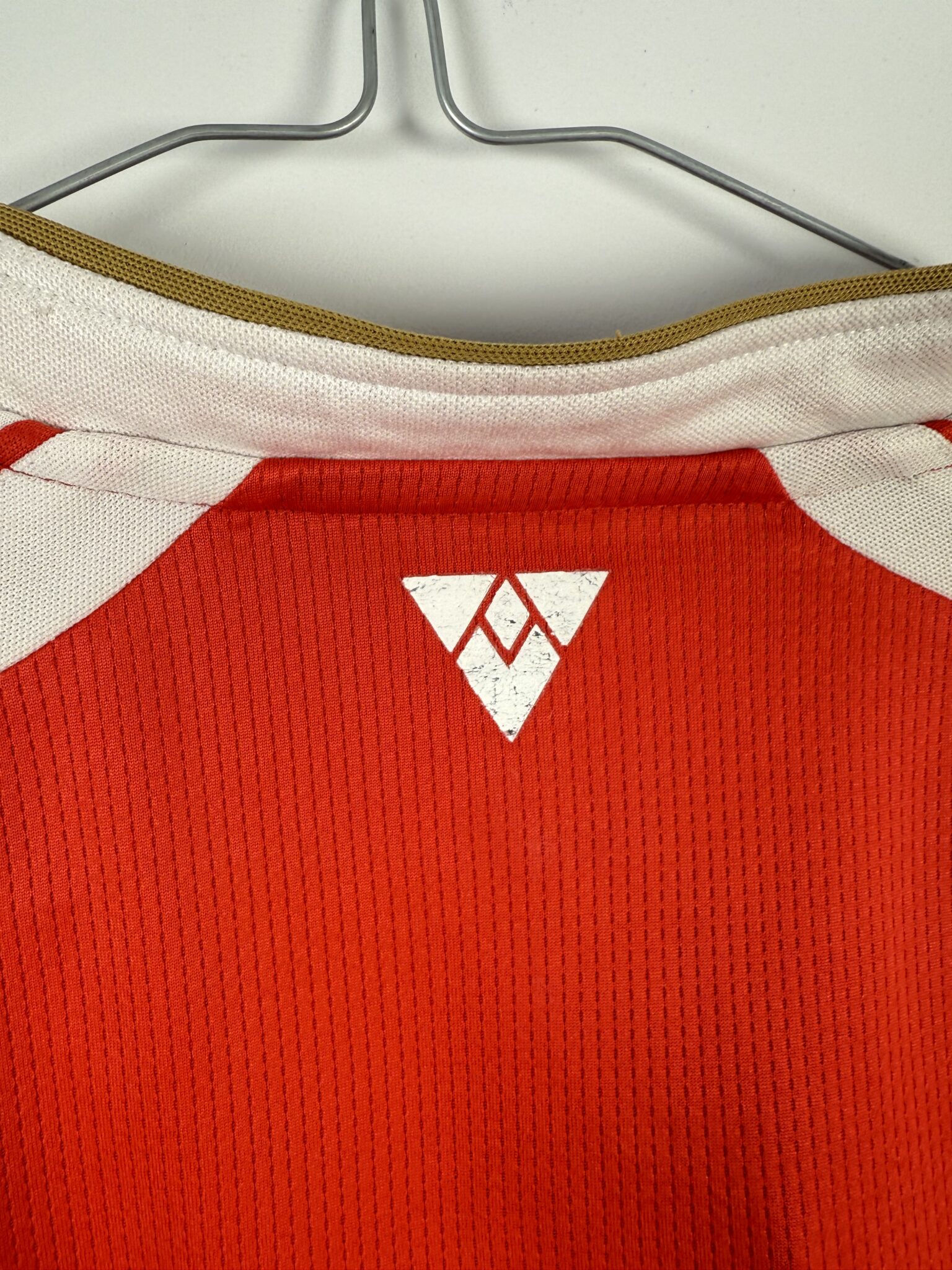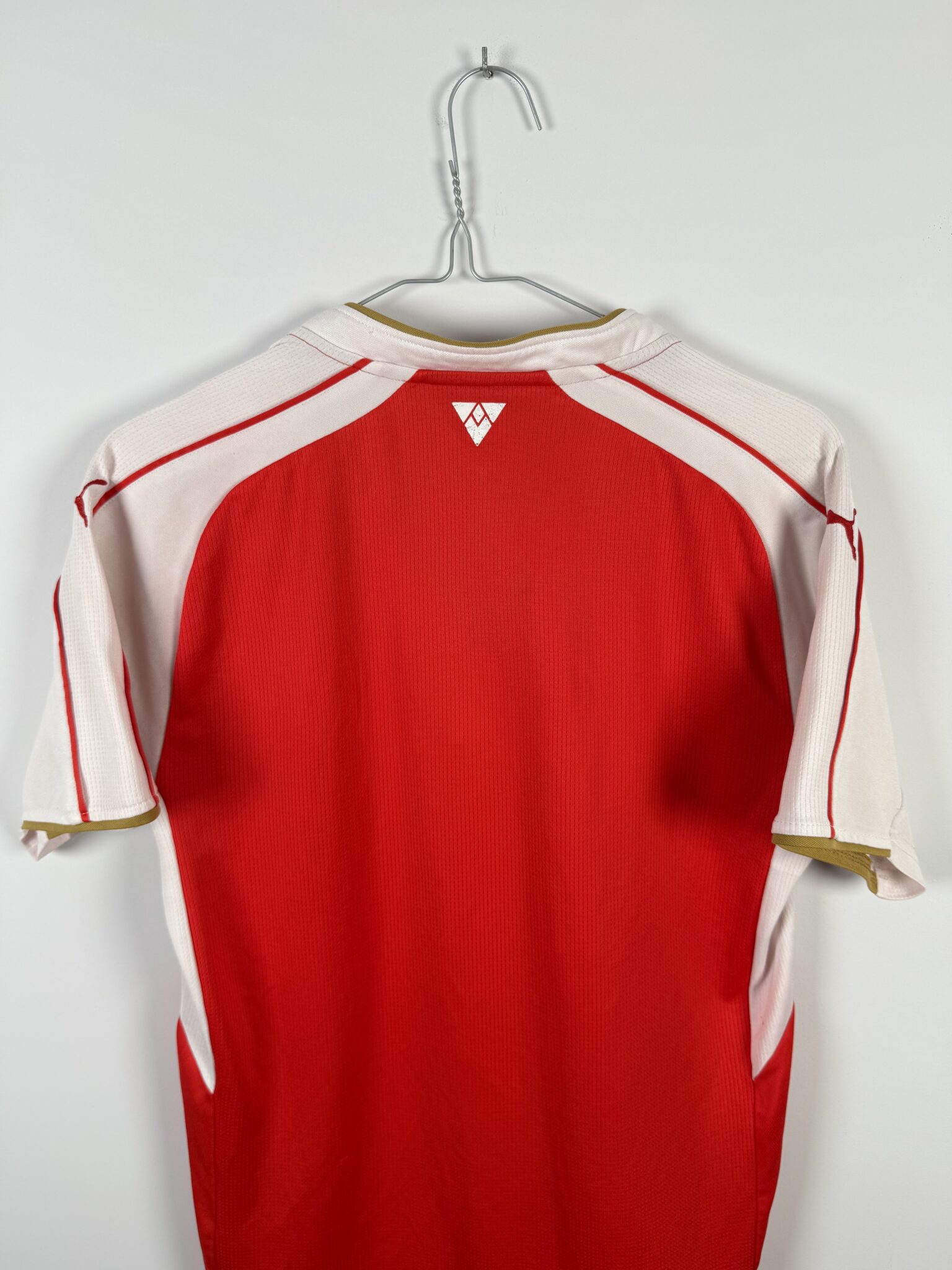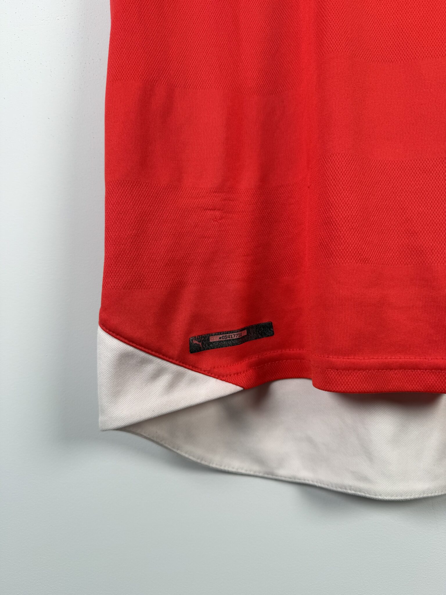 Ta oryginalna domowa koszulka Arsenal FC z sezonu 2015/16, wyprodukowana przez Pumę, to elegancki model w klasycznych czerwono-białych barwach „The Gunners”. Projekt wyróżnia się nowoczesnym krojem z subtelnymi złotymi detalami oraz charakterystycznym białym panelem na rękawach i ramionach, które dodają koszulce wyjątkowej estetyki.