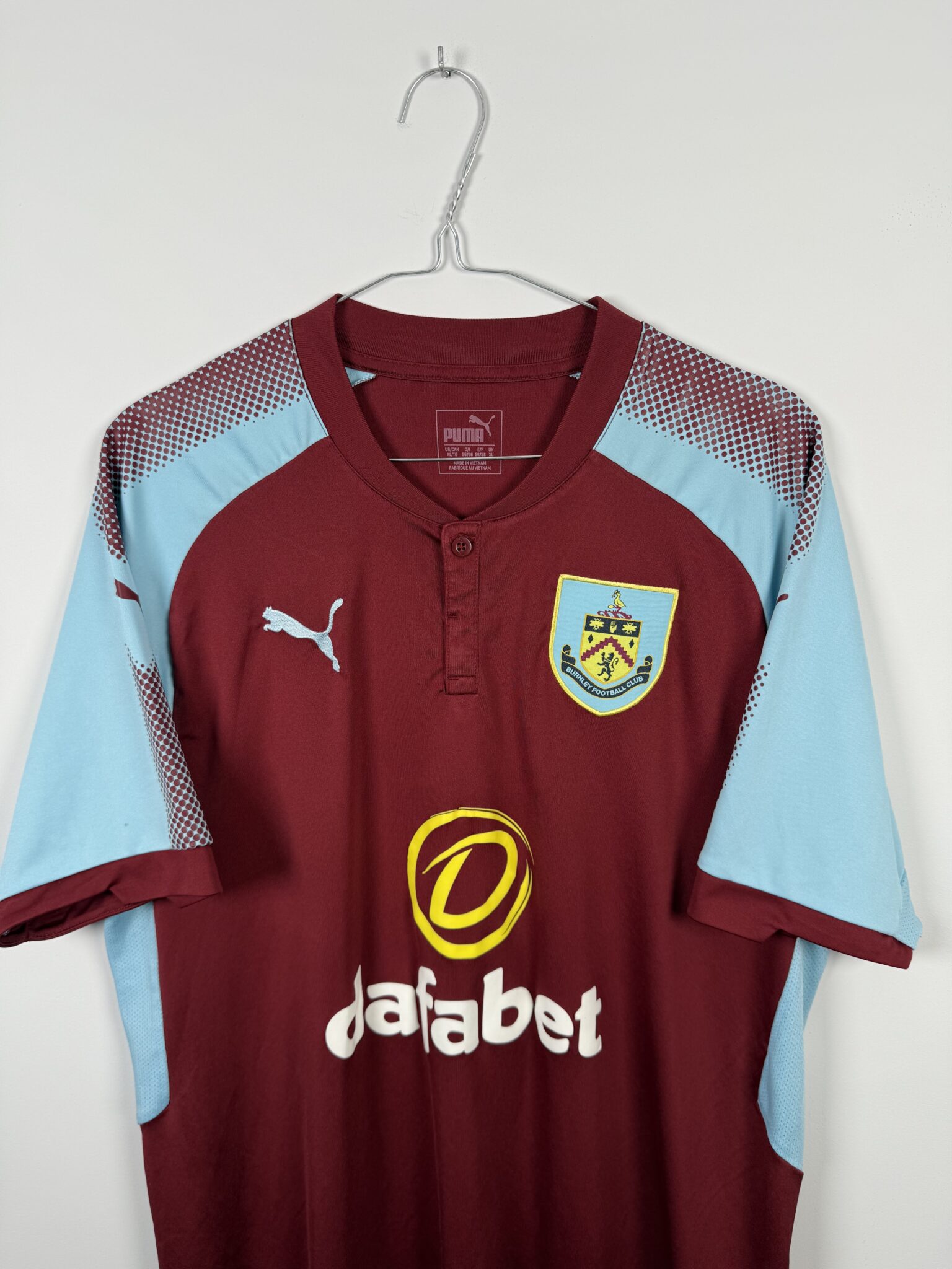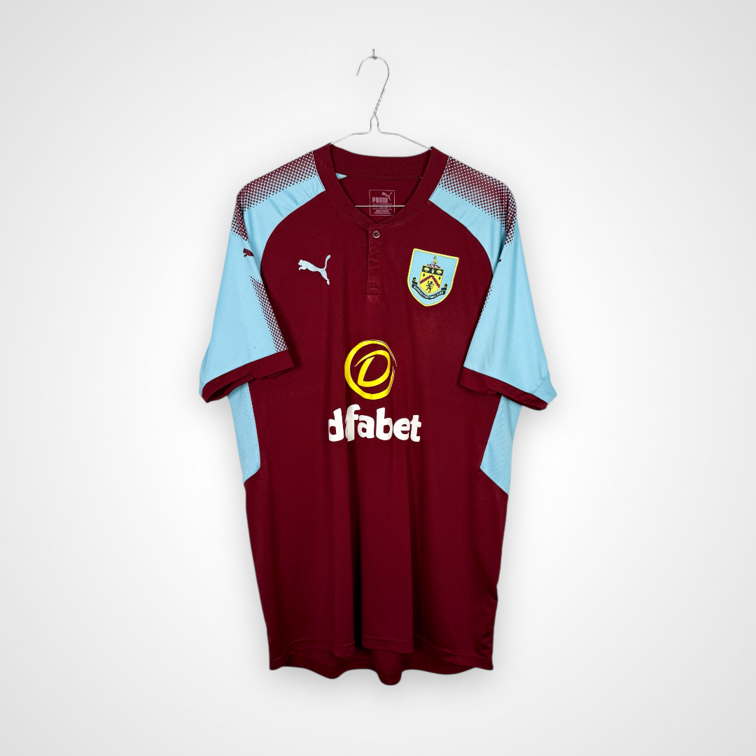 Na froncie koszulki umieszczono herb Burnley FC, logo Pumy oraz znak sponsora Dafabet, które tworzą charakterystyczny zestaw identyfikujący drużynę w tamtym sezonie. Wysokiej jakości materiał o właściwościach oddychających zapewniał zawodnikom komfort i wygodę, a dopasowany krój dodawał nowoczesnego charakteru.