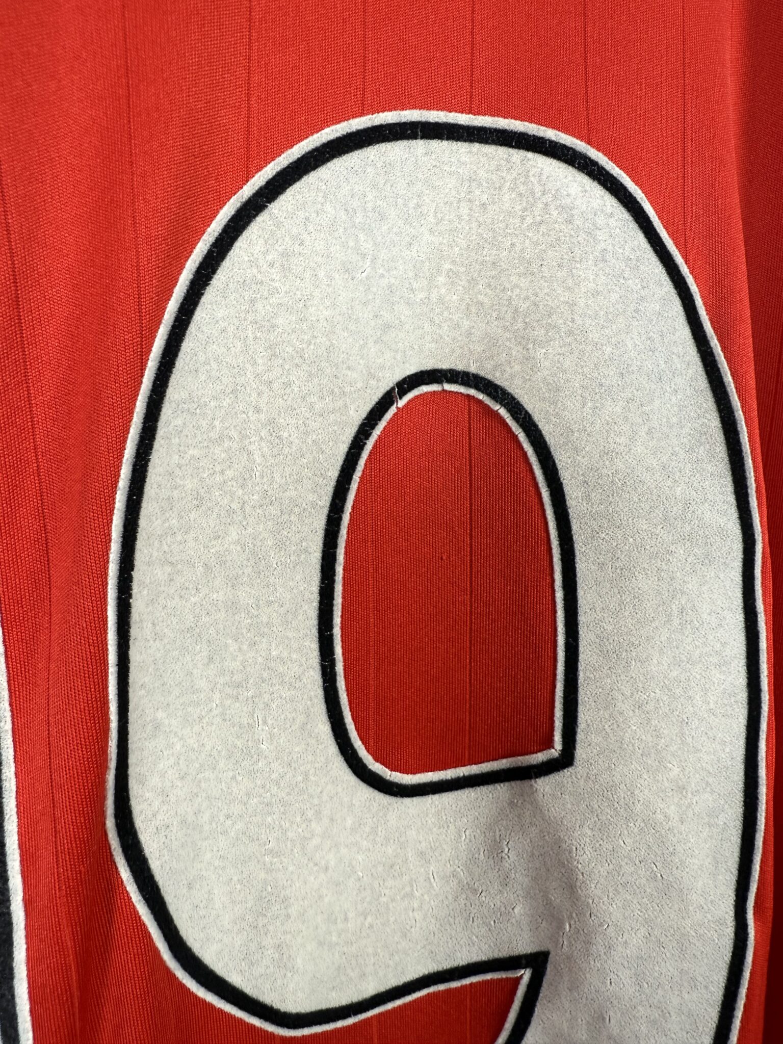 Stan: Bardzo dobry – nieznacznie popękany nadruk sponsora na froncie i cyfra na plecach oraz starta nalepka z rozmiarem.