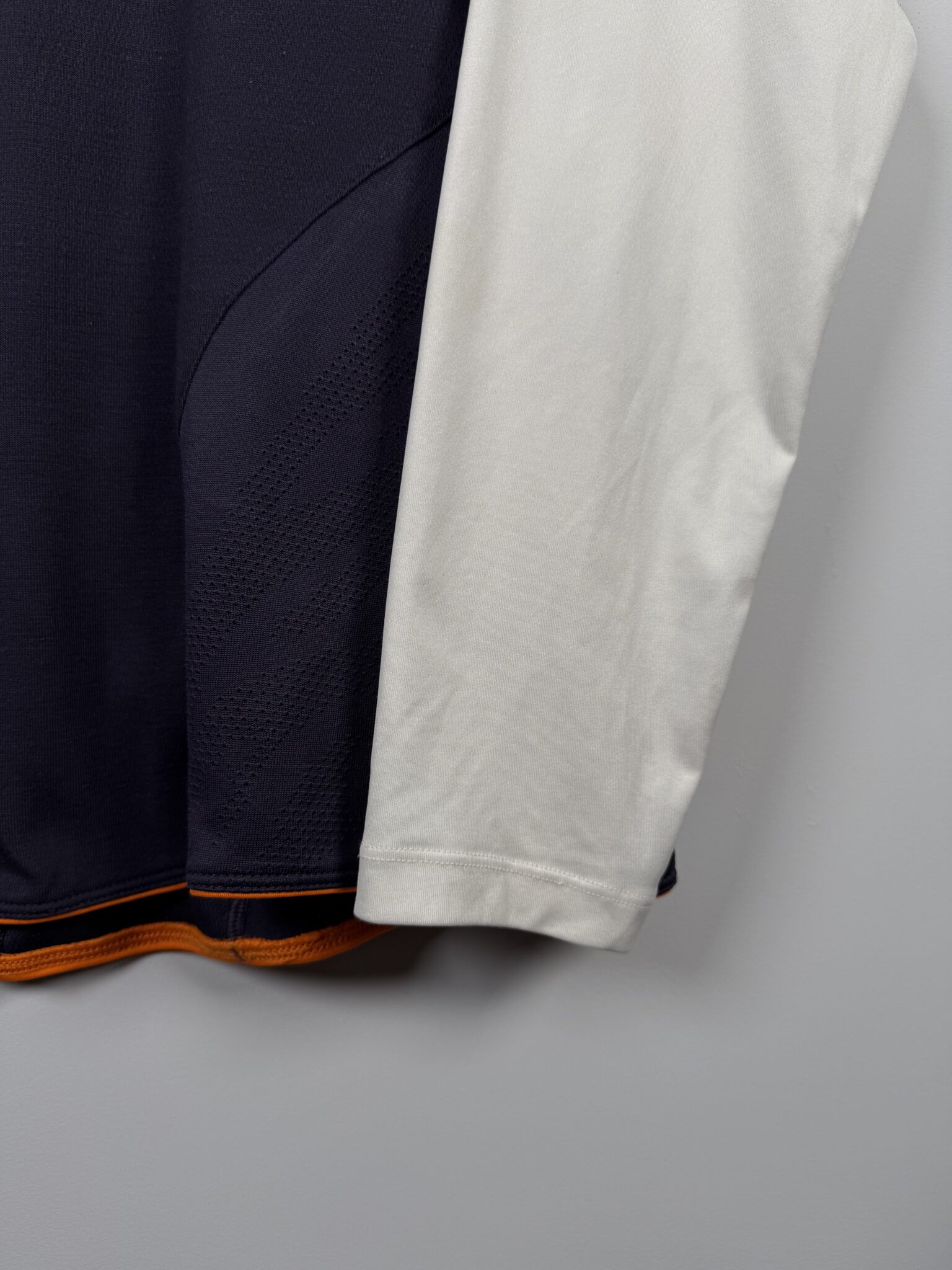 Ta oryginalna trzecia koszulka piłkarska Liverpoolu FC z sezonu 2012/13, wyprodukowana przez markę Warrior, to unikatowy model w wersji z długim rękawem, który rzadko trafia w ręce kolekcjonerów. Koszulka utrzymana jest w charakterystycznej, nowoczesnej stylistyce, z czarną bazą i szarymi elementami oraz wyróżniającymi się pomarańczowymi detalami, co czyni ją jedną z najbardziej nietypowych i odważnych propozycji w historii strojów Liverpoolu.