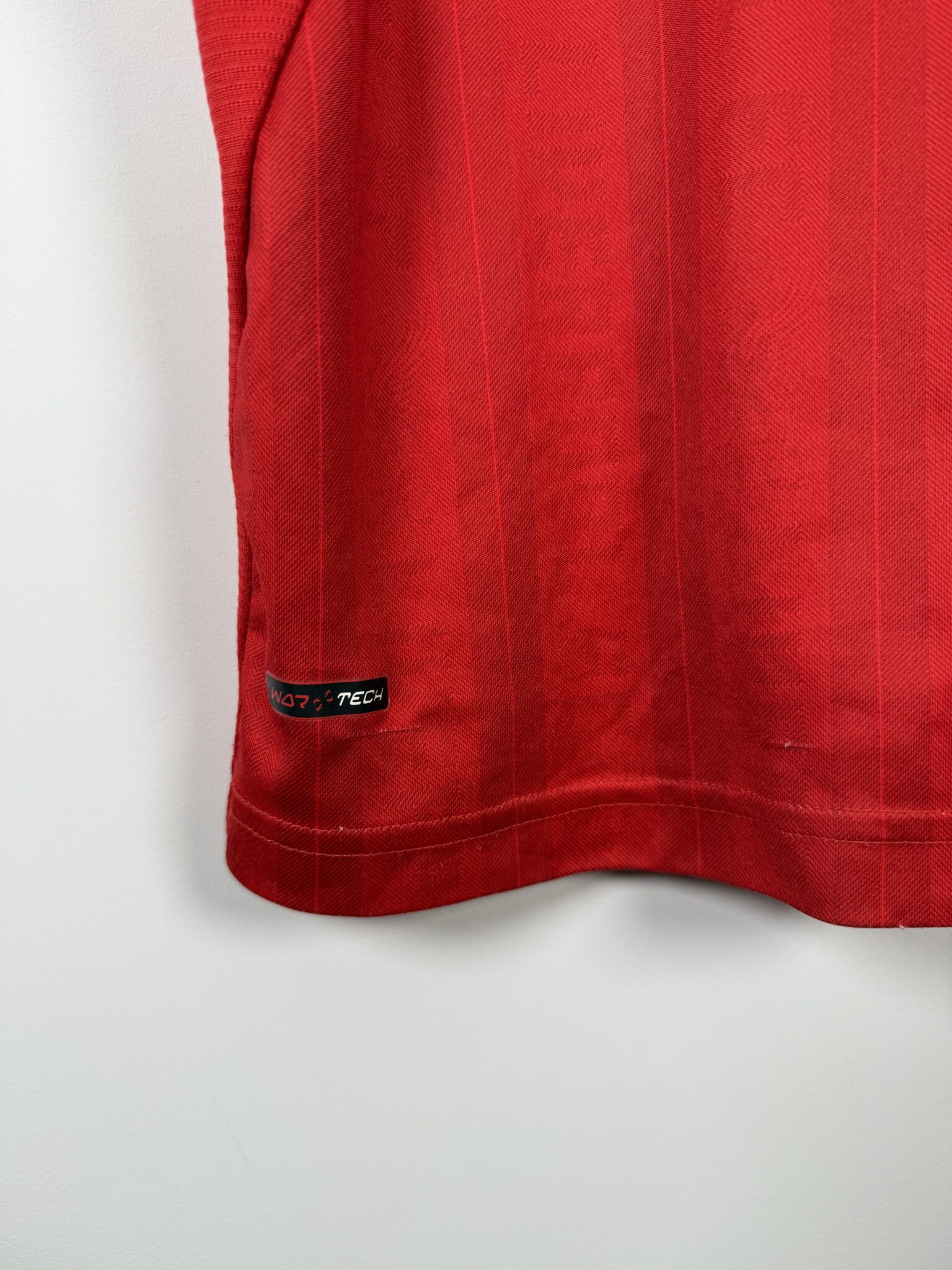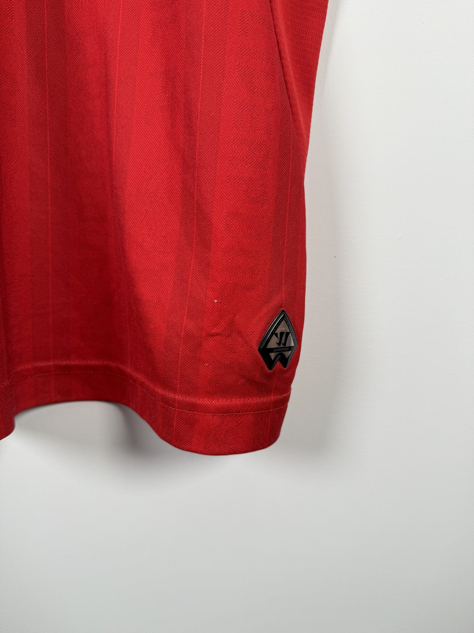 Ta oryginalna domowa koszulka Liverpool FC z sezonu 2013/14, wyprodukowana przez markę Warrior, to klasyczny model w tradycyjnych czerwonych barwach „The Reds”, który zapisał się w pamięci kibiców jako symbol jednego z najbardziej emocjonujących sezonów w erze Premier League. Koszulka wyróżnia się eleganckim krojem z białymi wykończeniami na kołnierzyku i mankietach, a na froncie znajdują się: herb Liverpoolu FC w złotej tonacji, logo Warrior oraz znak sponsora Standard Chartered.