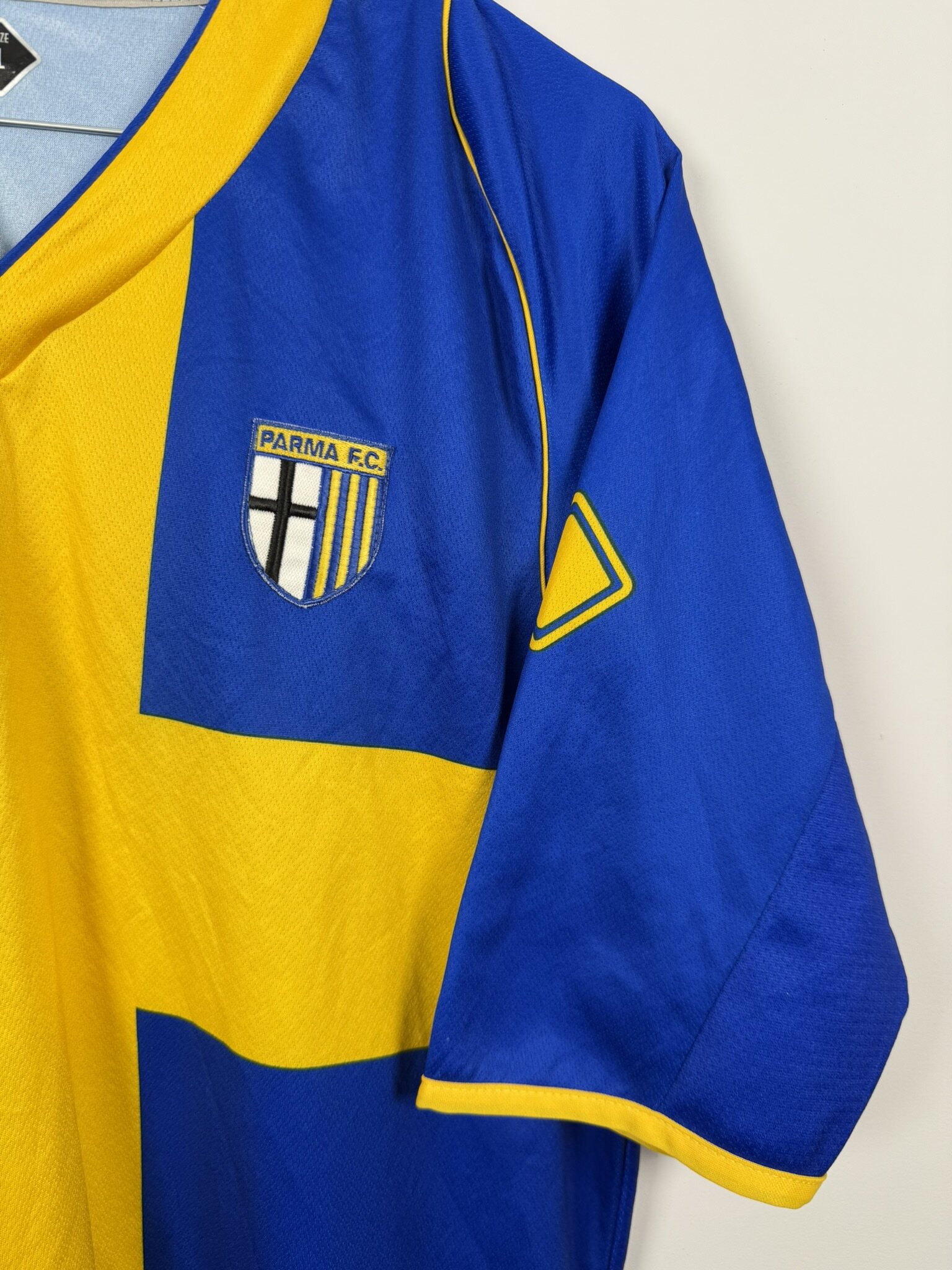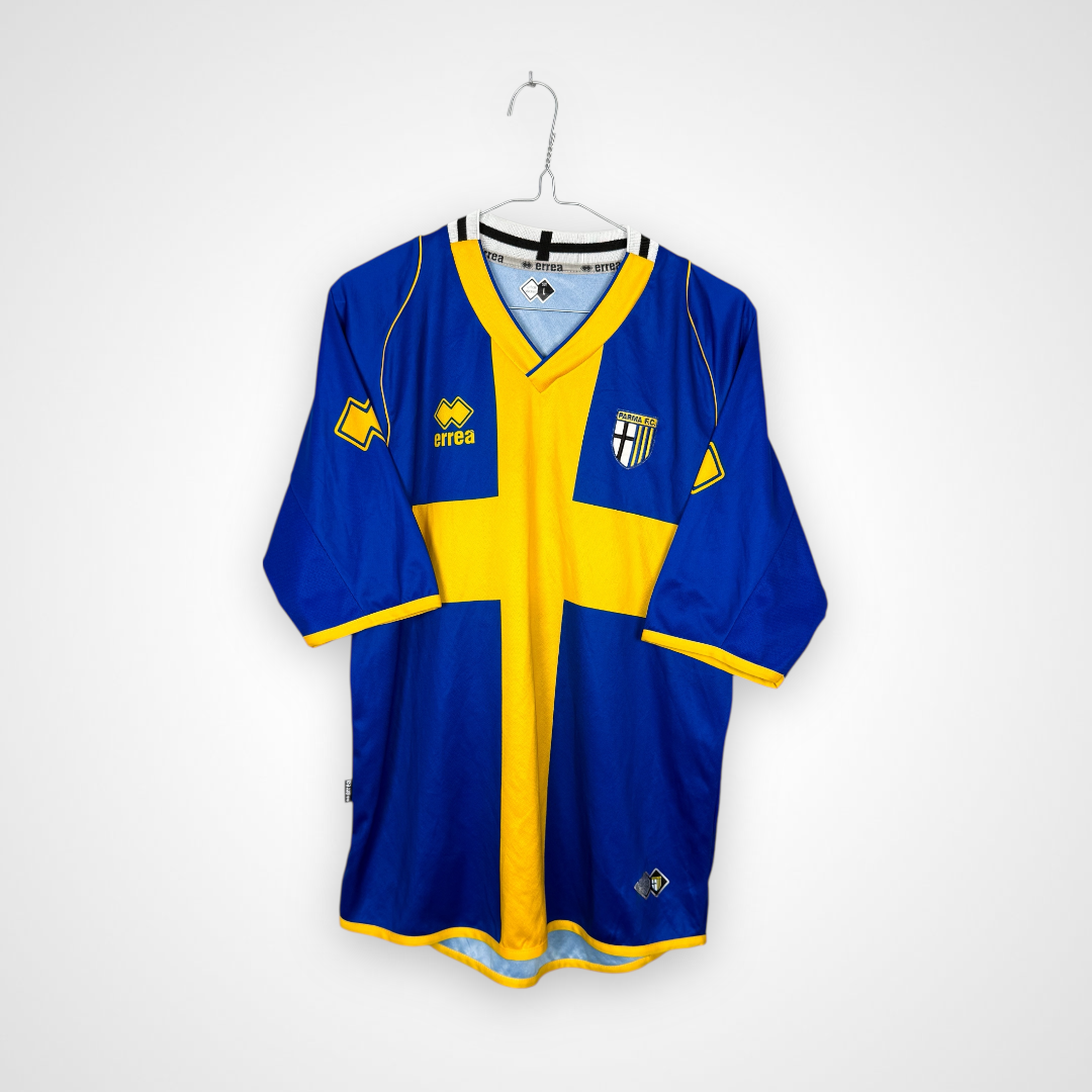 Model utrzymany jest w typowej dla wyjazdowych strojów Parmy kolorystyce – niebieskiej z charakterystycznym żółtym krzyżem na froncie, który jest znakiem rozpoznawczym klubu. Na piersi umieszczono haftowany herb Parmy oraz logo Errea. Krój jest dopasowany, a materiał techniczny zapewnia komfort i dobrą wentylację, zgodnie z ówczesnymi standardami profesjonalnej odzieży piłkarskiej.