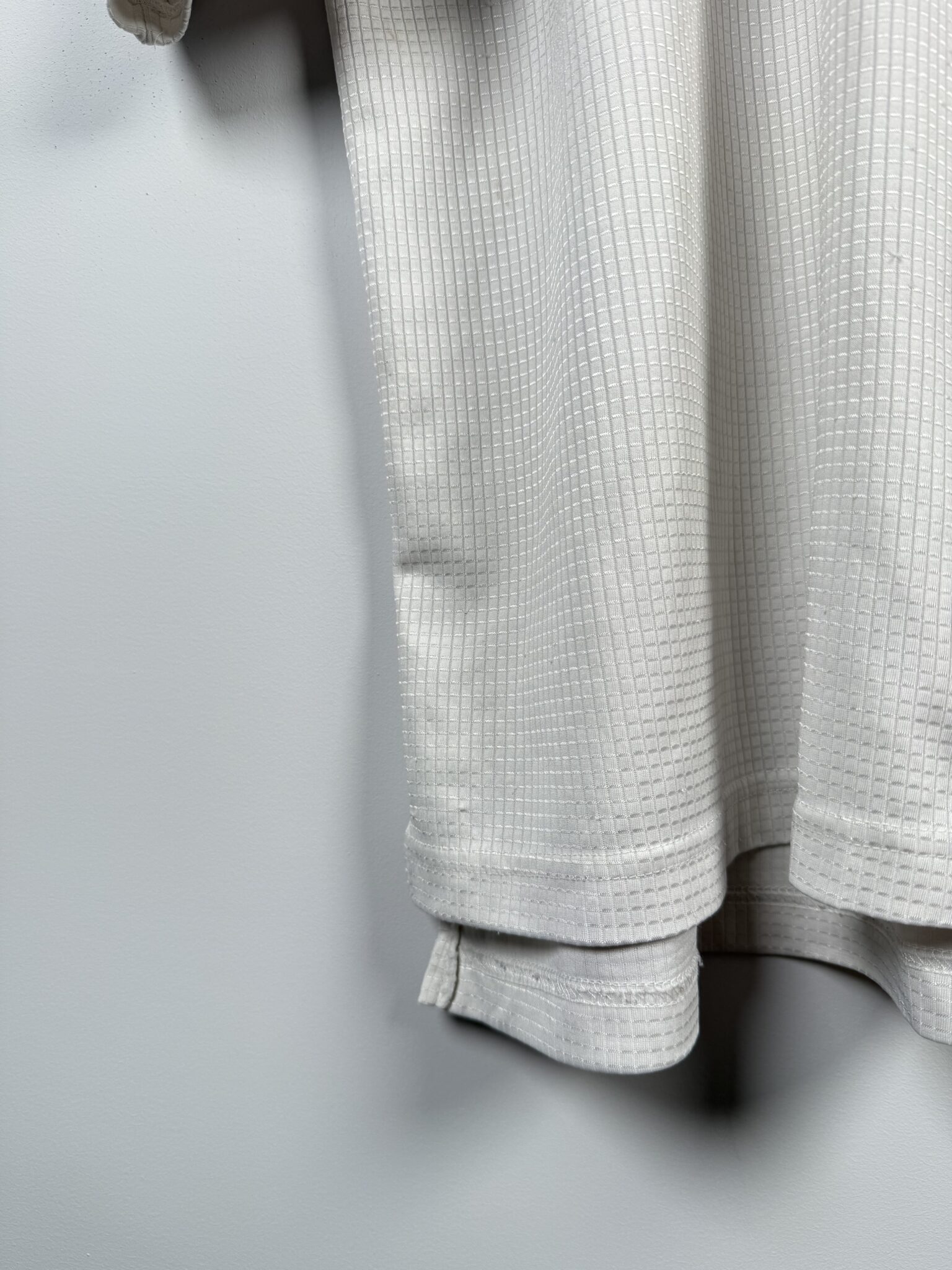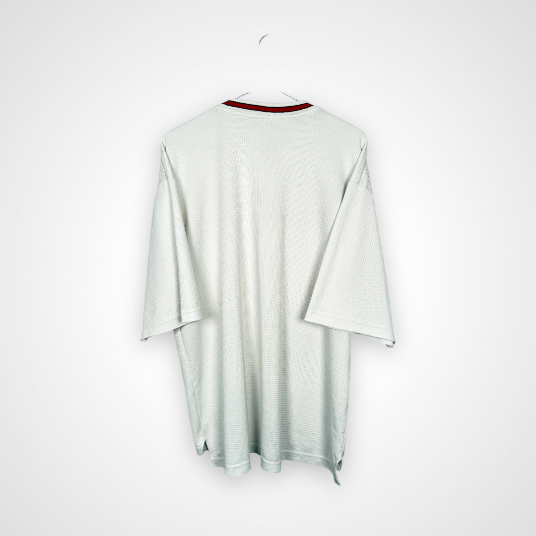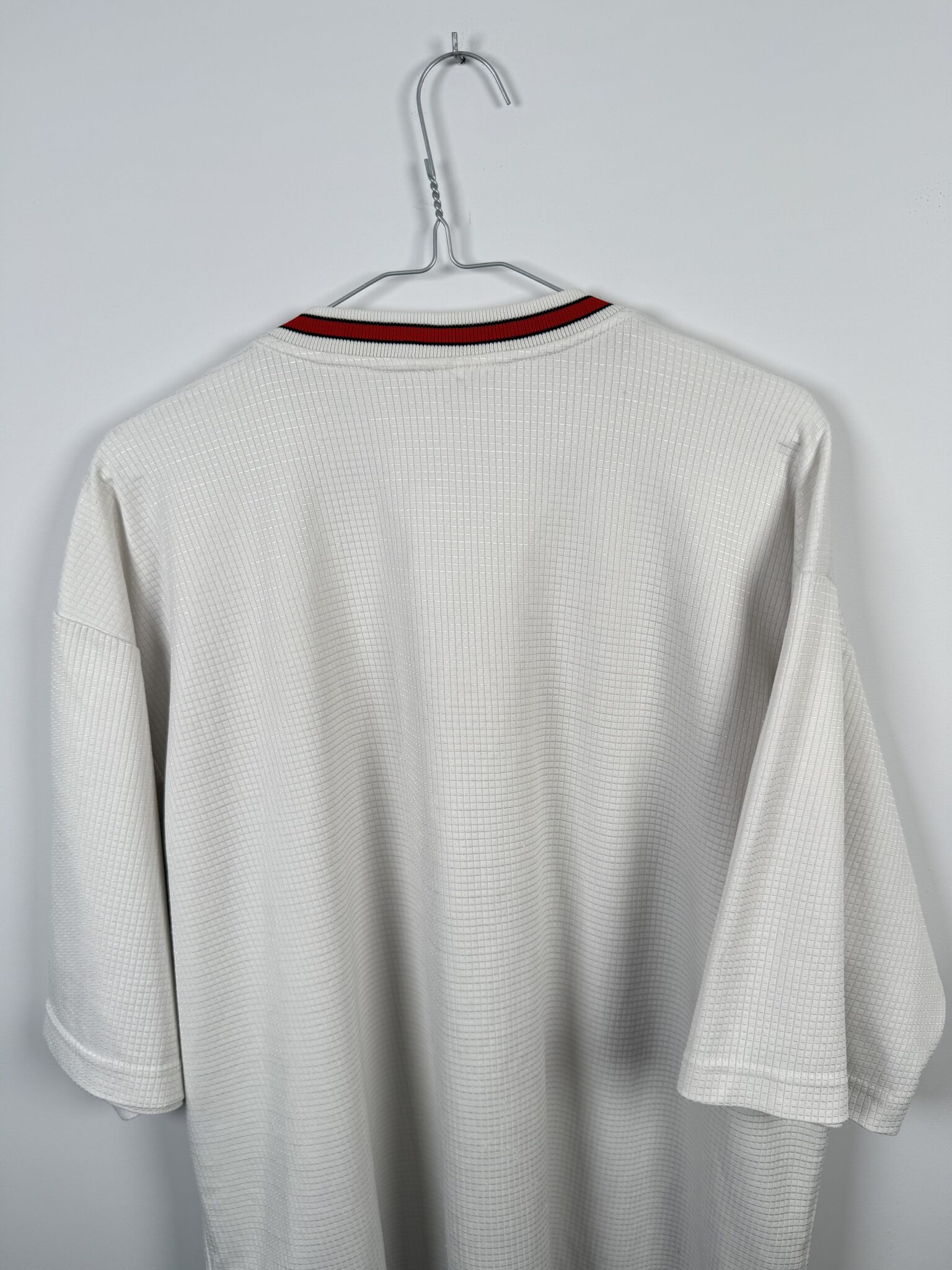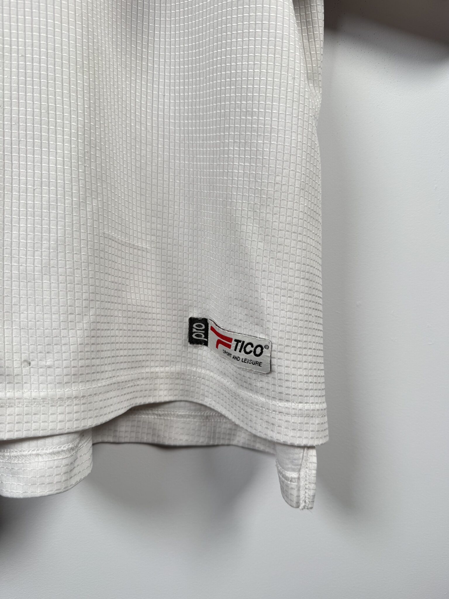 To oryginalna koszulka piłkarska reprezentacji Polski z 2000 roku, wyprodukowana przez rodzimą firmę Tico. Utrzymana w klasycznej bieli, z czerwonymi wstawkami na kołnierzyku, oddaje tradycyjny styl biało-czerwonych barw narodowych. Na piersi znajduje się wyhaftowany herb PZPN, a całość wykonano z grubego materiału, typowego dla przełomu lat 90. i 2000. To prosty, ale niezwykle klimatyczny model, przypominający okres odbudowy reprezentacji przed eliminacjami do Mistrzostw Świata 2002. Doskonała propozycja dla kolekcjonerów i kibiców, którzy cenią klasykę polskiego futbolu.