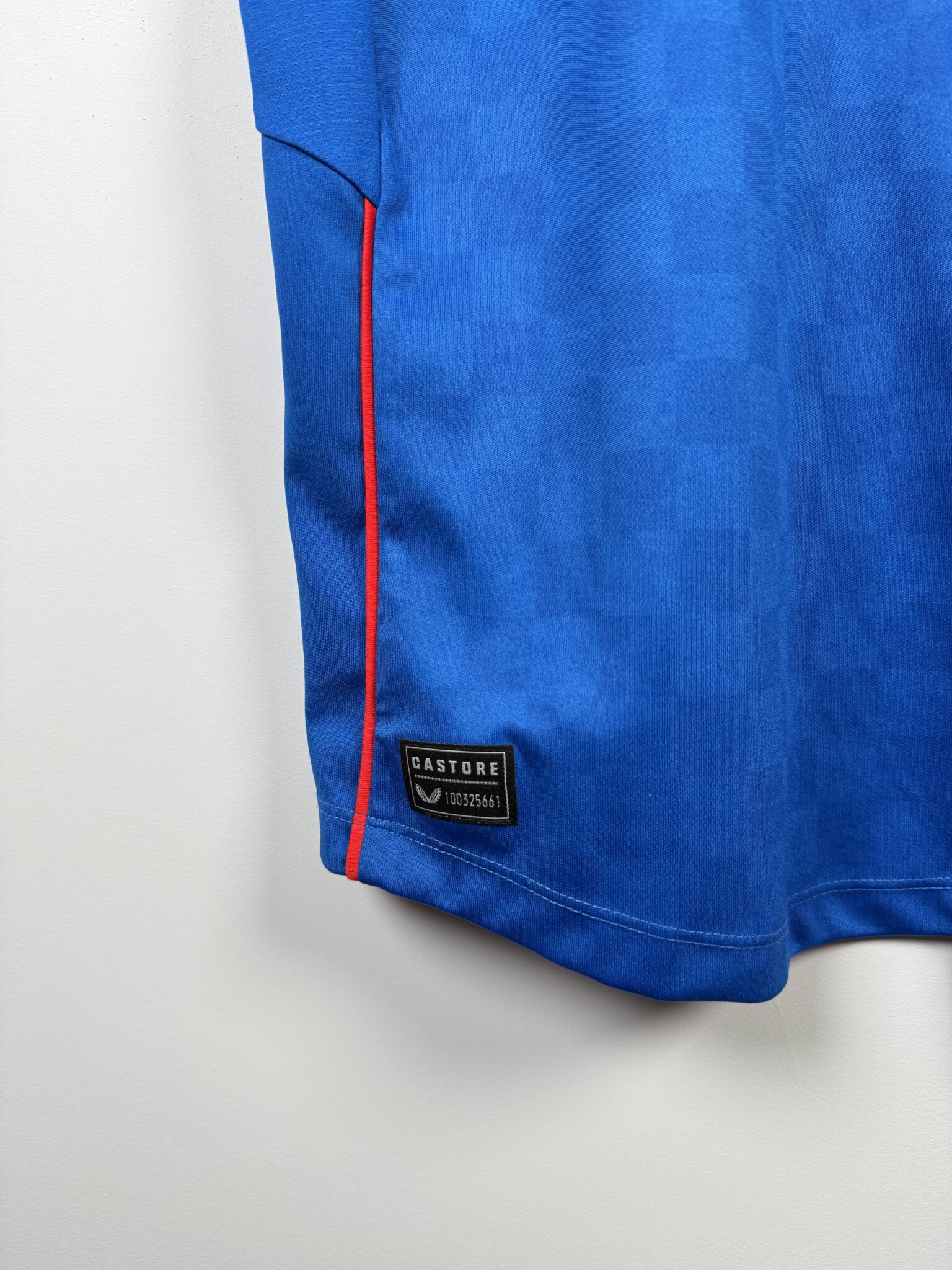To oryginalna koszulka piłkarska Rangers FC z sezonu 2022/23, wyprodukowana przez brytyjską firmę Castore. Model w charakterystycznym niebieskim kolorze nawiązuje do klasycznej stylistyki klubu z Ibrox, a subtelne detale, takie jak białe wykończenia rękawków i kołnierzyka, dodają elegancji. Na piersi znajduje się wyhaftowany herb klubu, logo producenta oraz sponsor główny w centralnej części. Koszulka wykonana jest z lekkiego, oddychającego materiału, który zapewnia komfort zarówno na trybunach, jak i podczas codziennego noszenia.