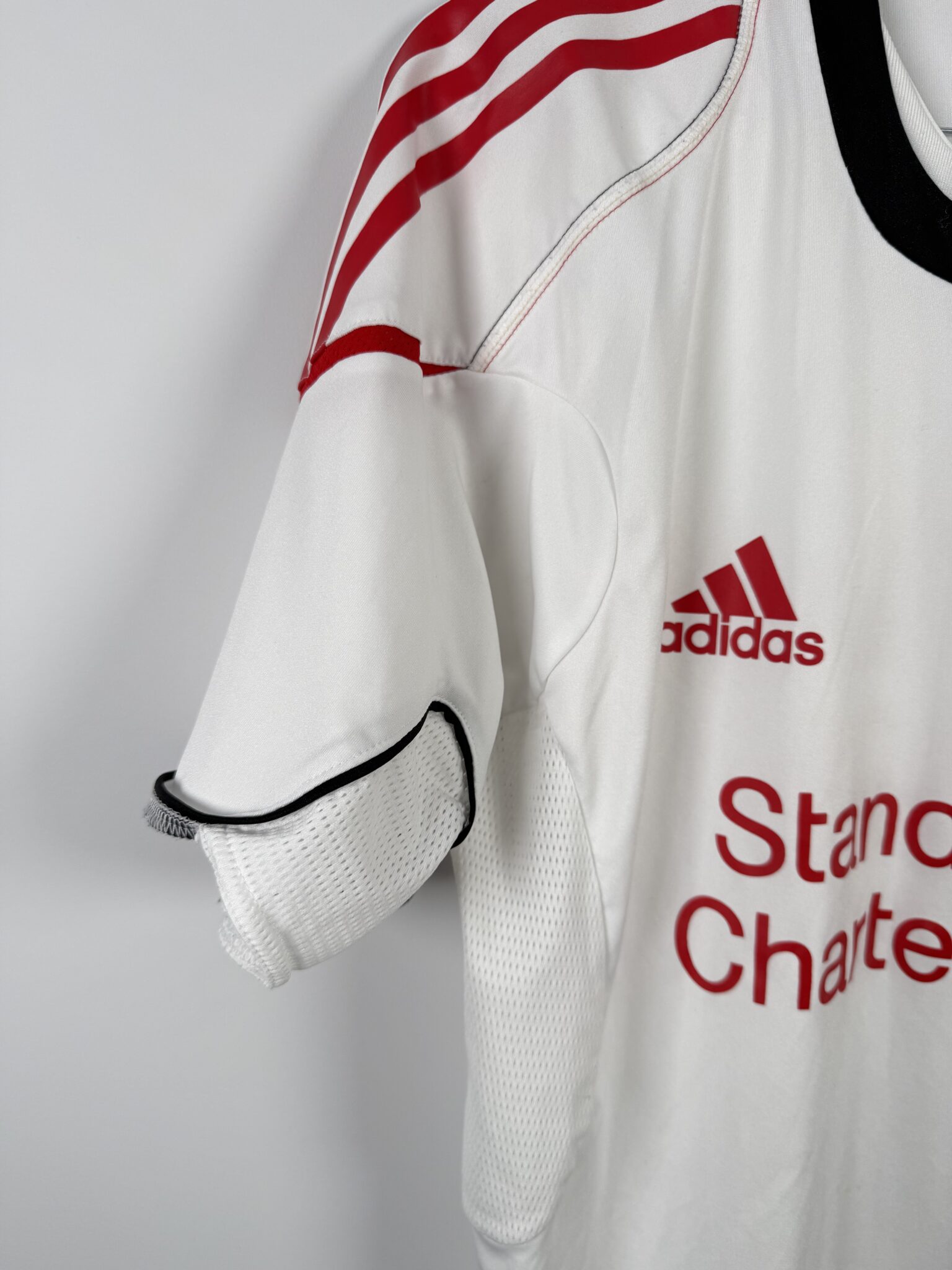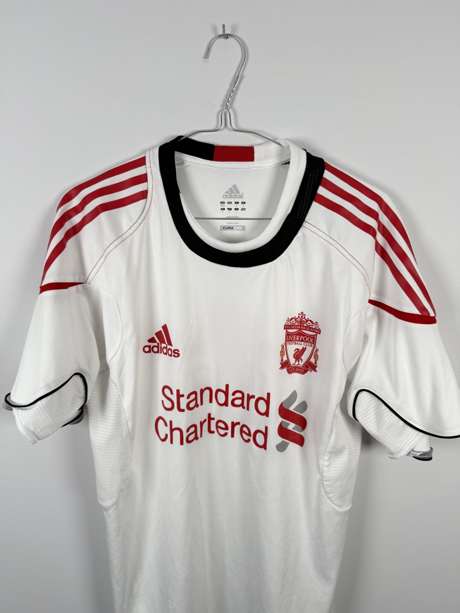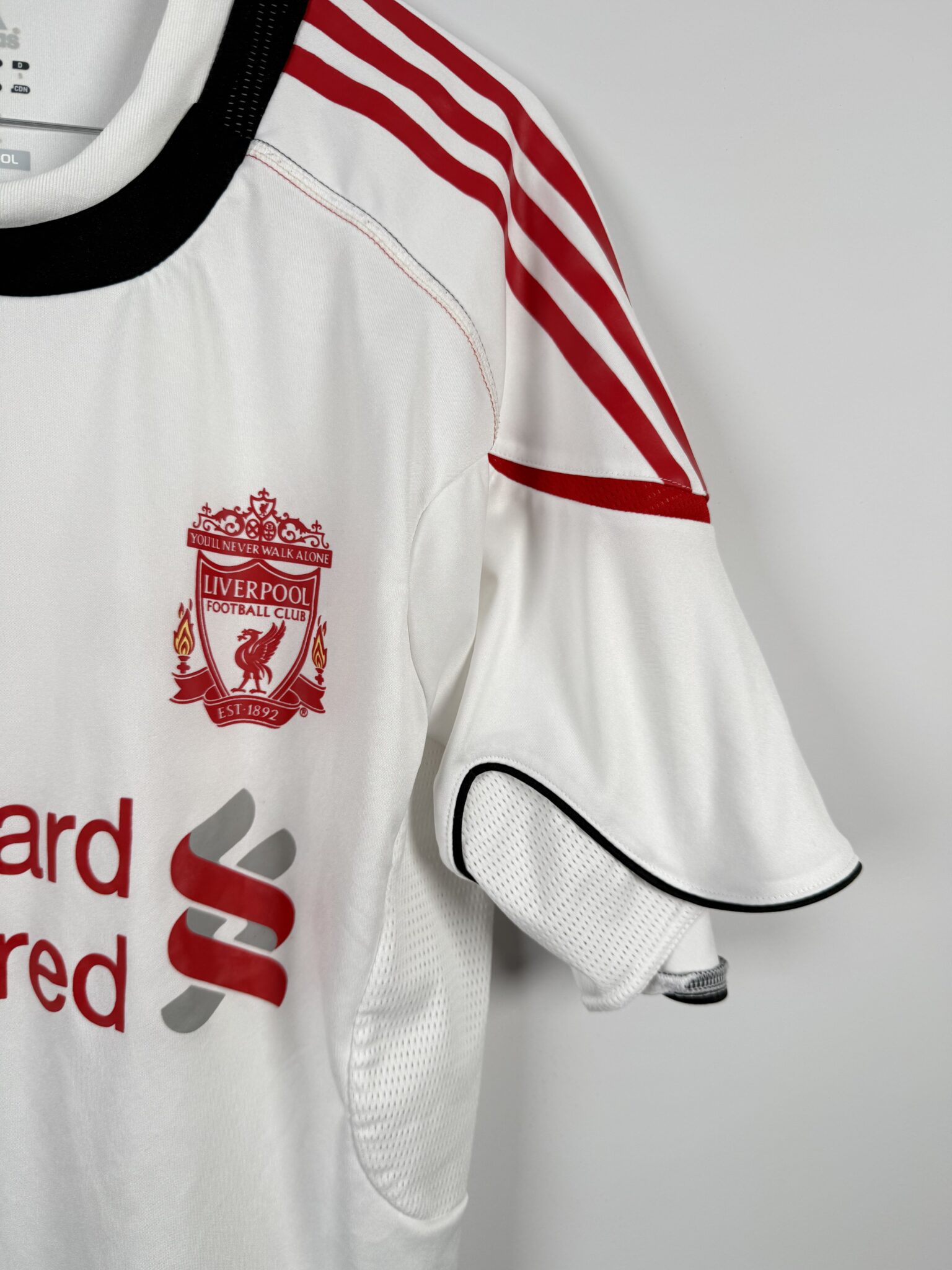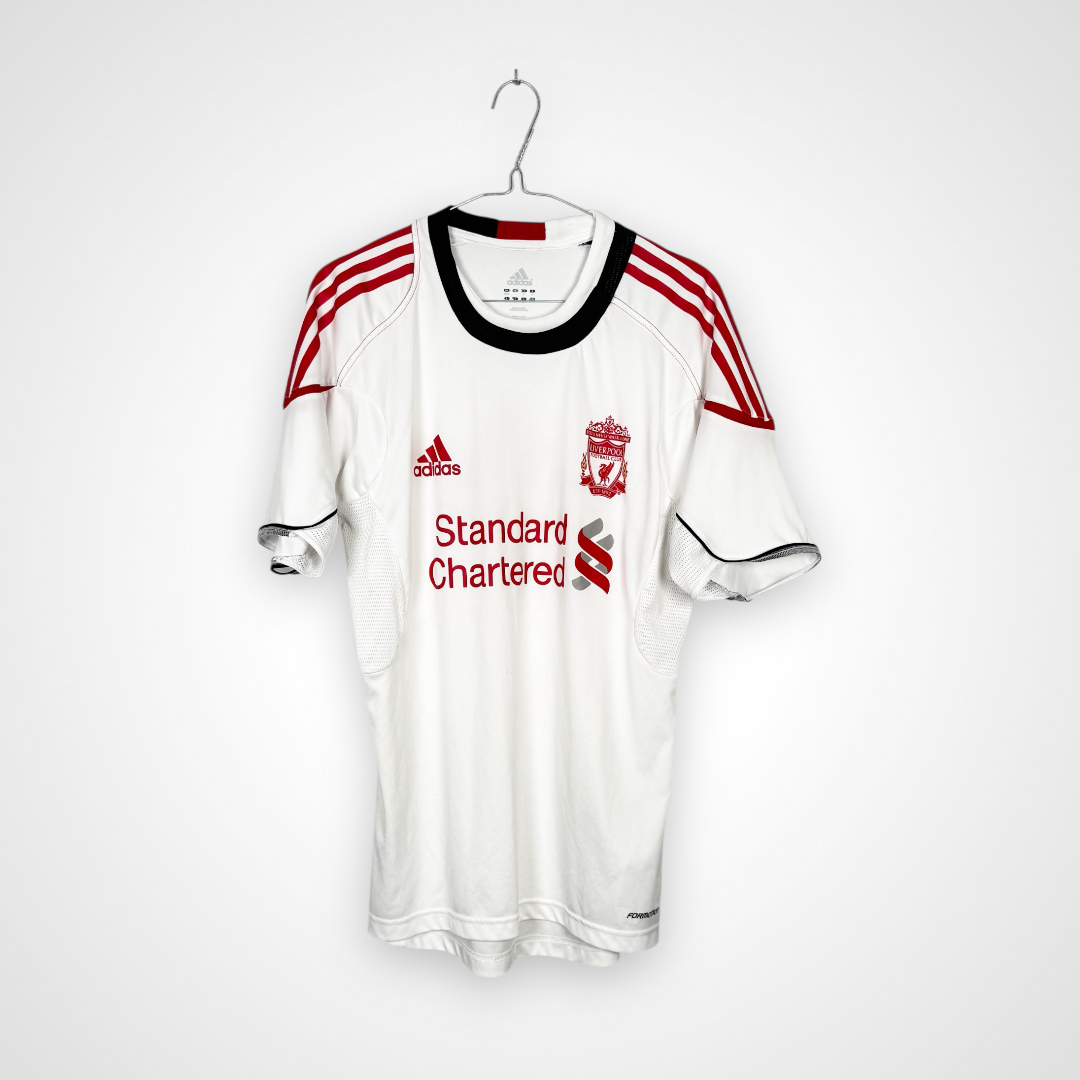 Na piersi znajduje się herb Liverpoolu, logo Adidasa oraz znak sponsora Standard Chartered, który w sezonie 2010/11 po raz pierwszy pojawił się na oficjalnych strojach klubu. Koszulka została wykonana w technologii Adidas Formotion, co zapewniało zawodnikom oddychalność, lekkość i pełen komfort podczas treningów i przygotowań do spotkań.
