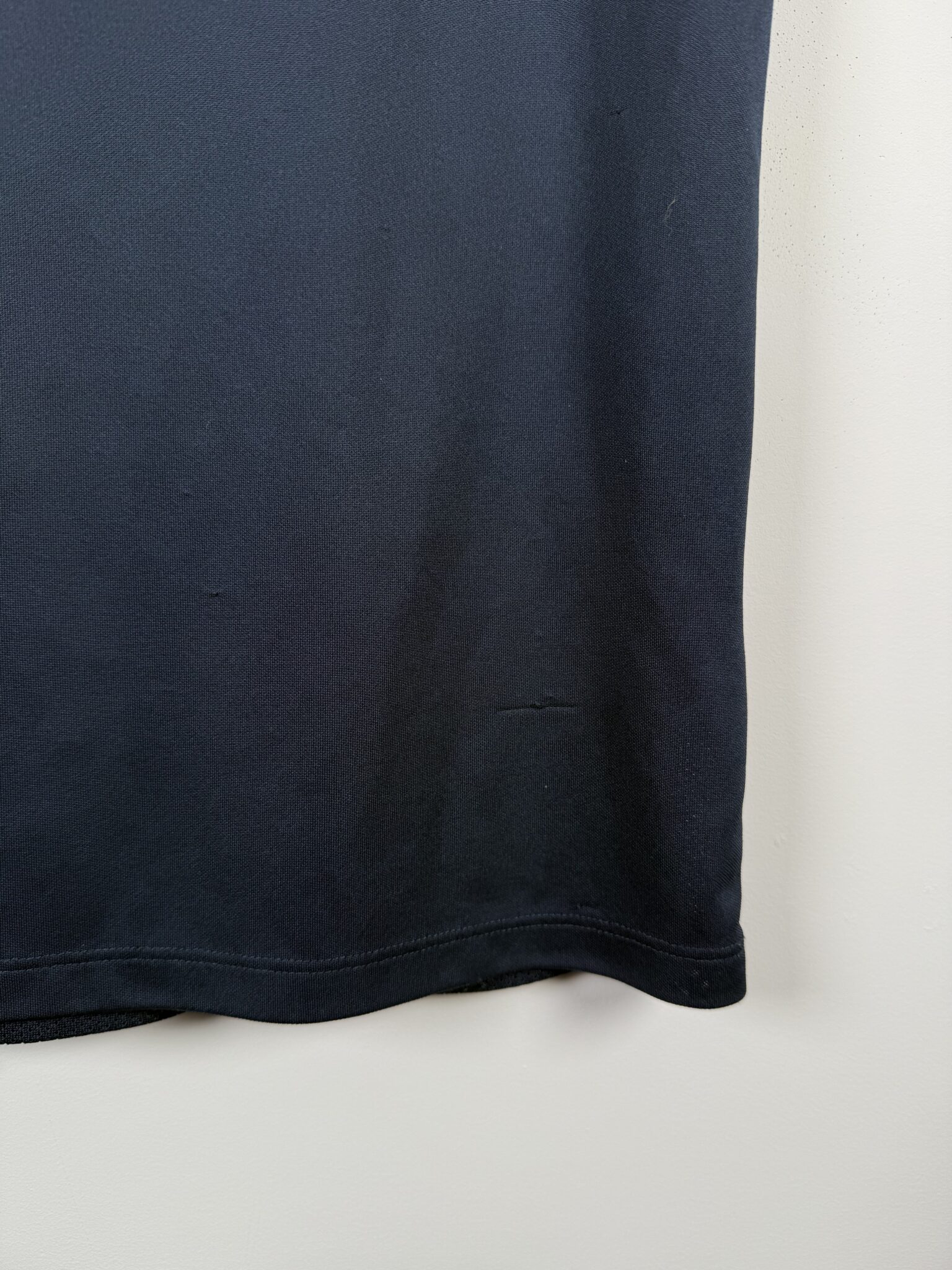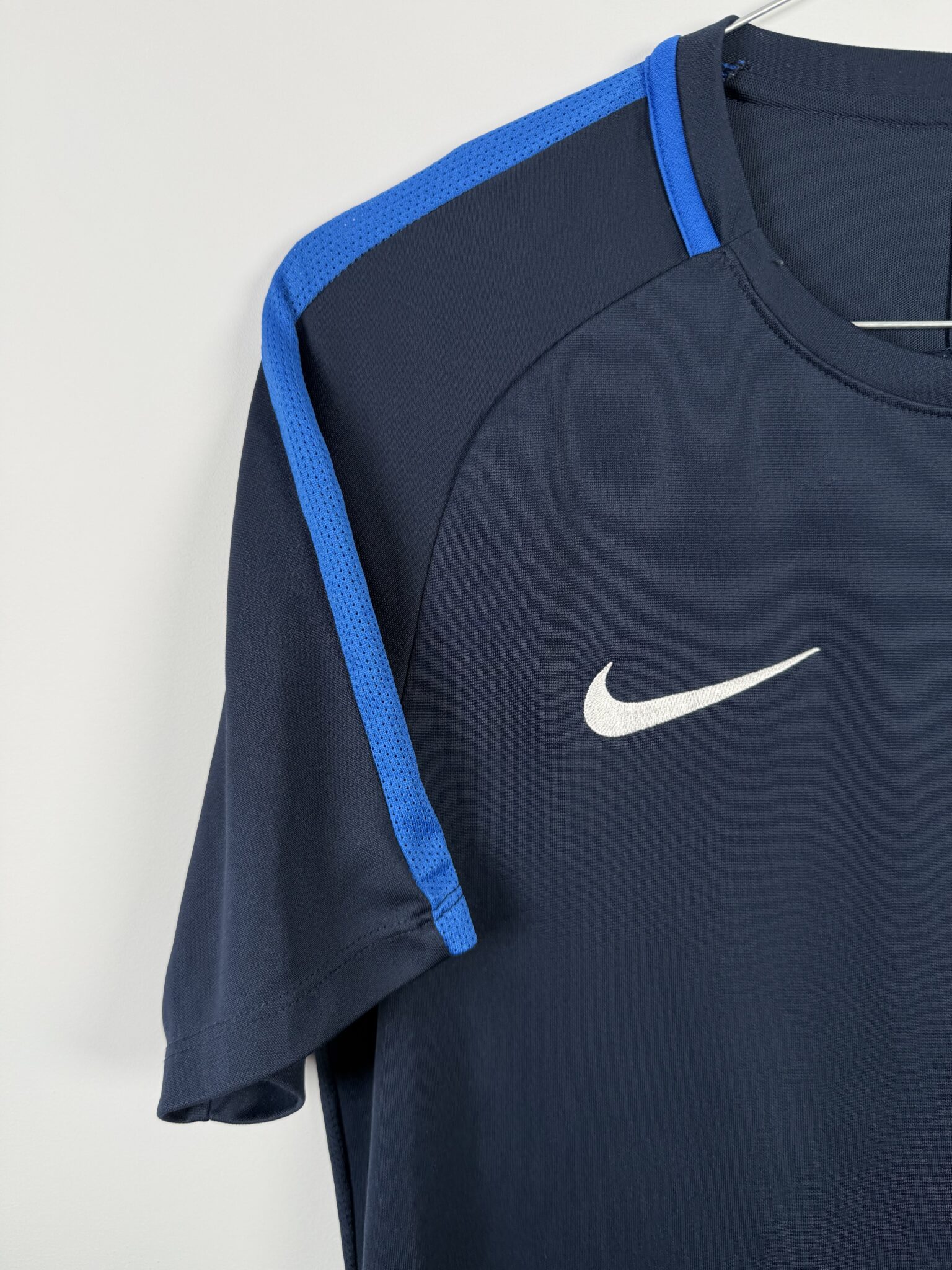 Ta oryginalna treningowa koszulka Manchester City z sezonu 2016/17, wyprodukowana przez Nike, to elegancki i funkcjonalny model w ciemnogranatowym kolorze, wyróżniający się charakterystycznymi jasnoniebieskimi paskami na rękawach. Minimalistyczny, nowoczesny design doskonale wpisywał się w estetykę klubowej kolekcji treningowej w pierwszym sezonie pracy Pepa Guardioli w Manchesterze.
