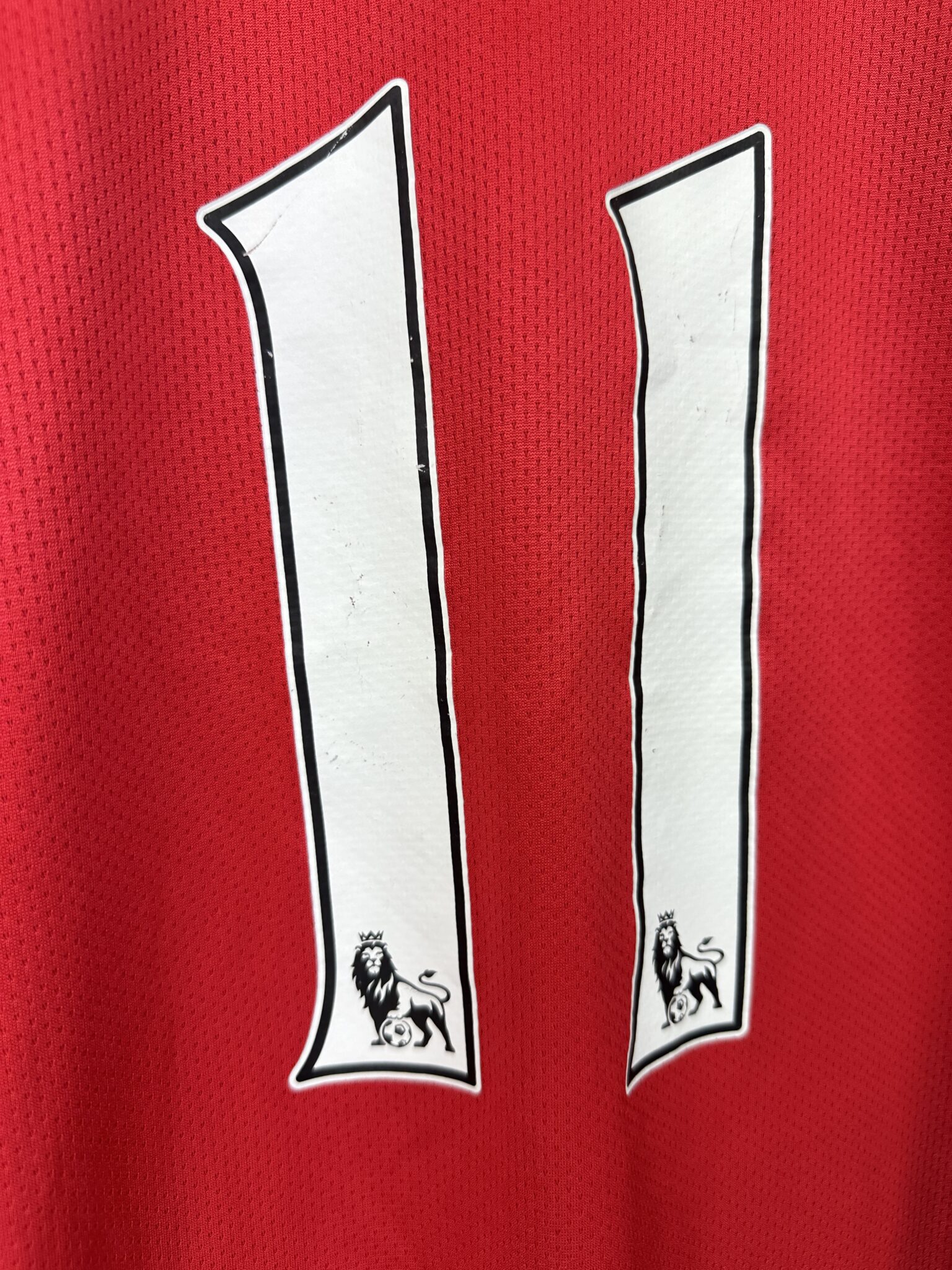 Stan: Zadowalający – nieznacznie popękany nadruk sponsora i cyfry na plecach, miejscami średniej wielkości zaciągnięcia oraz kilka mniejszych. Paski na plecach zachowane w świetnym stanie, co jest rzadkością w przypadku tego modelu.