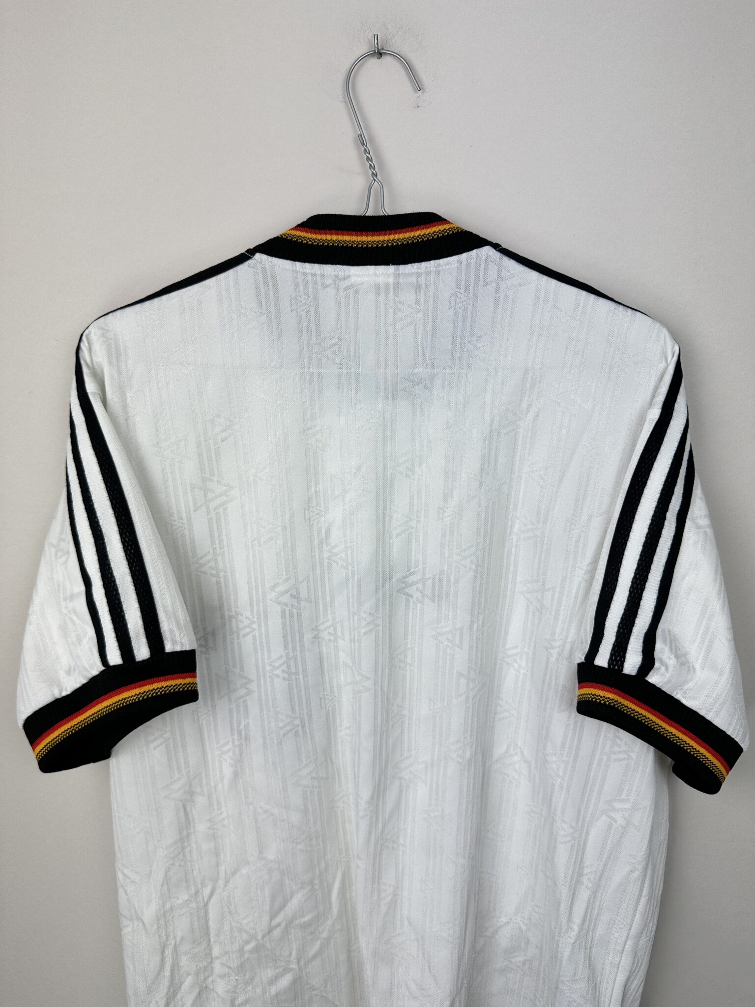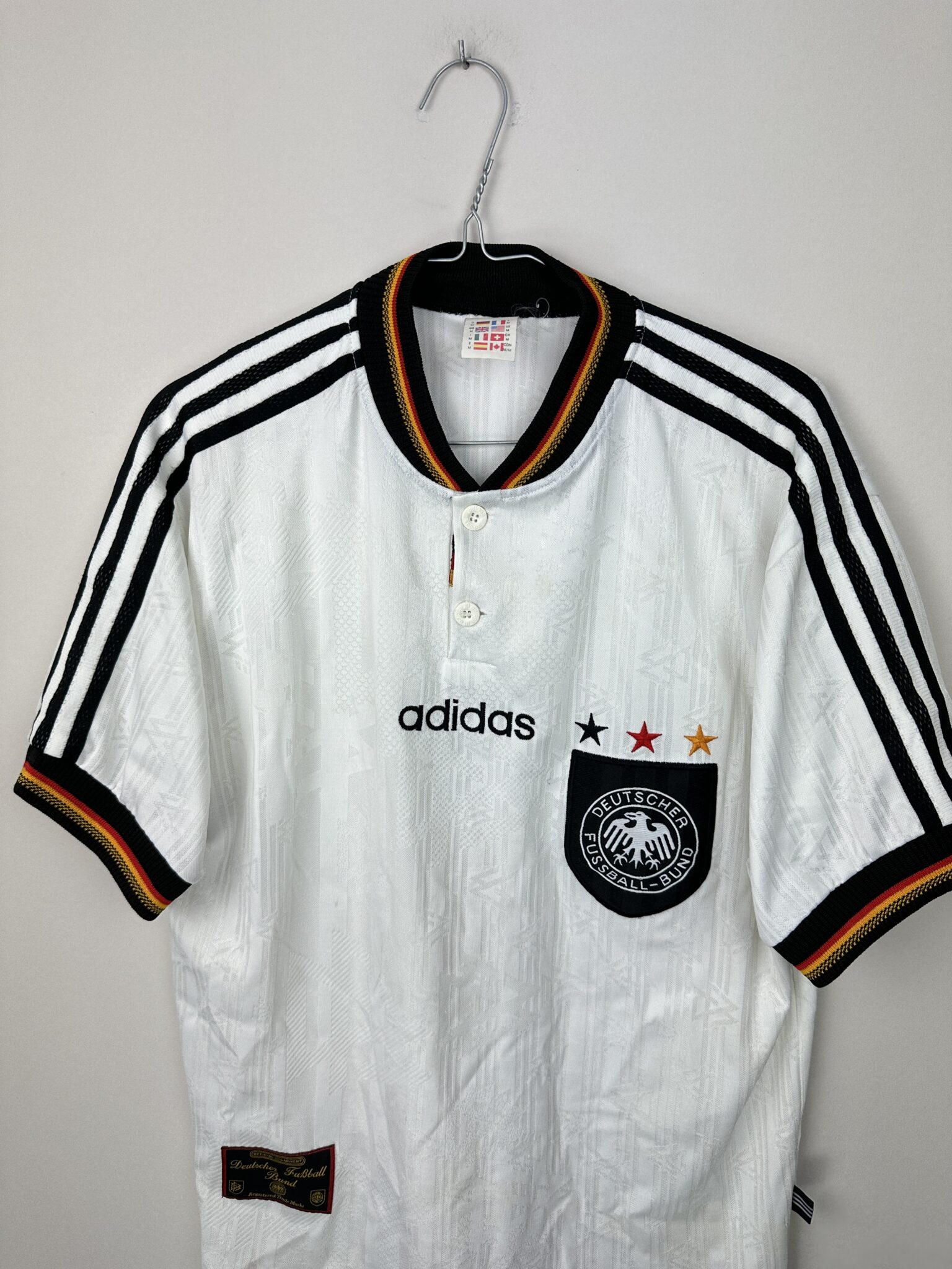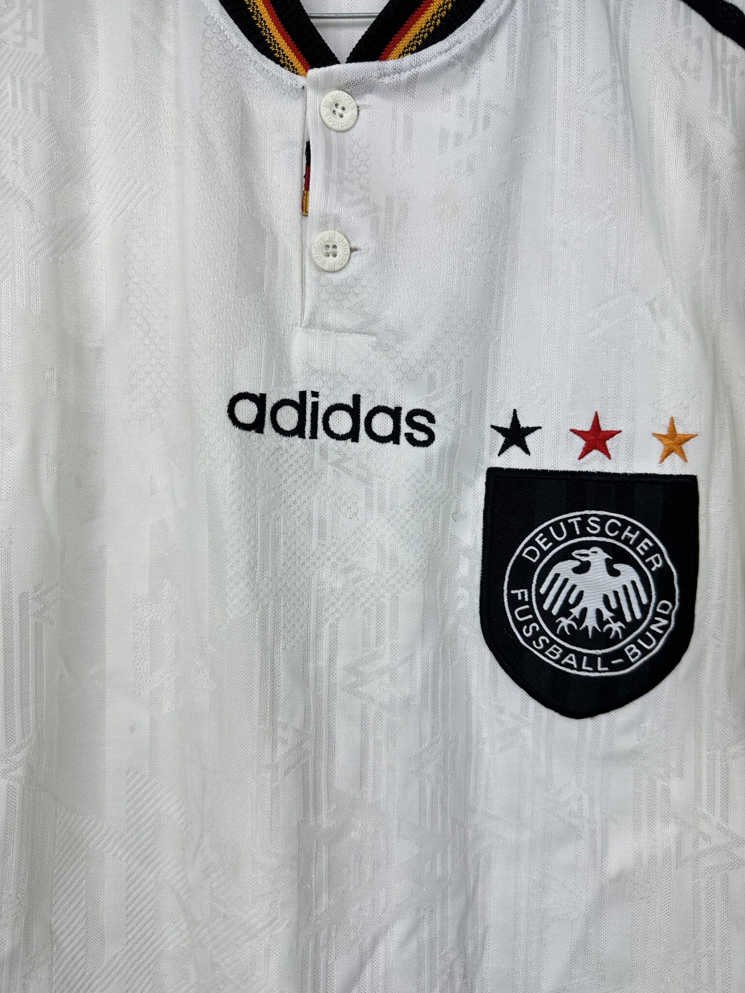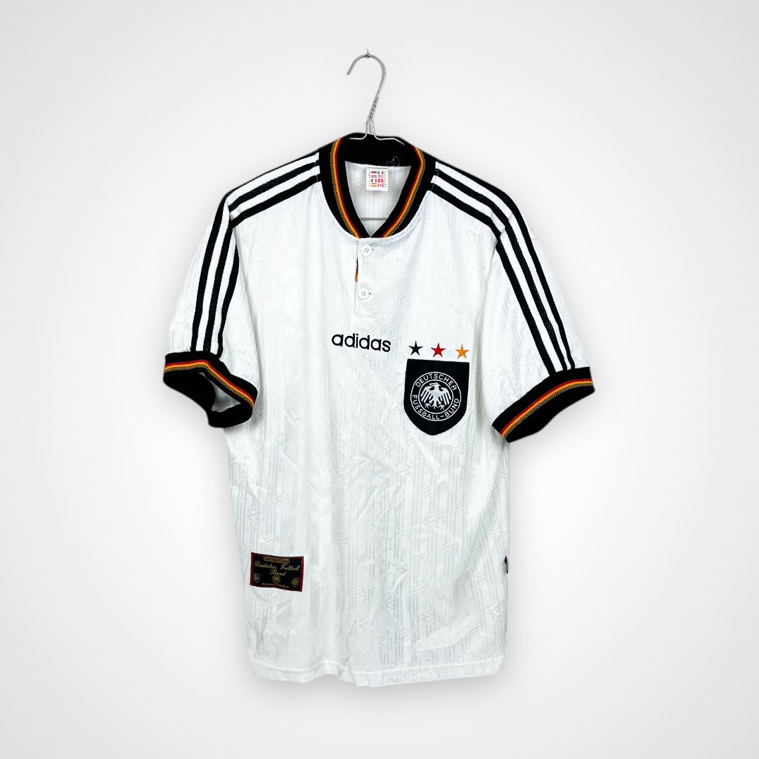 Oryginalna, domowa koszulka reprezentacji Niemiec z lat 1996-98 produkcji Adidasa, charakteryzująca się głęboką bielą, dużym logiem federacji oraz czarno żółtymi wstawkami. Jest to podstawowy komplet Die Mannschaft, w którym występowali na Euro 1996, w którym finalnie zajęli pierwsze miejsce.