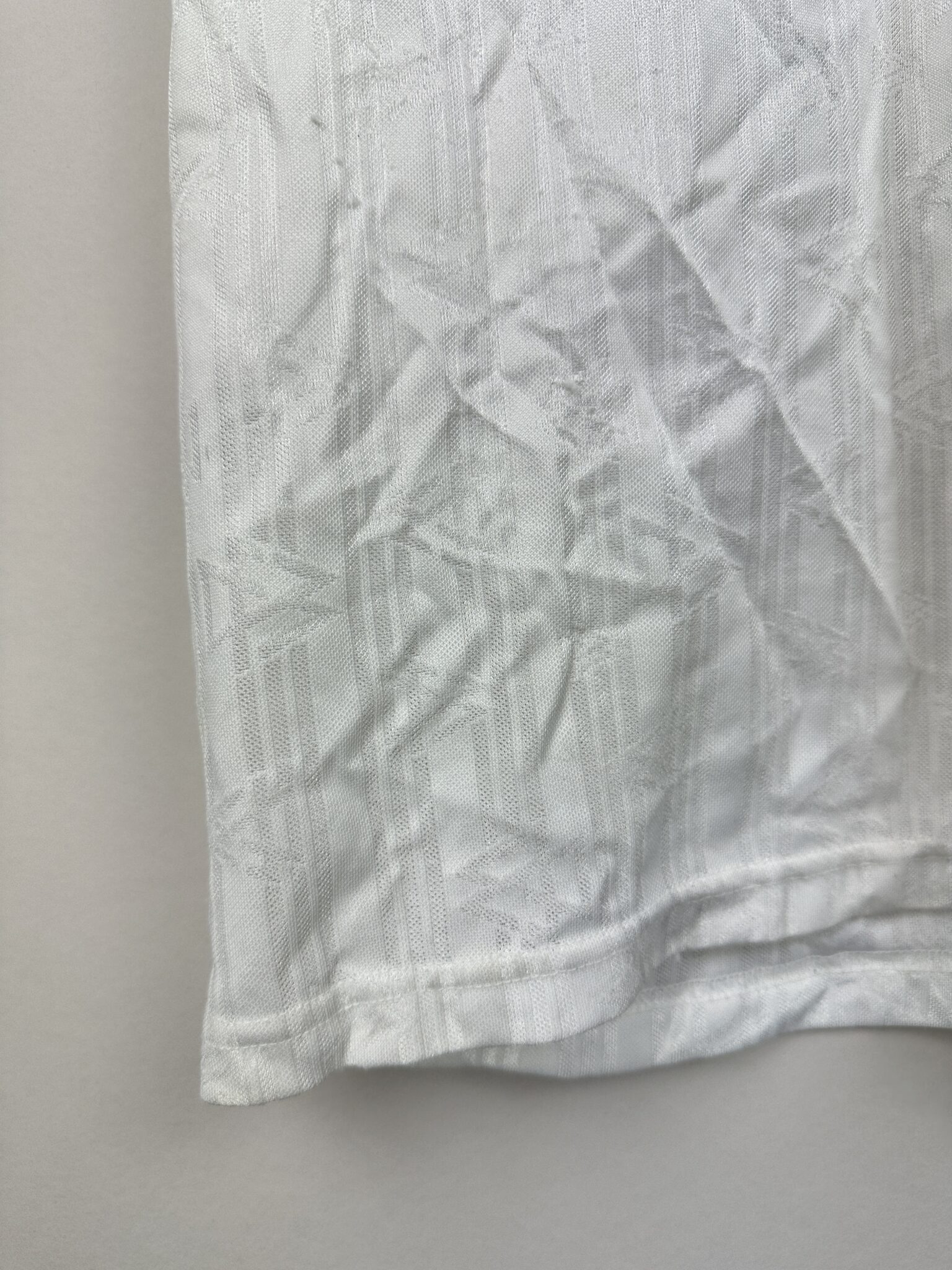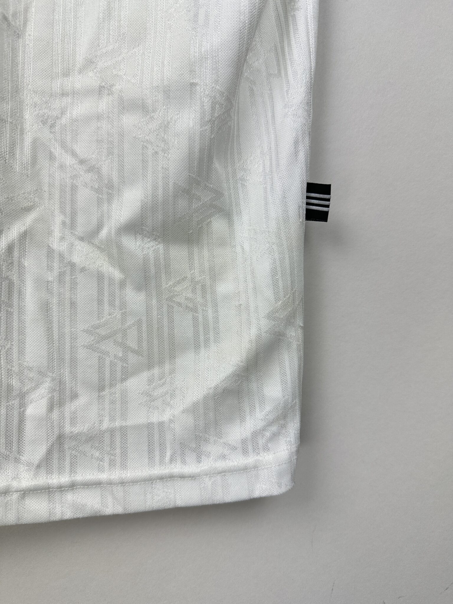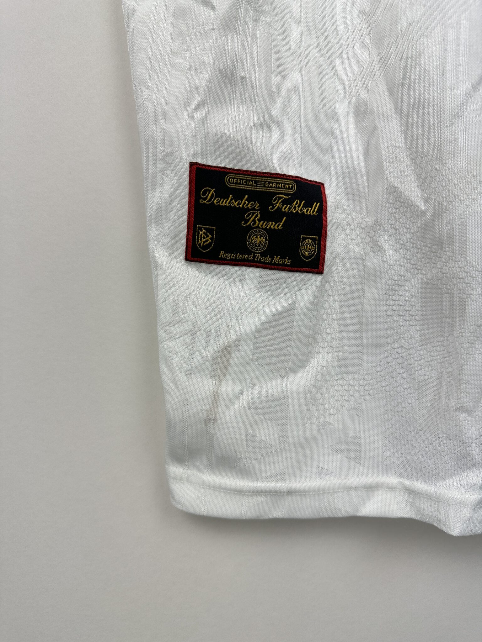 Oryginalna, domowa koszulka reprezentacji Niemiec z lat 1996-98 produkcji Adidasa, charakteryzująca się głęboką bielą, dużym logiem federacji oraz czarno żółtymi wstawkami. Jest to podstawowy komplet Die Mannschaft, w którym występowali na Euro 1996, w którym finalnie zajęli pierwsze miejsce.