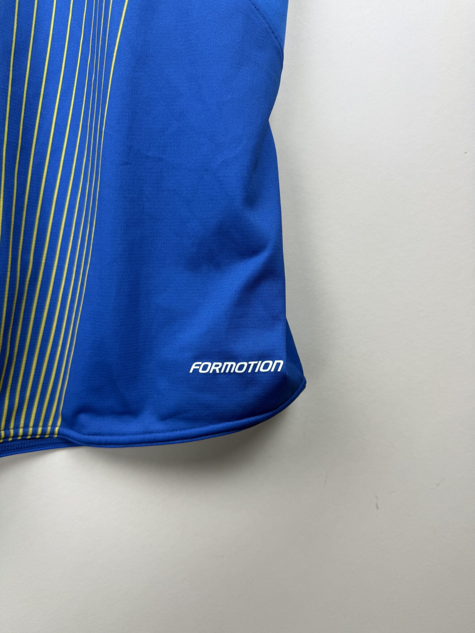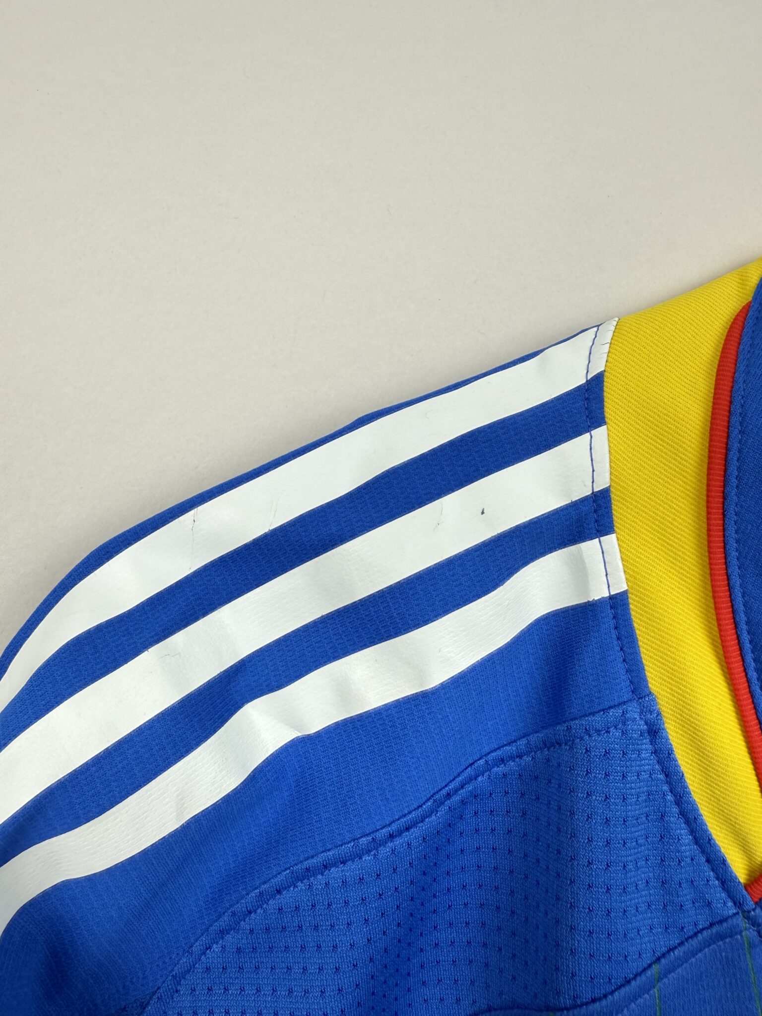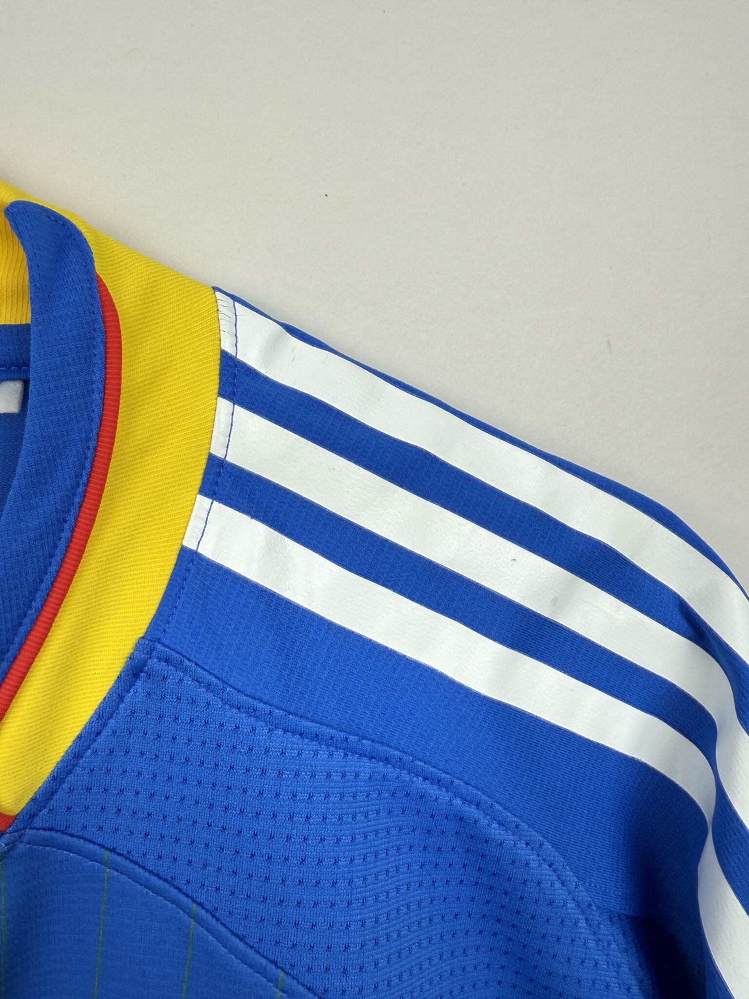 Oryginalna domowa koszulka piłkarska reprezentacji Japonii z lat 2008–2010, produkcji Adidasa, z nazwiskiem Shunsuke Nakamury – jednego z najbardziej rozpoznawalnych japońskich piłkarzy w historii. Niebieski model z delikatnymi czerwonymi oraz żółtymi akcentami i gładką strukturą materiału to prawdziwa klasyka XXI wieku z azjatyckiej sceny piłkarskiej.