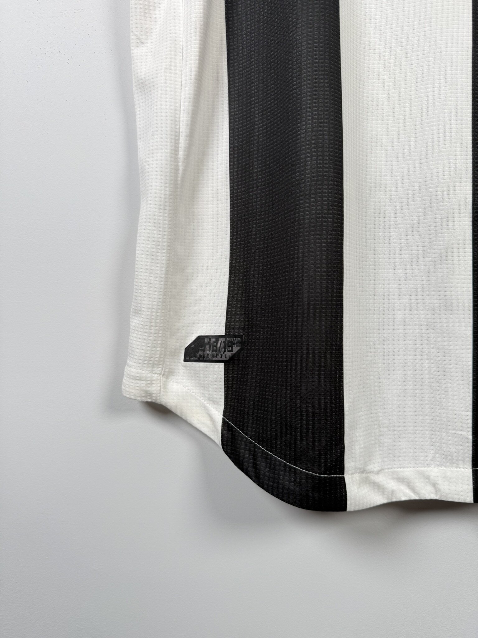 Projekt nawiązuje do klasyki – ikoniczne biało-czarne pasy zostały uproszczone do dwóch szerokich bloków kolorystycznych, z wyraźnym białym panelem pośrodku, co nadało koszulce nowoczesnego charakteru. Na piersi znalazło się naklejane logo Juventusu w minimalistycznej, zrebrandowanej formie oraz białe logo Adidasa.