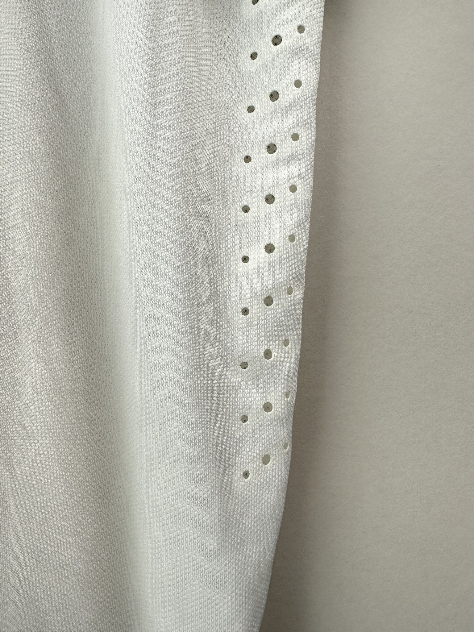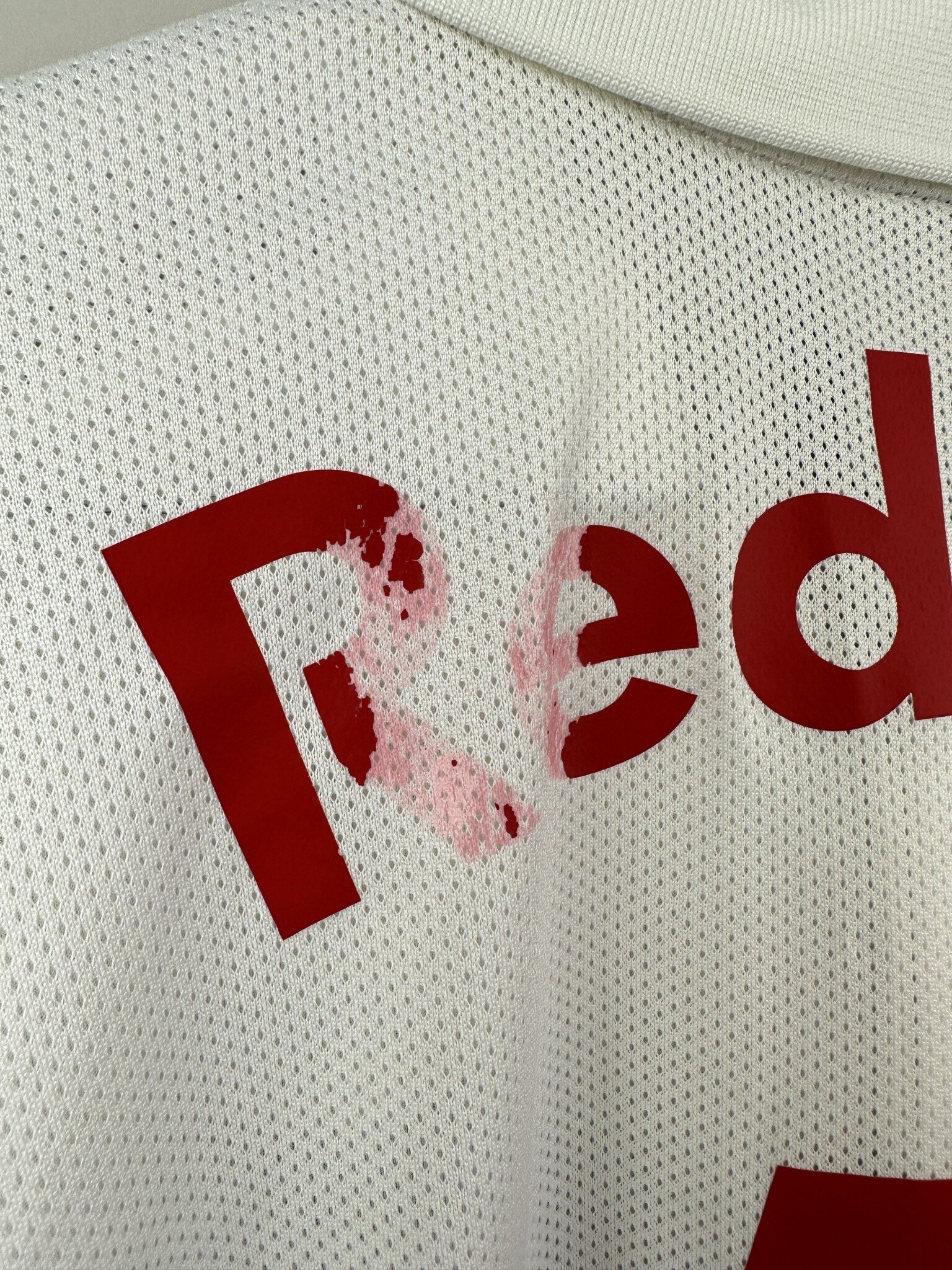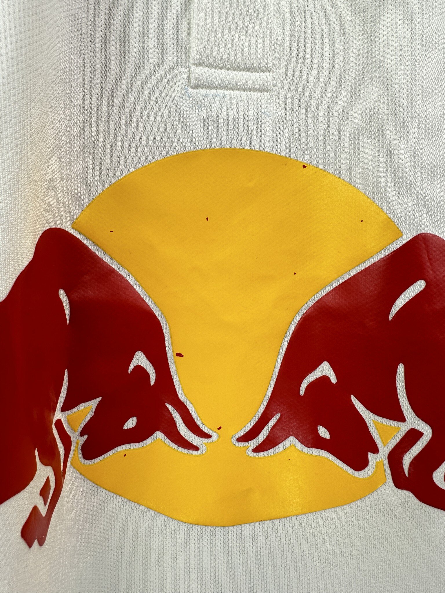 Stan: Zadowalający – drobne zabrudzenia i uszkodzenia nadruku sponsora oraz patcha na froncie, na dodatek ubytek w nadruku na plecach.