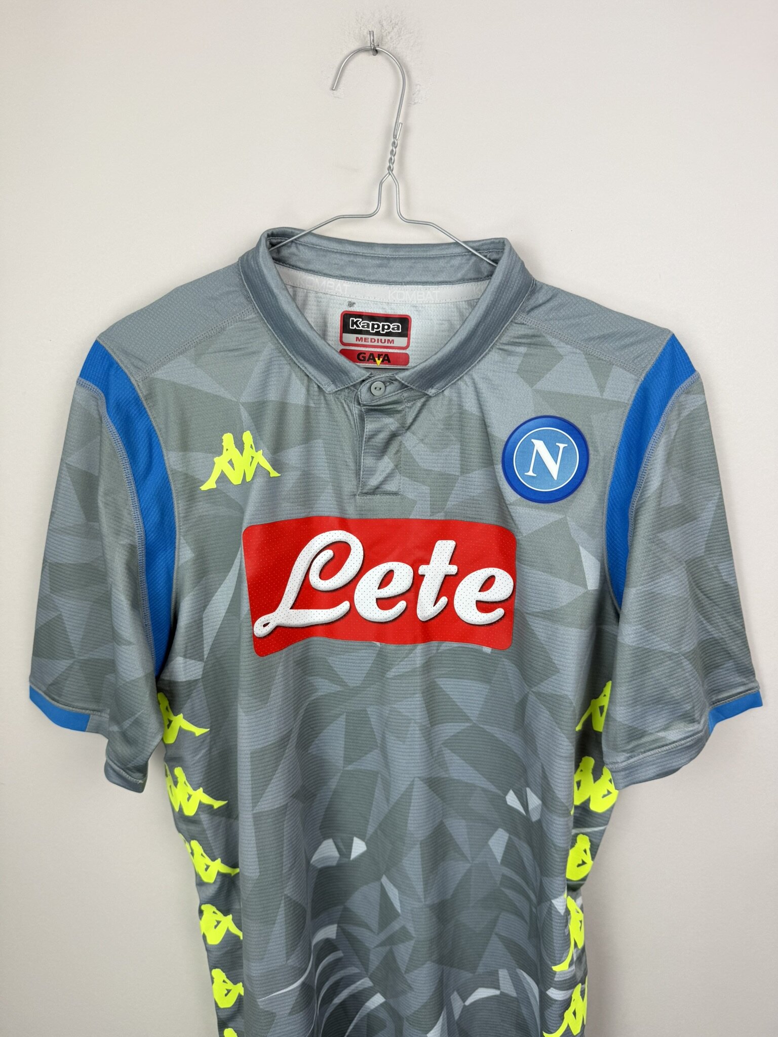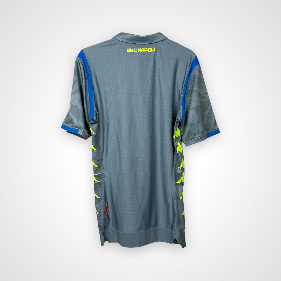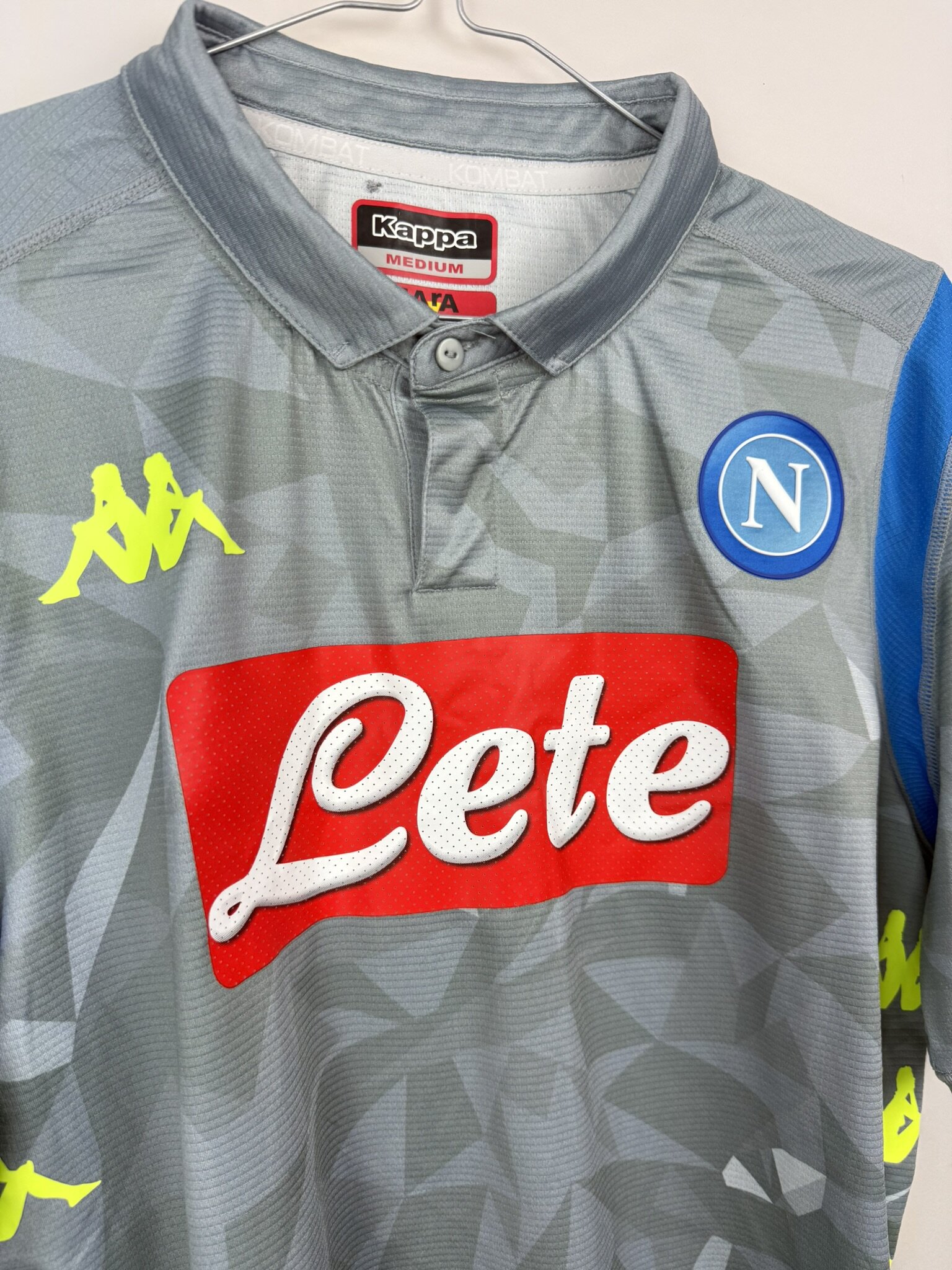 Oryginalna koszulka piłkarska SSC Napoli z sezonu 2018/19 służąca jako trzeci komplet. Przeważająca szarość, kołnierzyk i żółte oraz niebieskie wstawki, czyli Kappa w całej swojej okazałości. Klub w tamtym sezonie zajął drugie miejsce w Serie A, a w ataku szalał Arkadiusz Milik, który został najlepszym strzelcem zespołu z 17 trafieniami na koncie.