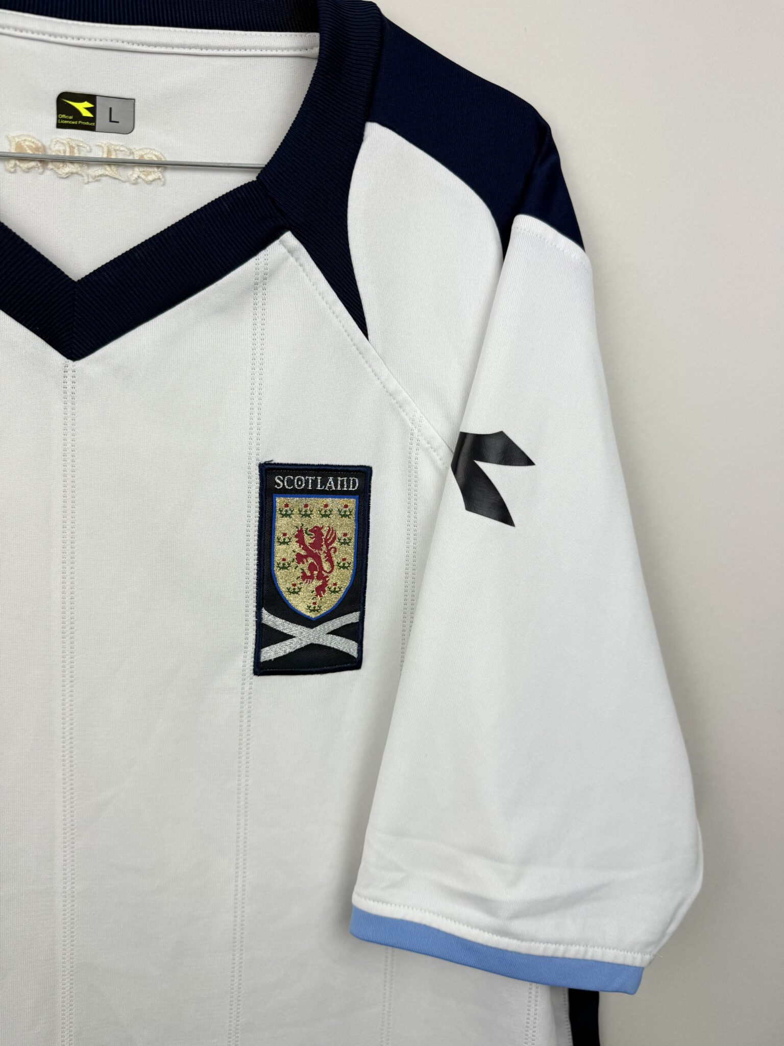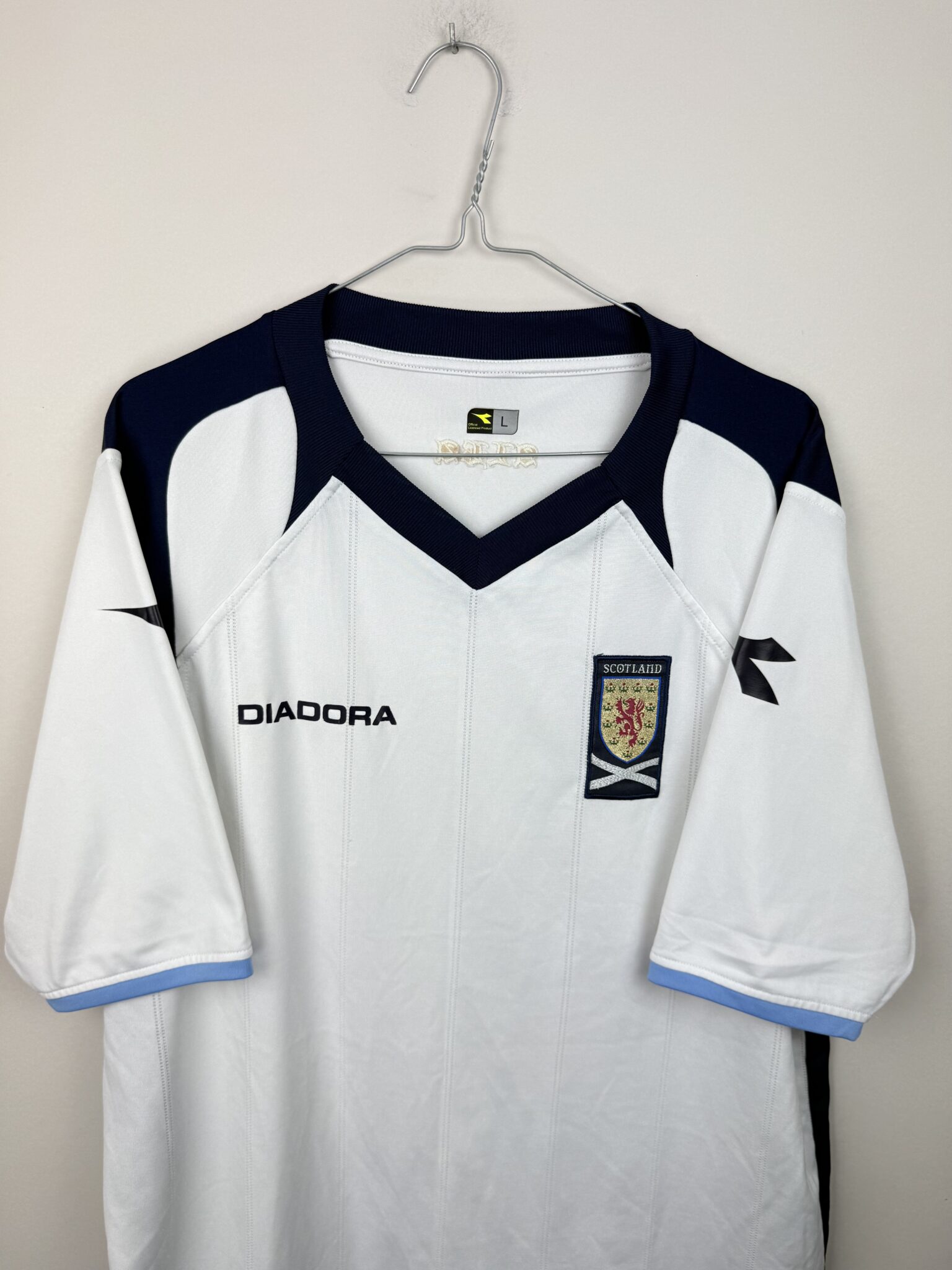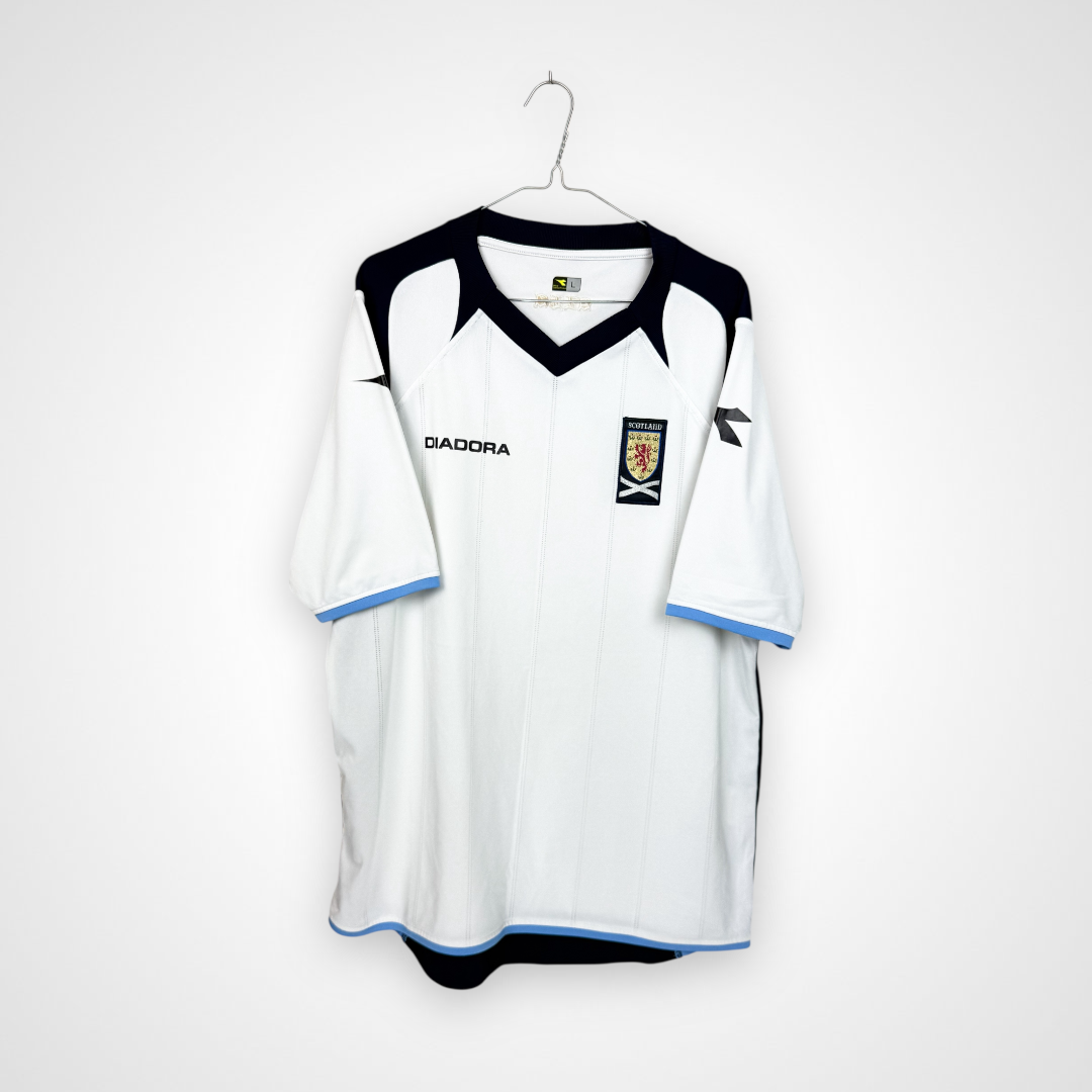 Wyjazdowa, oryginalna koszulka piłkarska reprezentacji Szkocji z lat 2008-10 produkcji włoskiej marki Diadora. W tej koszulce Szkoci rywalizowali m.in. w eliminacjach do Mistrzostw Świata 2010, mierząc się z takimi zespołami jak Holandia, Norwegia czy Macedonia.