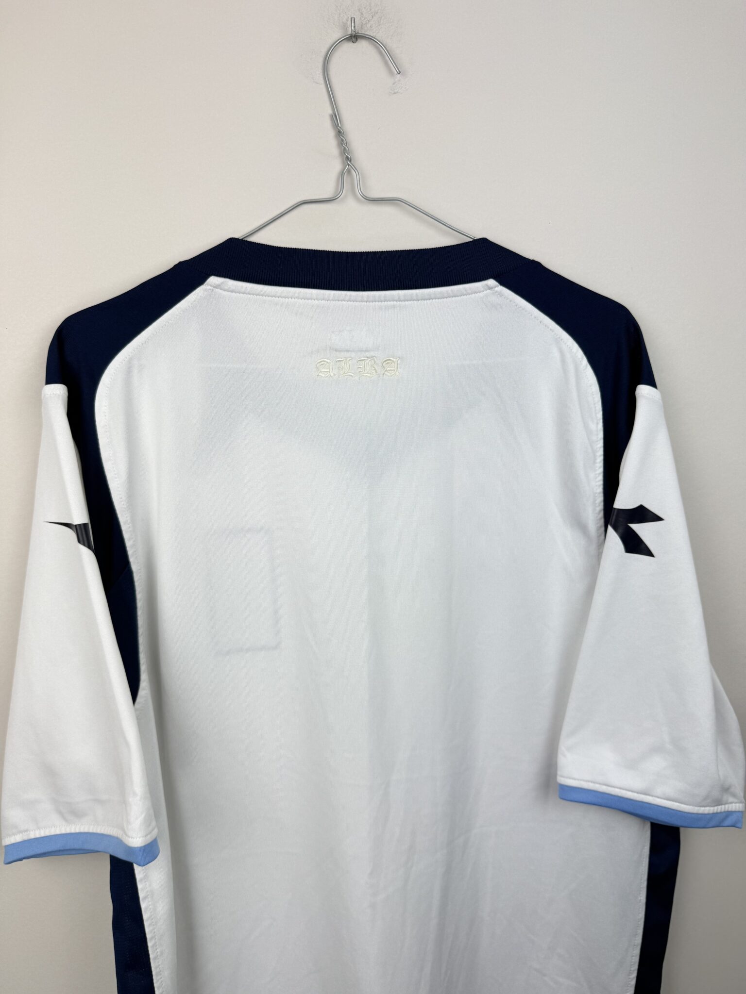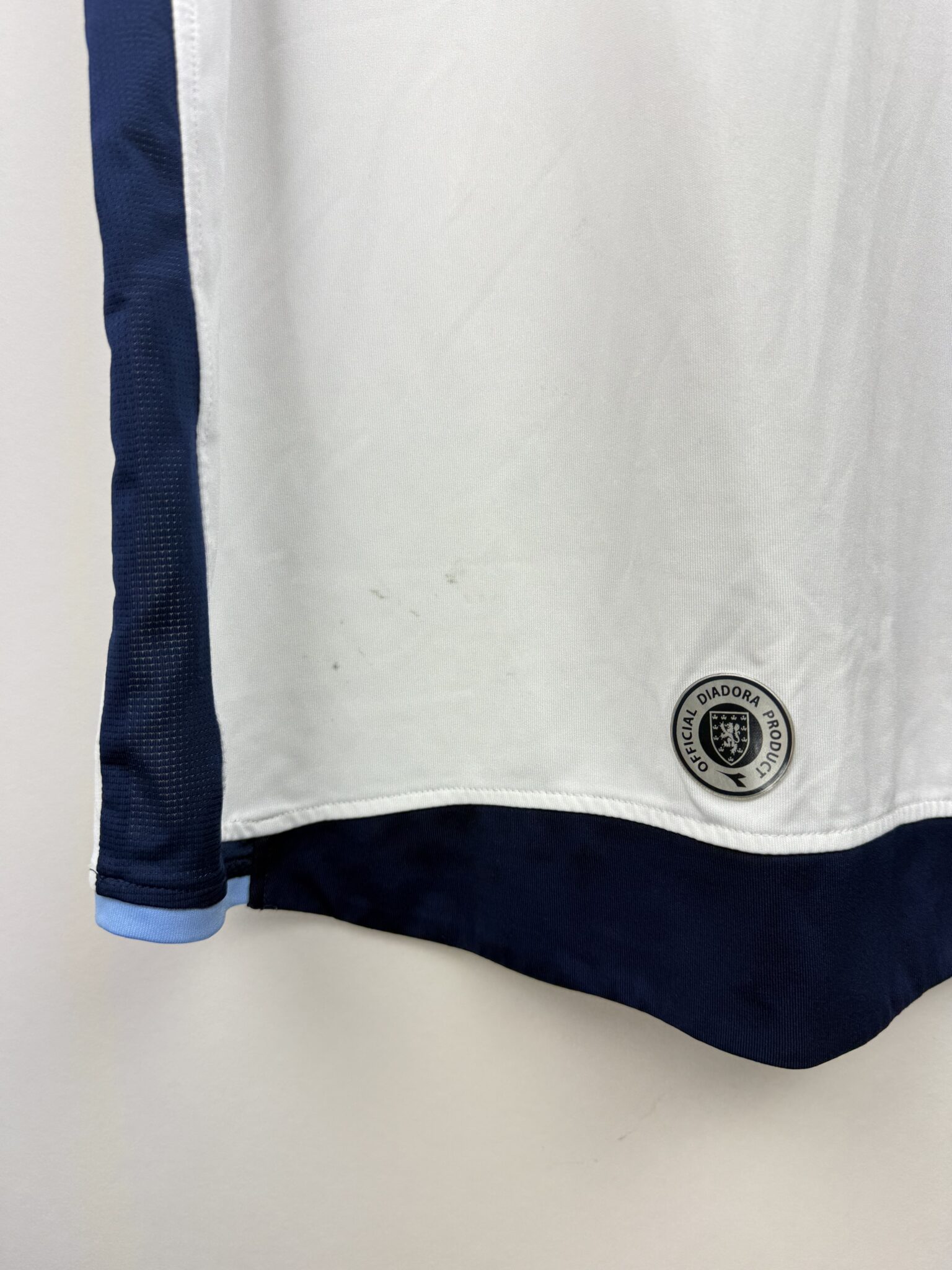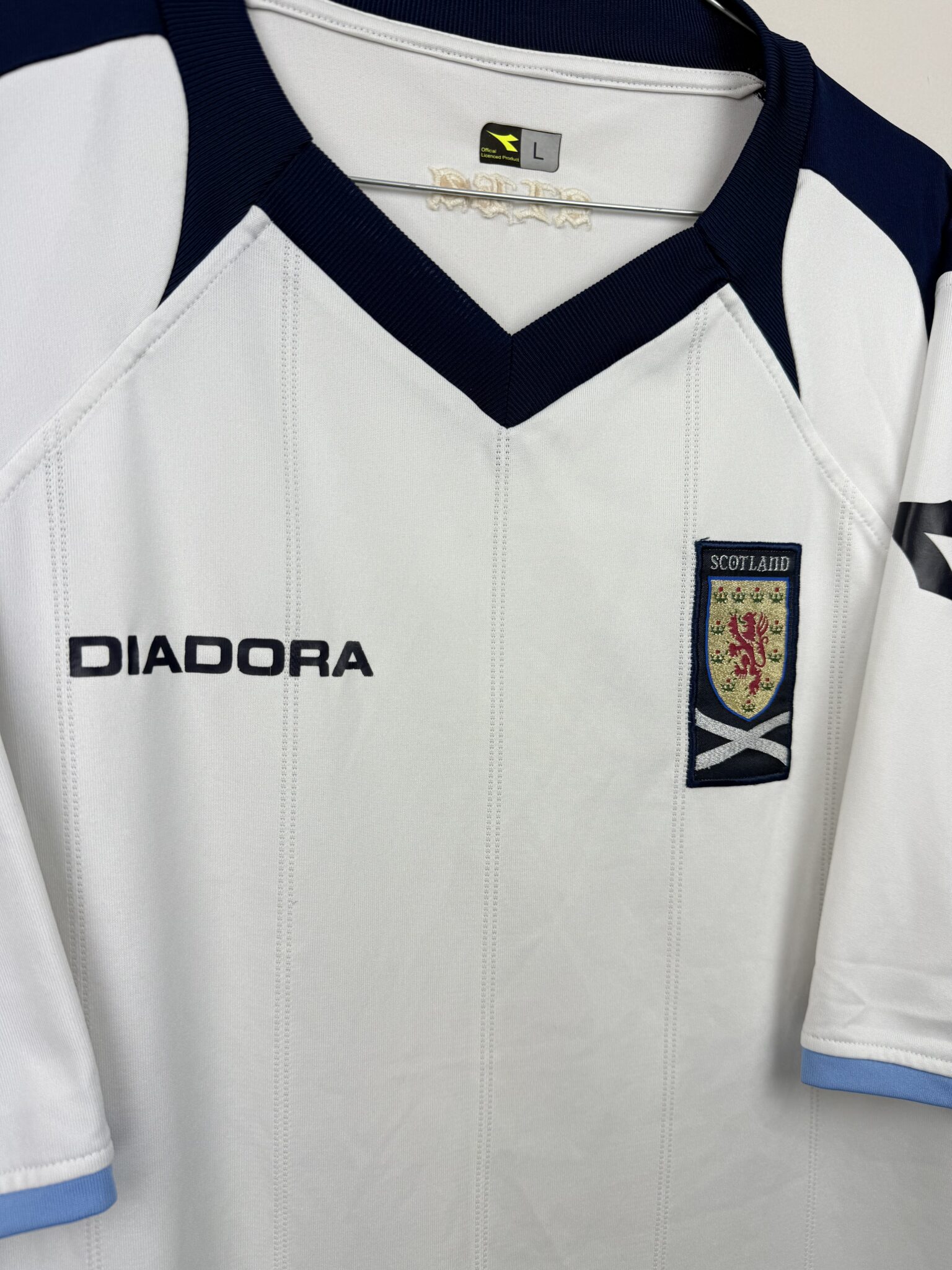 Wyjazdowa, oryginalna koszulka piłkarska reprezentacji Szkocji z lat 2008-10 produkcji włoskiej marki Diadora. W tej koszulce Szkoci rywalizowali m.in. w eliminacjach do Mistrzostw Świata 2010, mierząc się z takimi zespołami jak Holandia, Norwegia czy Macedonia.