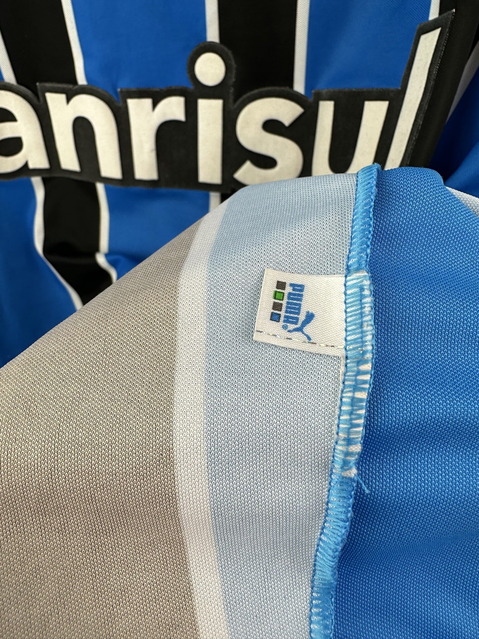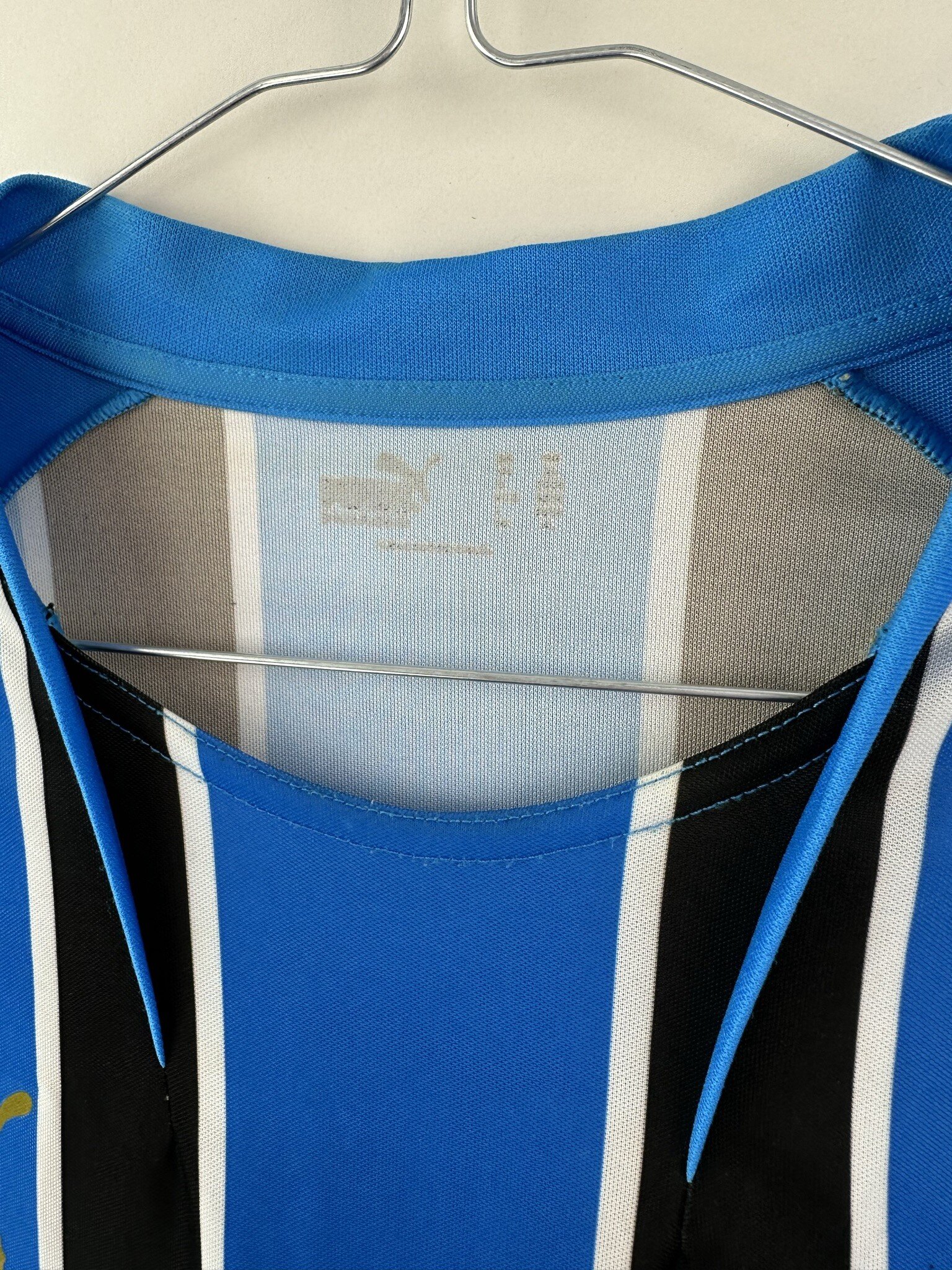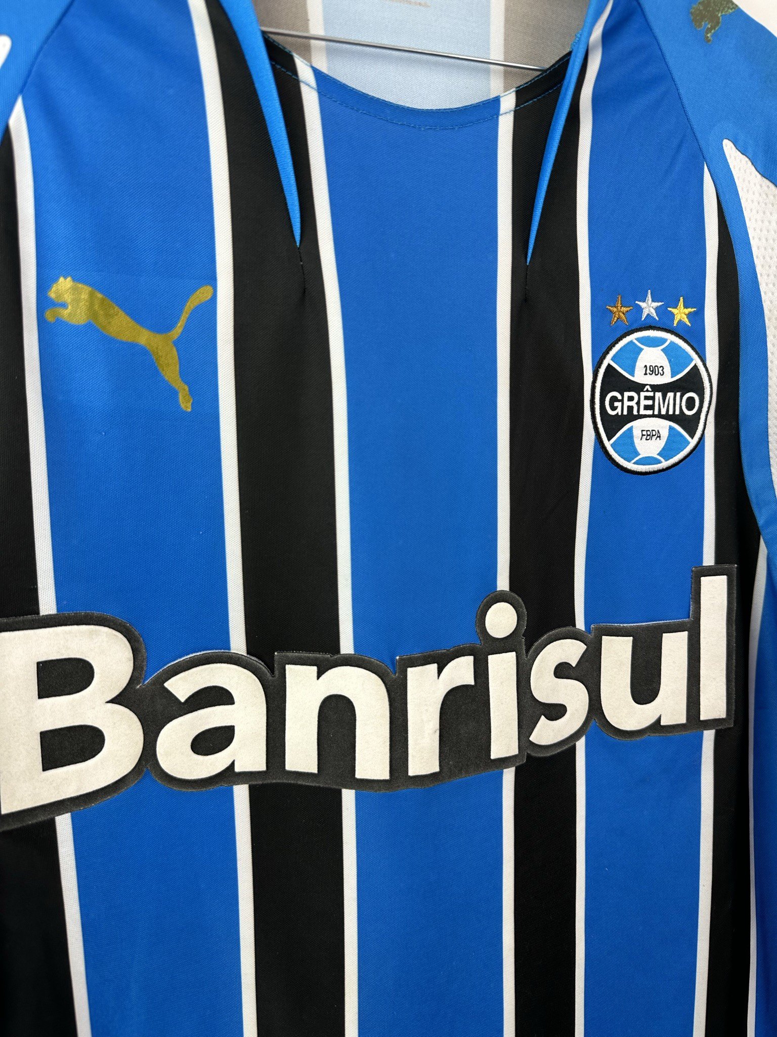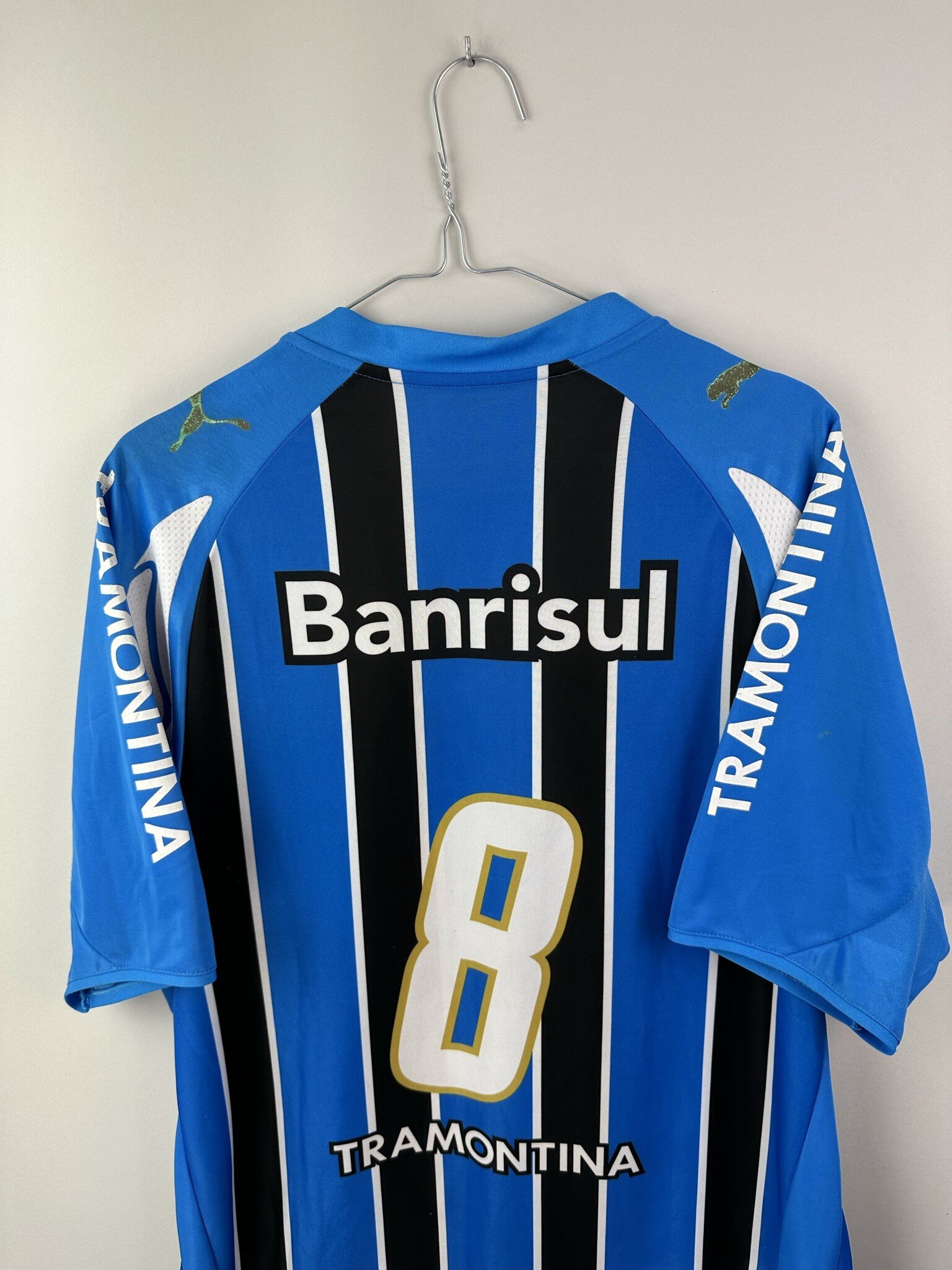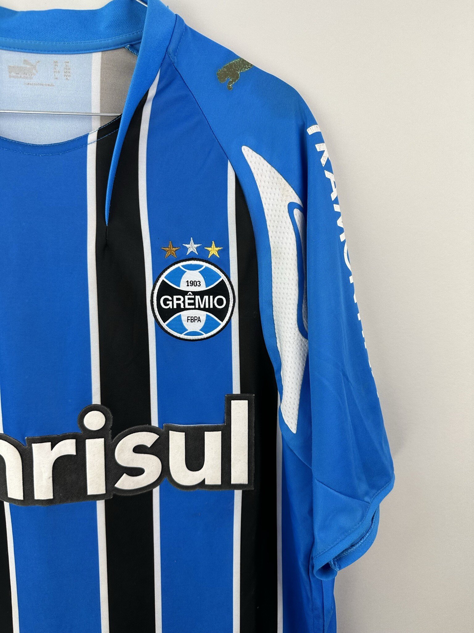 Stan: Zadowalający – sporo niewielkich zaciągnięć, starta naszywka z rozmiarem na karku, popękane nadruki sponsora na rękawkach, odklejający się napis 'Banrisul’ na froncie oraz wycięta duża metka ze środka koszulki.