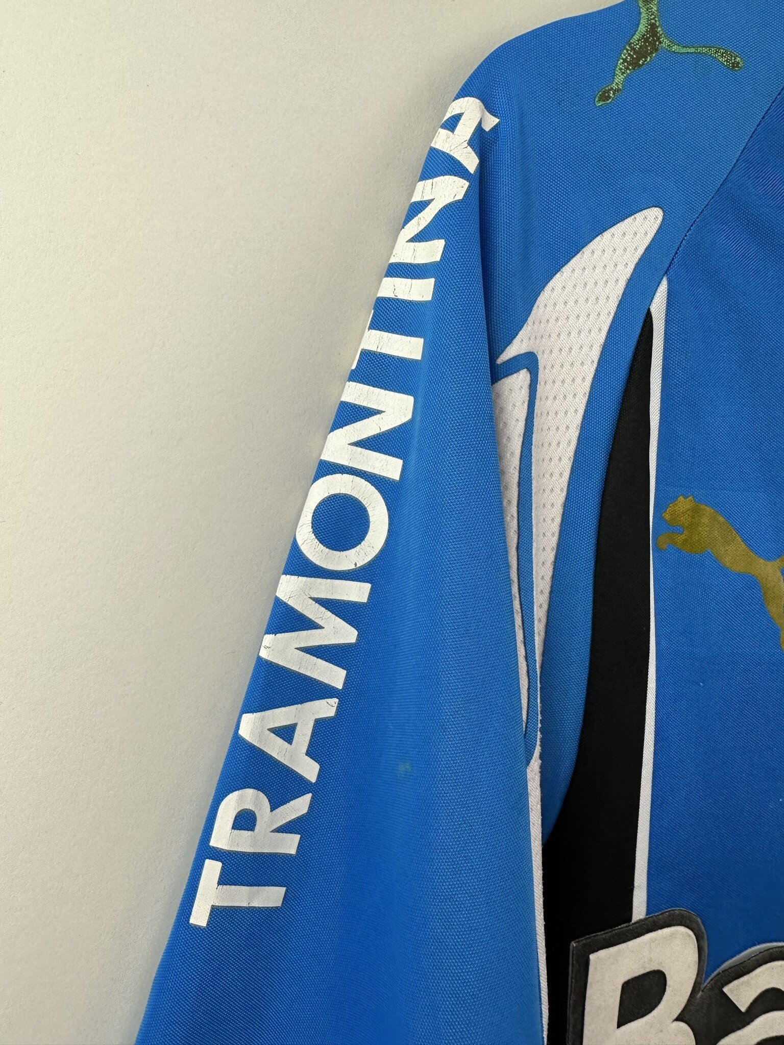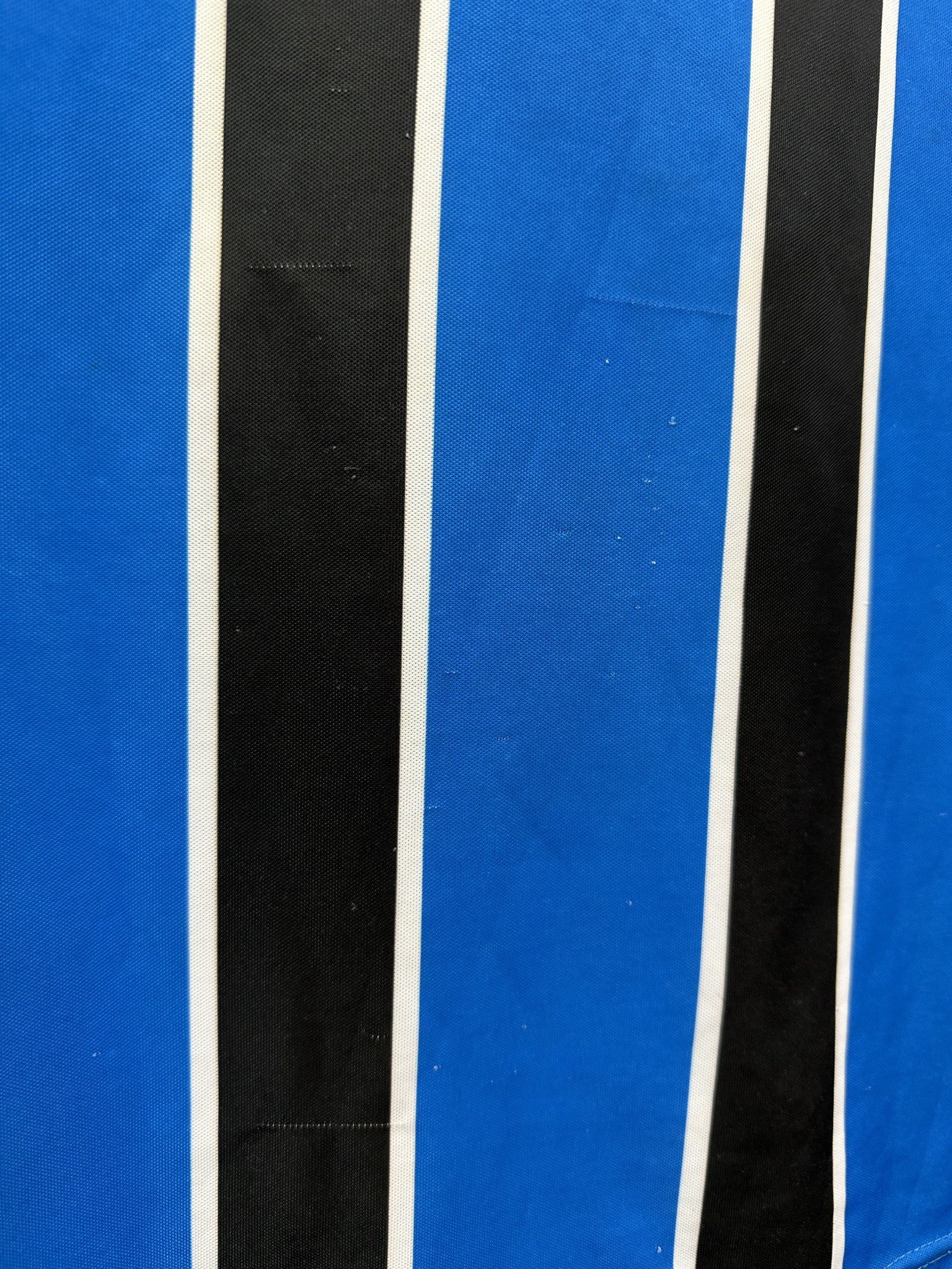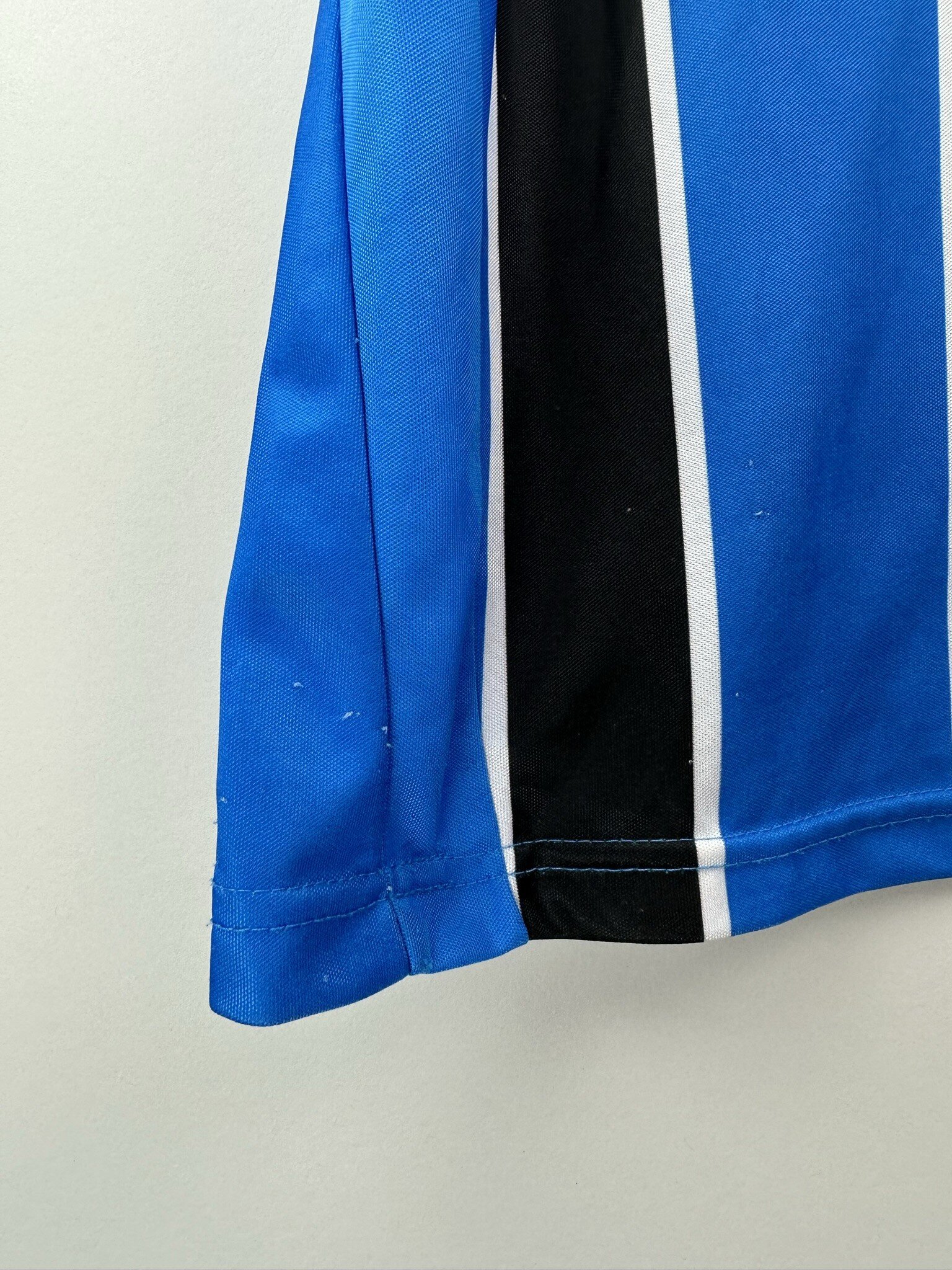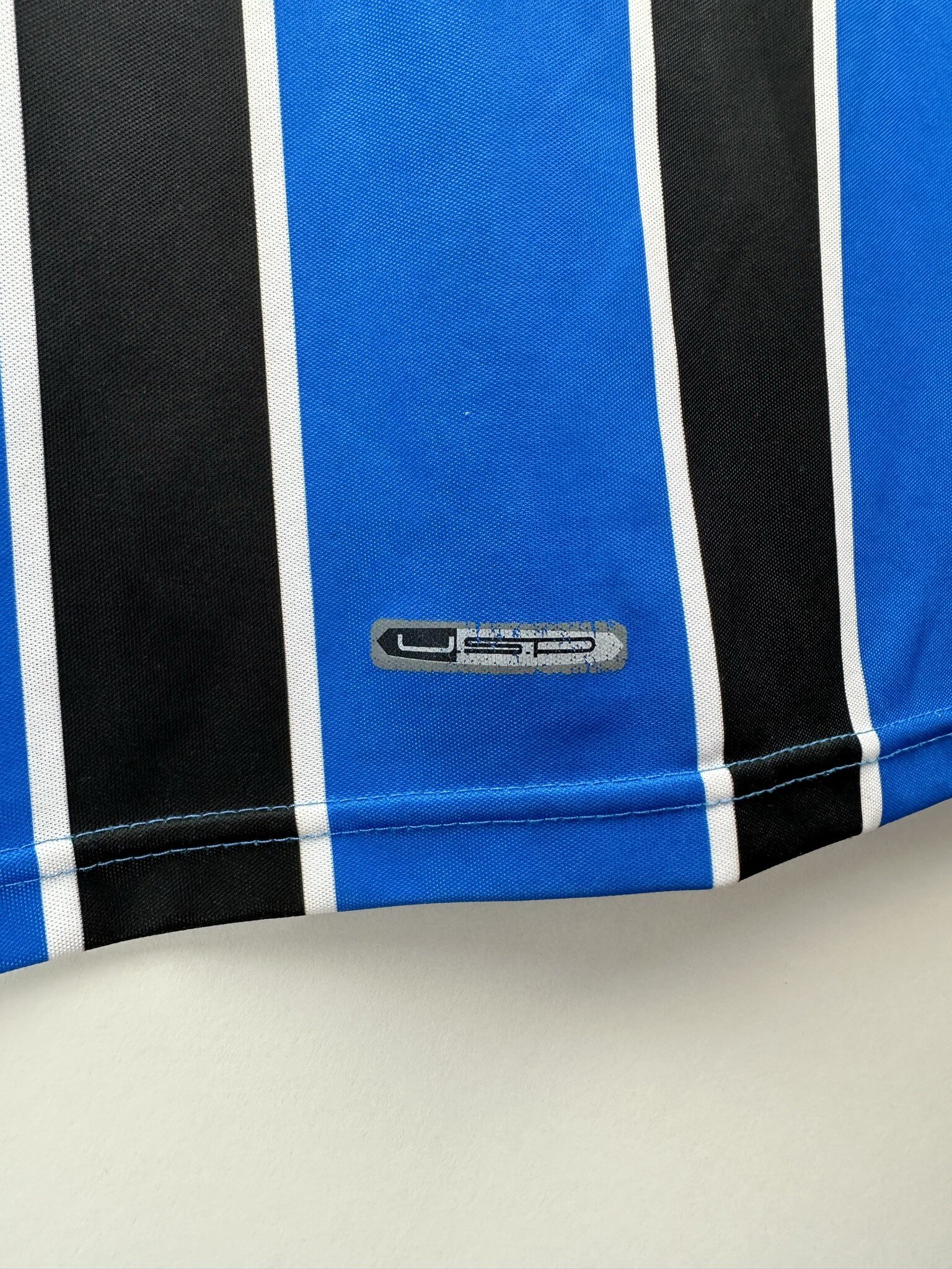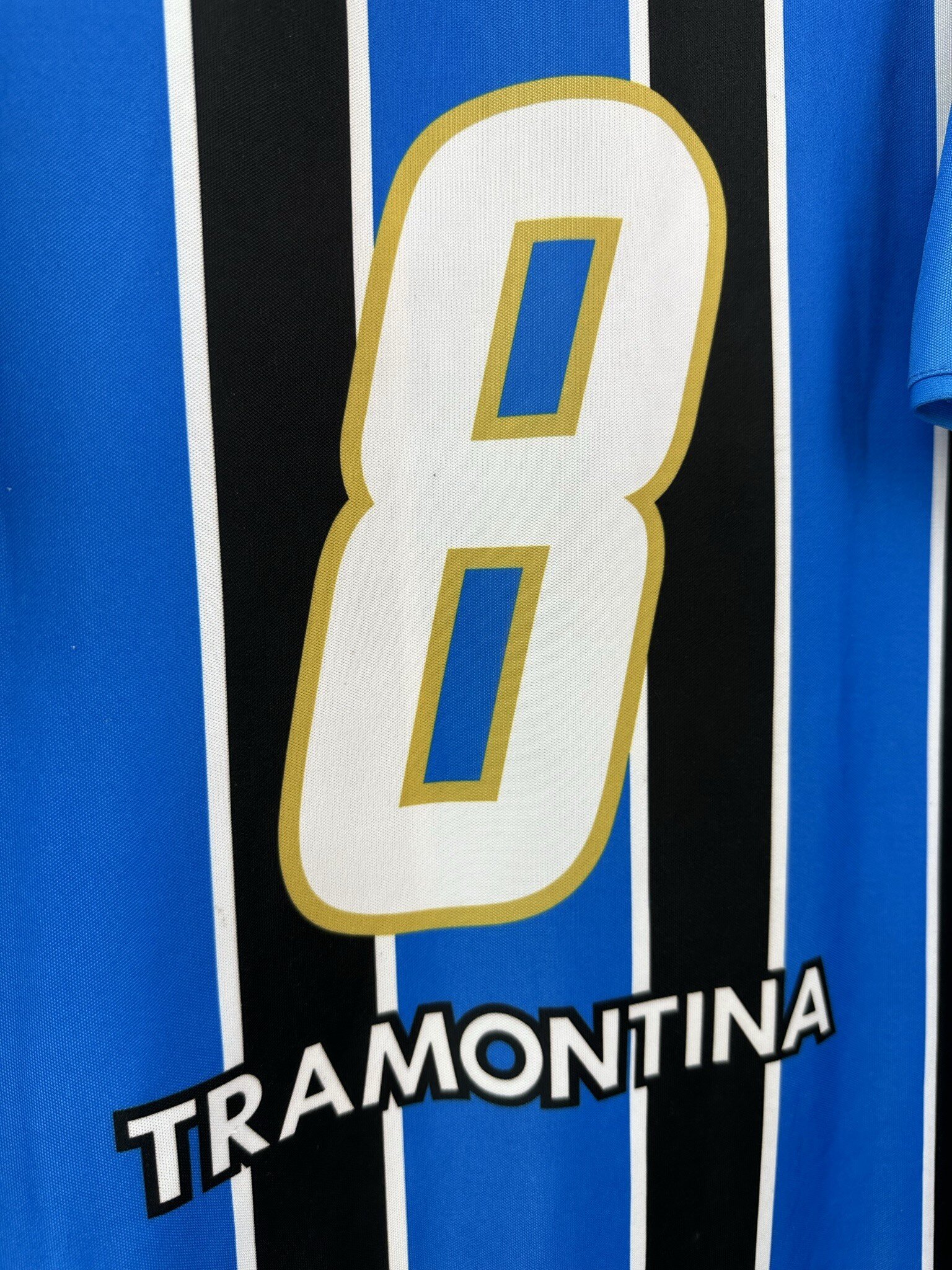 Stan: Zadowalający – sporo niewielkich zaciągnięć, starta naszywka z rozmiarem na karku, popękane nadruki sponsora na rękawkach, odklejający się napis 'Banrisul’ na froncie oraz wycięta duża metka ze środka koszulki.