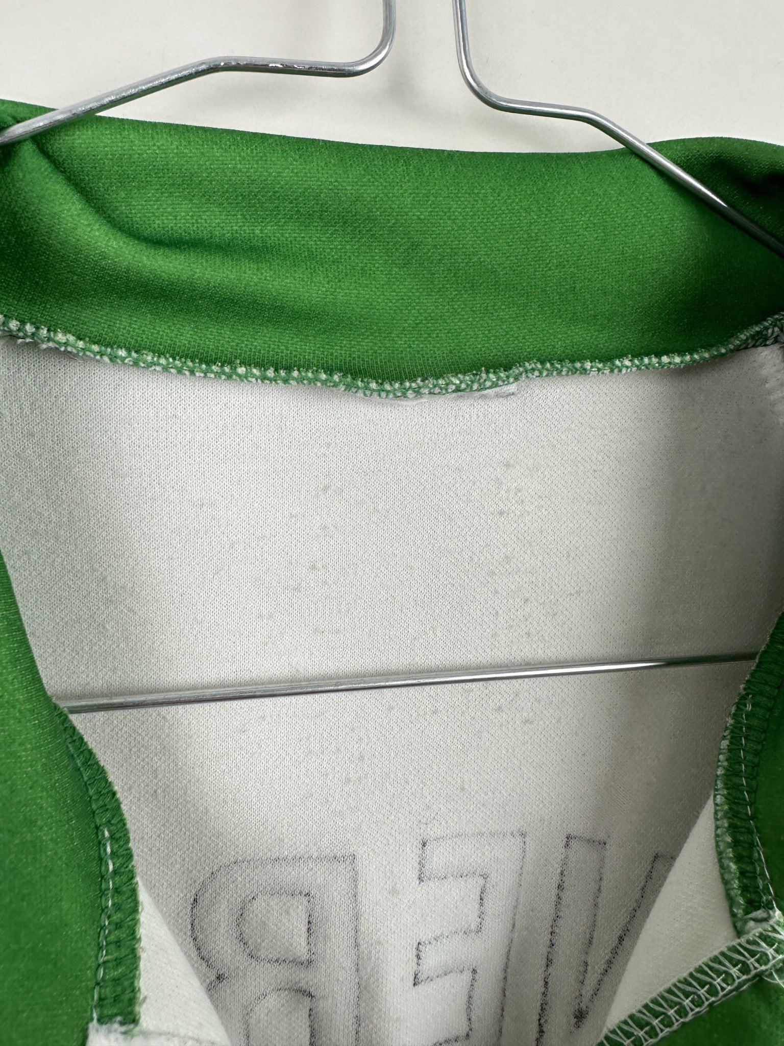 Stan: Zadowalający – ucięta metka z rozmiarem na karku, zaciągnięcie na froncie oraz zabrudzenie na plecach.
