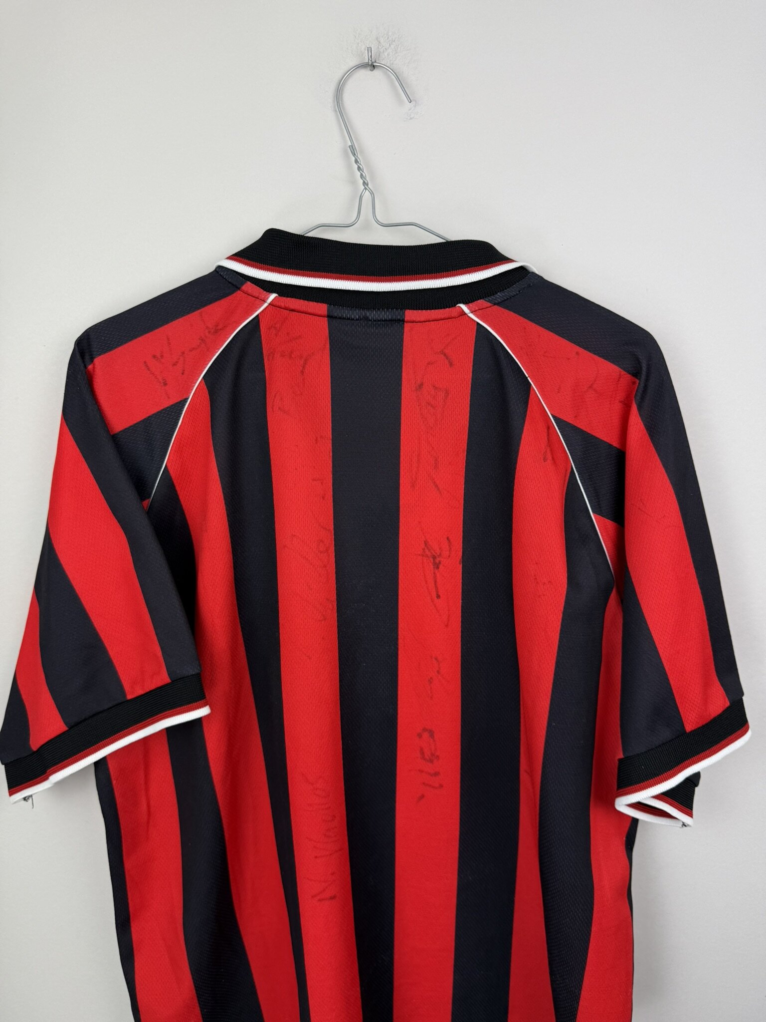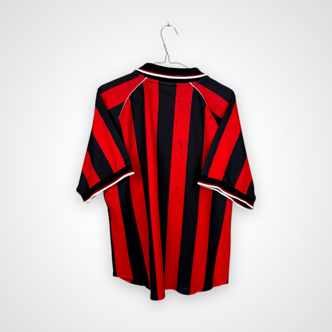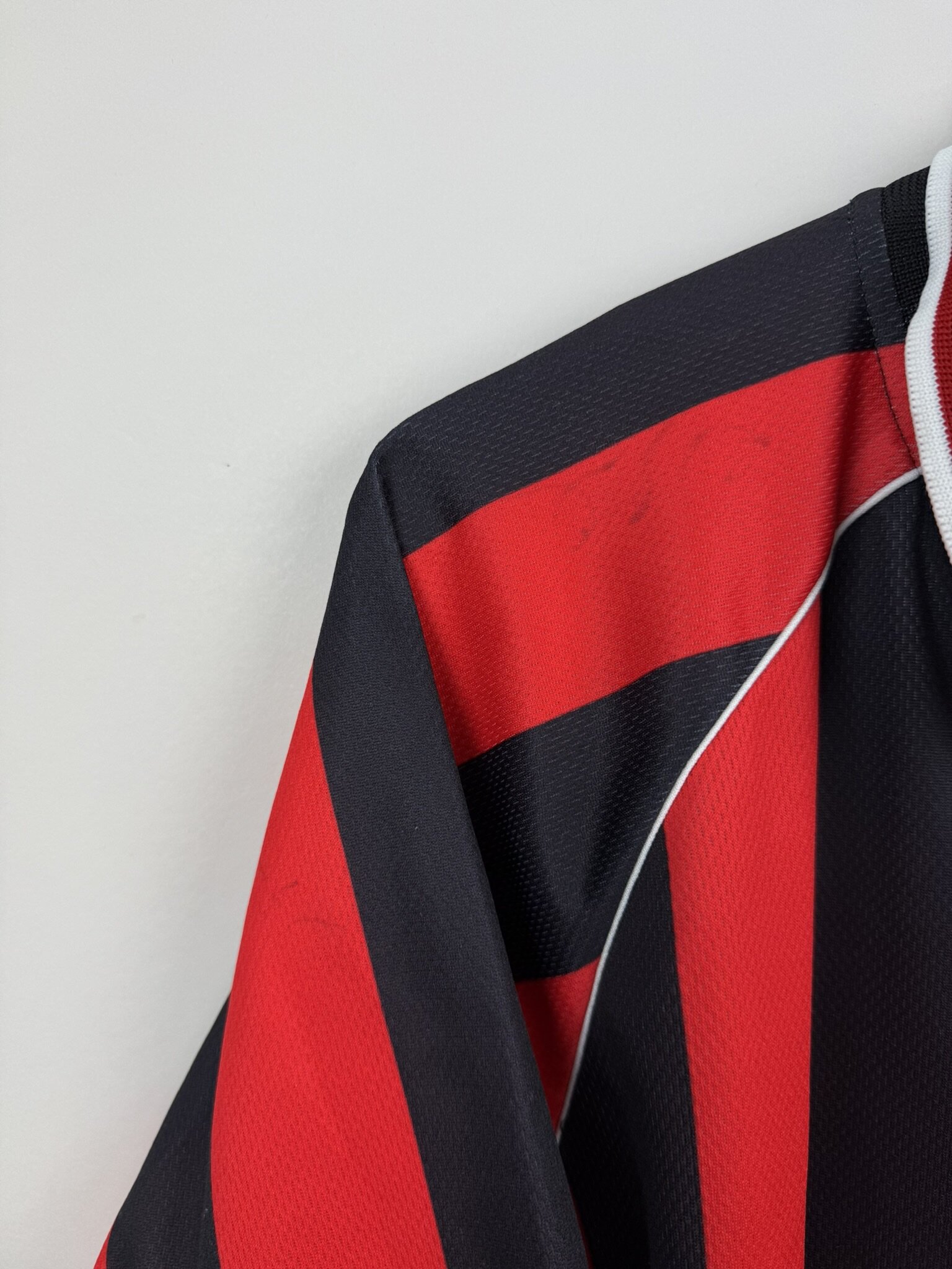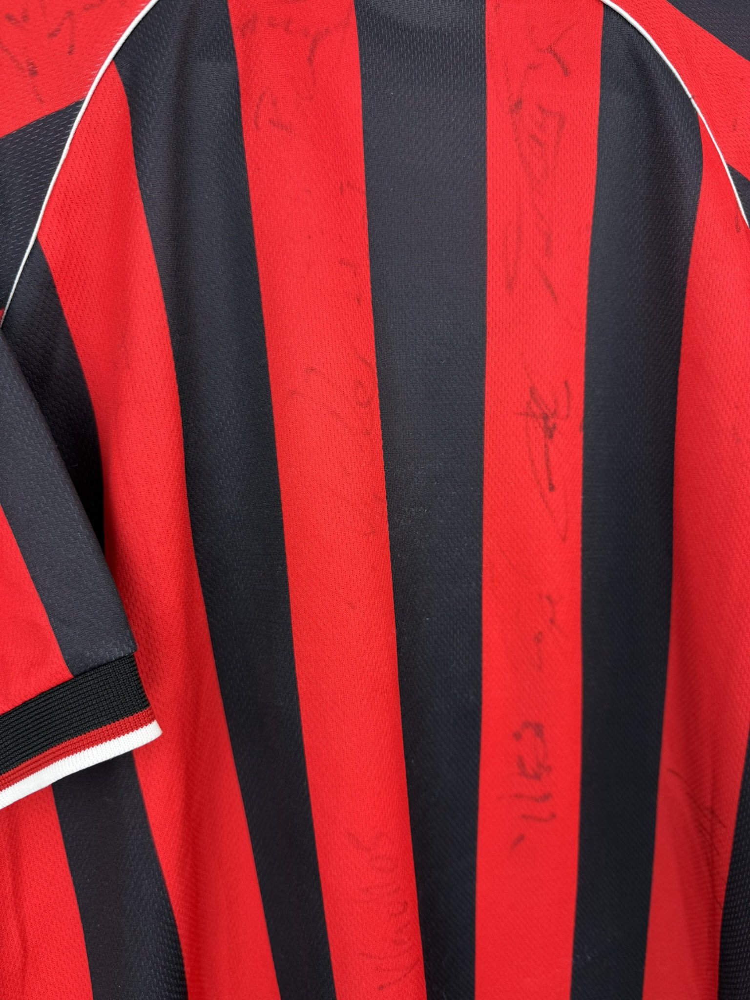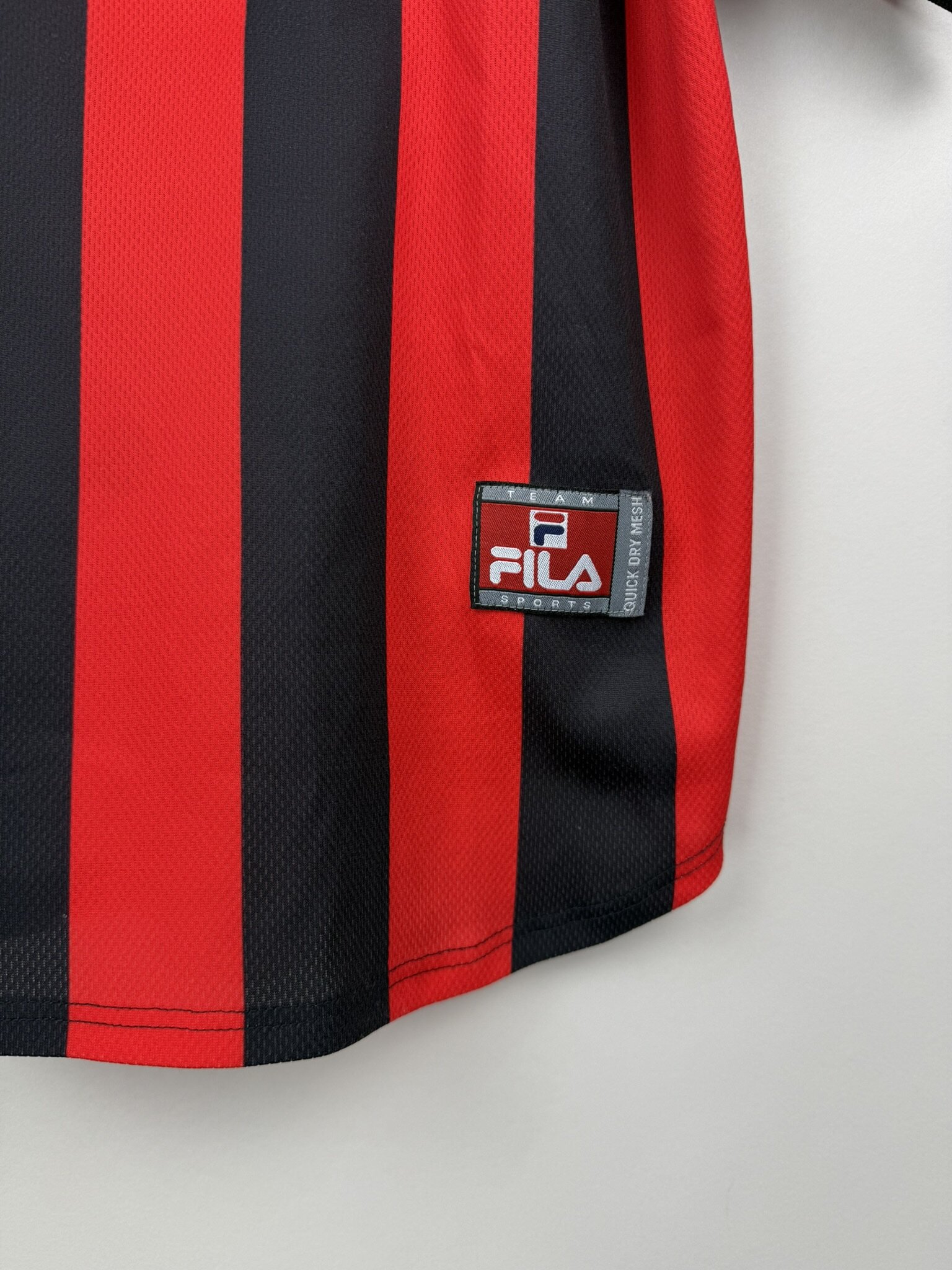 Oryginalna domowa koszulka piłkarska Eintrachtu Frankfurt z sezonów 2001–2003, wyprodukowana przez kultową markę Fila, to klasyka niemieckiego futbolu z początku XXI wieku. Utrzymana w tradycyjnych, czerwono-czarnych pasach, z czarnym kołnierzem i detalami, doskonale oddaje tożsamość klubu z Hesji.