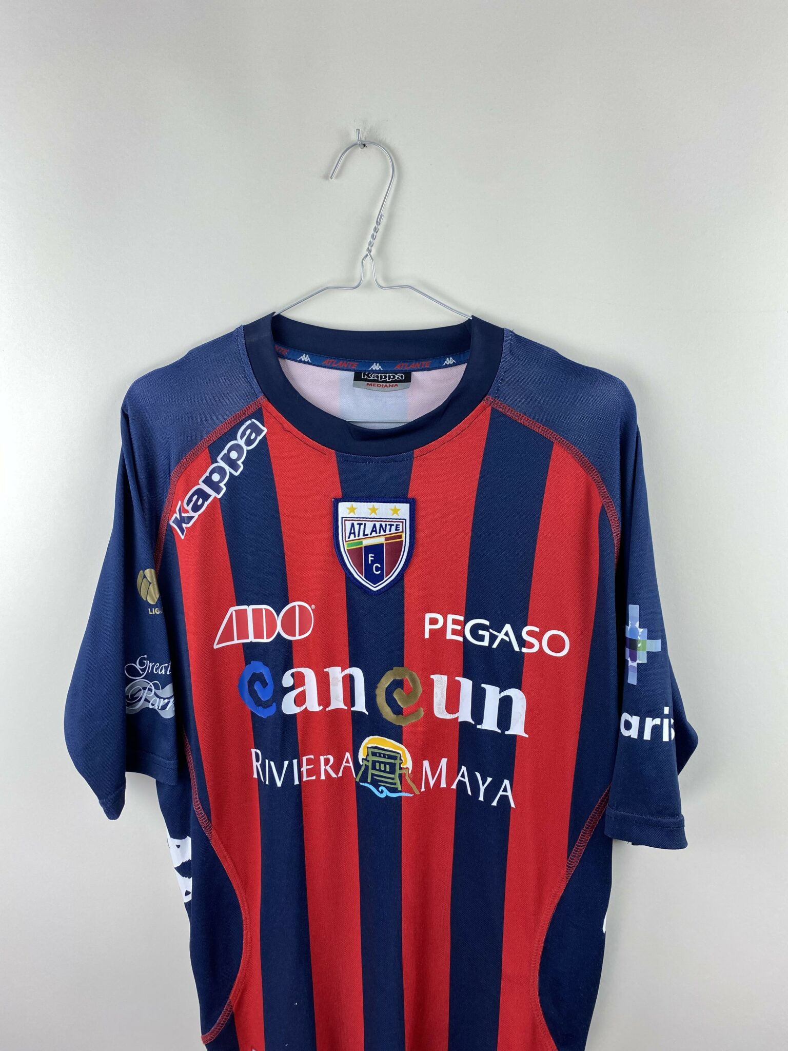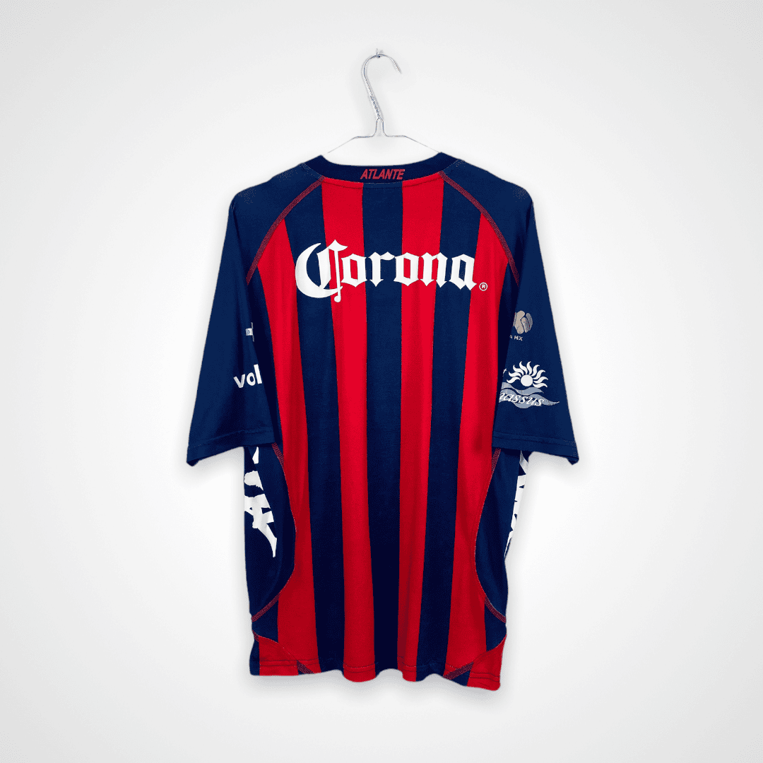 Ta klasyczna domowa koszulka Atlante FC 2013/14, wyprodukowana przez Kappę, utrzymana jest w charakterystycznym granatowo-czerwonym pasiaku, który od lat symbolizuje barwy drużyny z Cancún. Na froncie umieszczono logotyp sponsora Riviera Maya, a na odwrocie charakterystyczne logo piwnego giganta Corona, które doskonale podkreśla autentyczność koszulki.