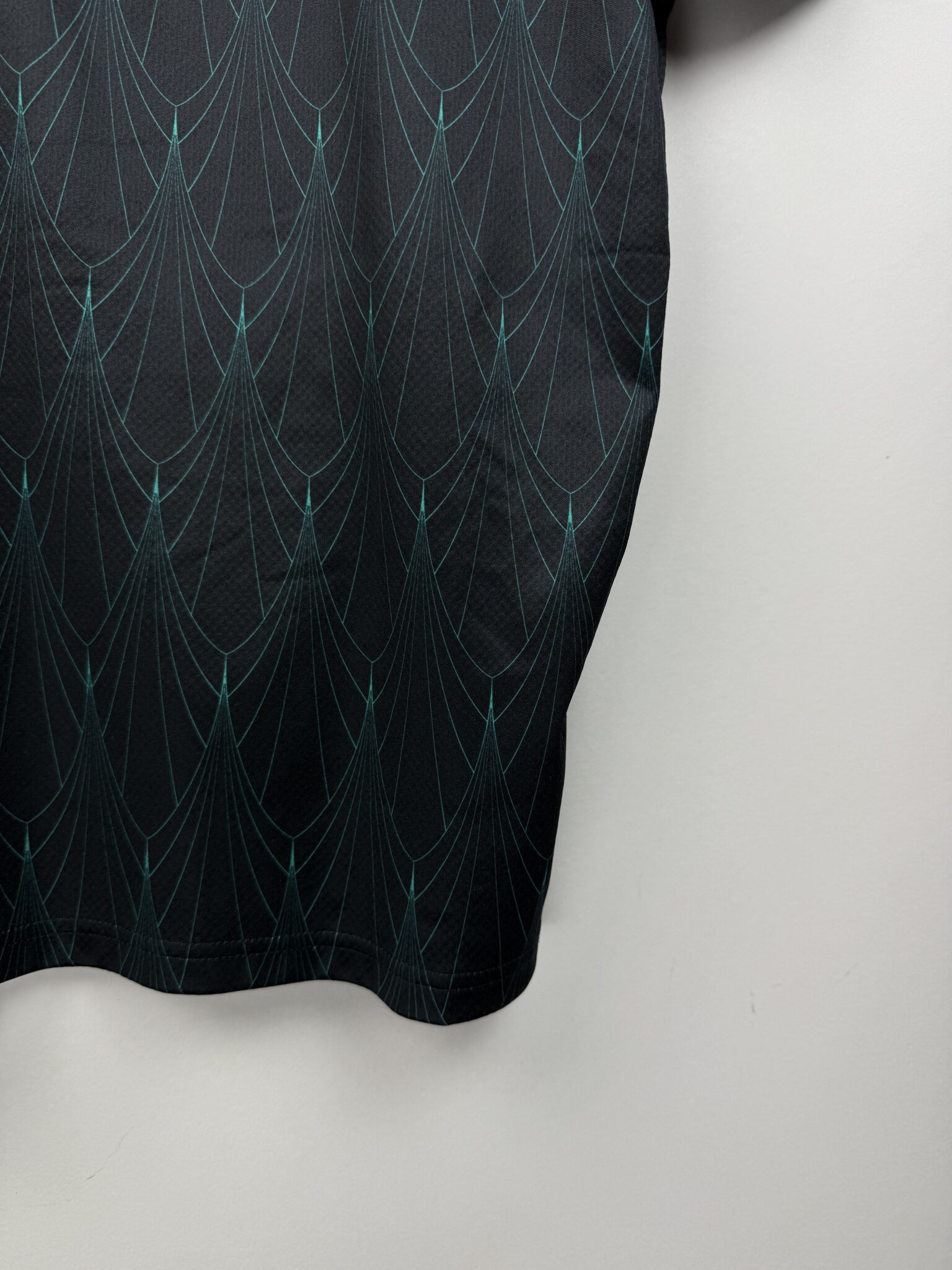 Przedstawiamy wyjazdową koszulkę piłkarską reprezentacji Austrii z lat 2020–2022, stworzoną przez Pumę, cenioną markę łączącą sportowy design z nowoczesną technologią. Model w eleganckim czarnym kolorze przełamany jest subtelnym wzorem inspirowanym austriacką sztuką secesyjną, co nadaje mu wyjątkowego, stylowego charakteru. Na piersi znajduje się minimalistyczny, biały herb Austriackiego Związku Piłki Nożnej (ÖFB) oraz logo Pumy, a w centralnej części widoczny jest nadrukowany numer zawodnika.