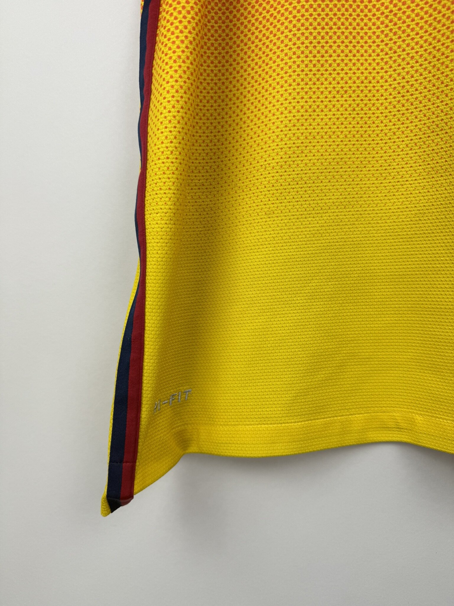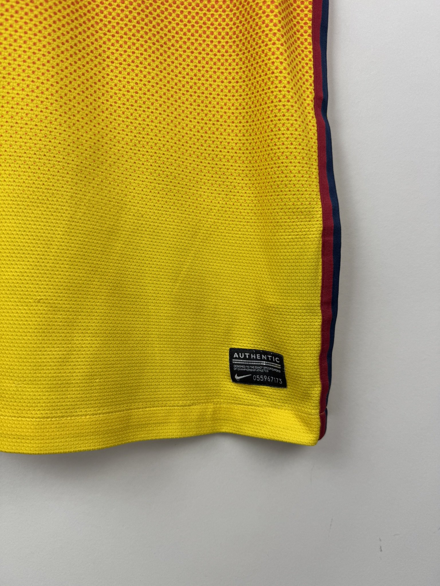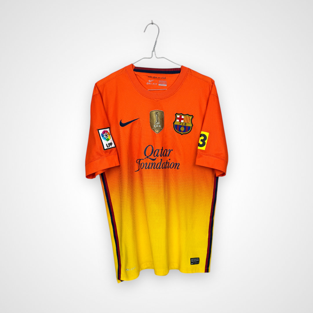 Ta oryginalna wyjazdowa koszulka FC Barcelony z sezonu 2012/13, wyprodukowana przez Nike, to wyjątkowy model utrzymany w efektownym żółto-pomarańczowym gradiencie, który doskonale oddaje nowoczesny styl klubu w tamtym okresie. Egzemplarz posiada oficjalny nadruk Ibrahima Afellaya na plecach – wszechstronnego pomocnika i reprezentanta Holandii, który w tamtych latach występował w barwach „Blaugrany”.