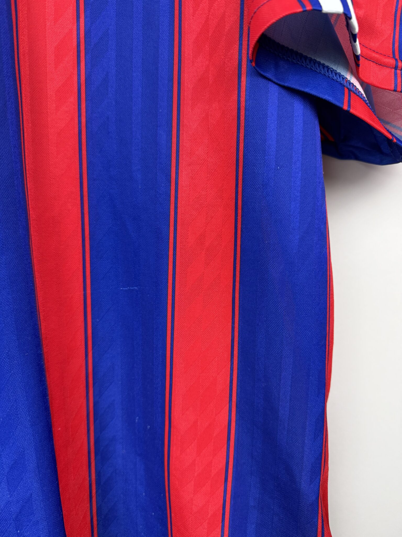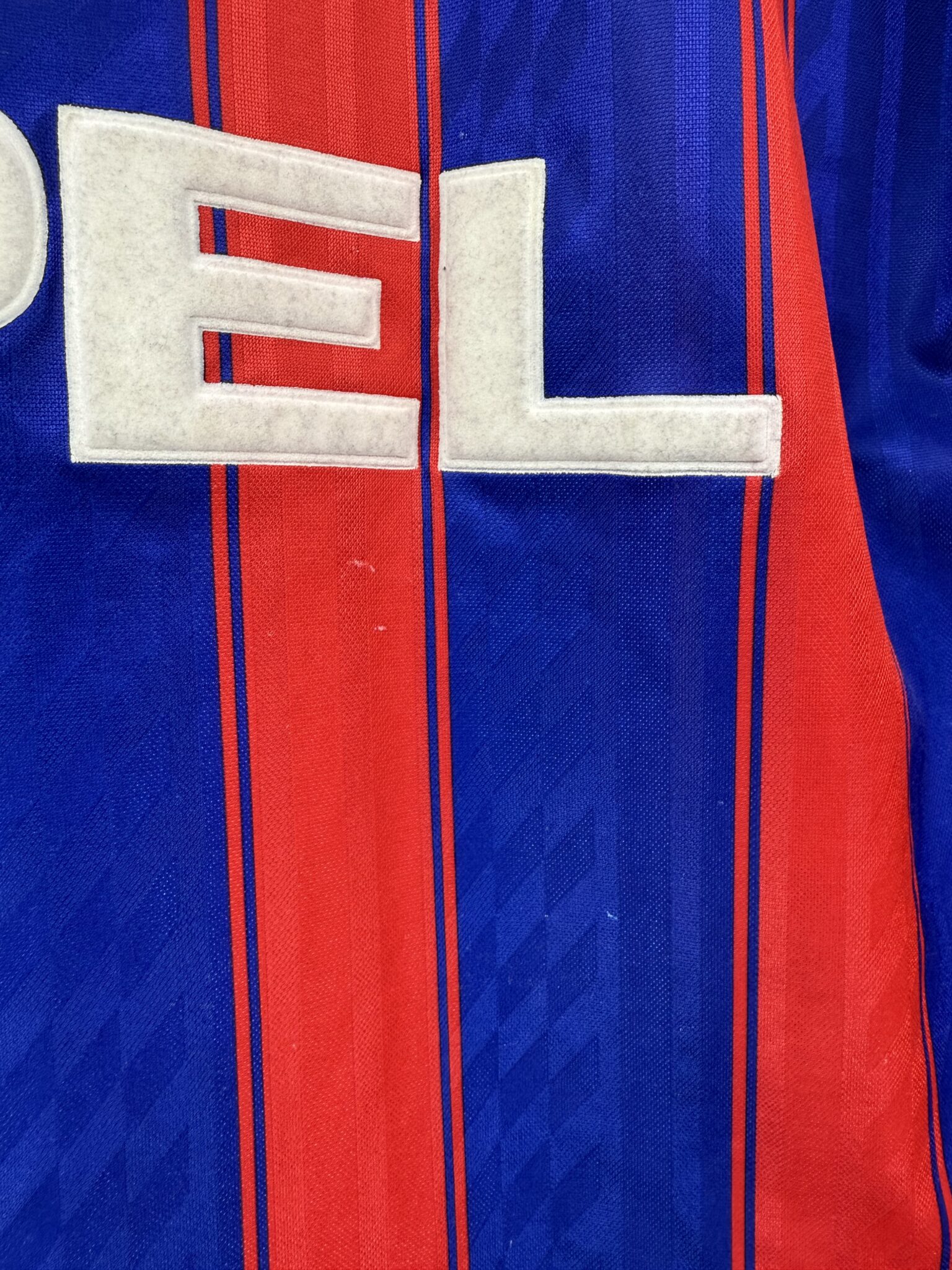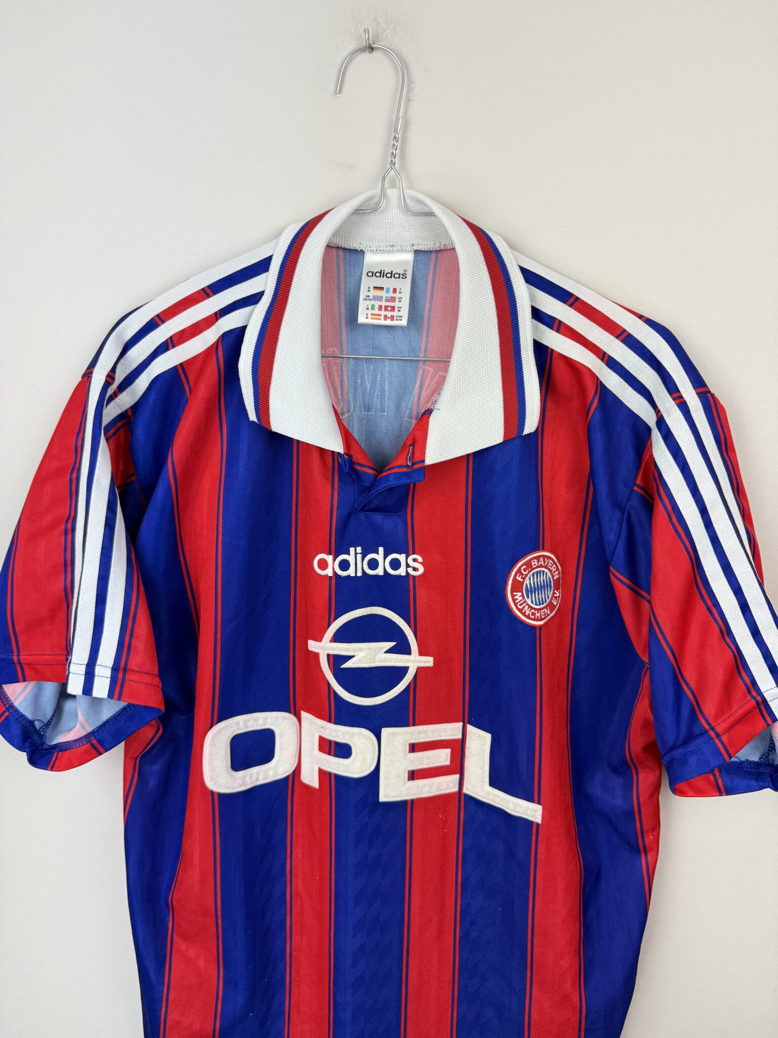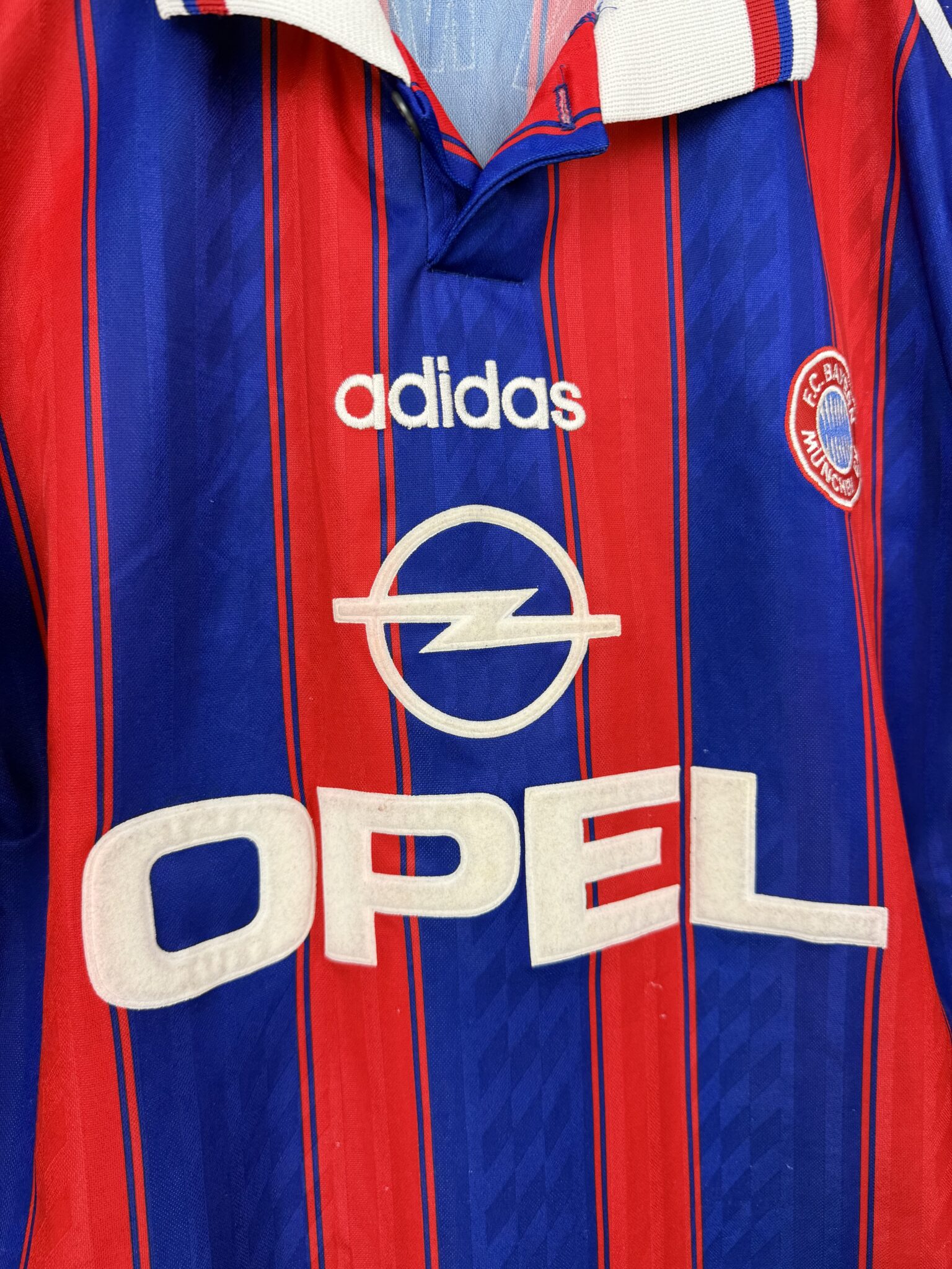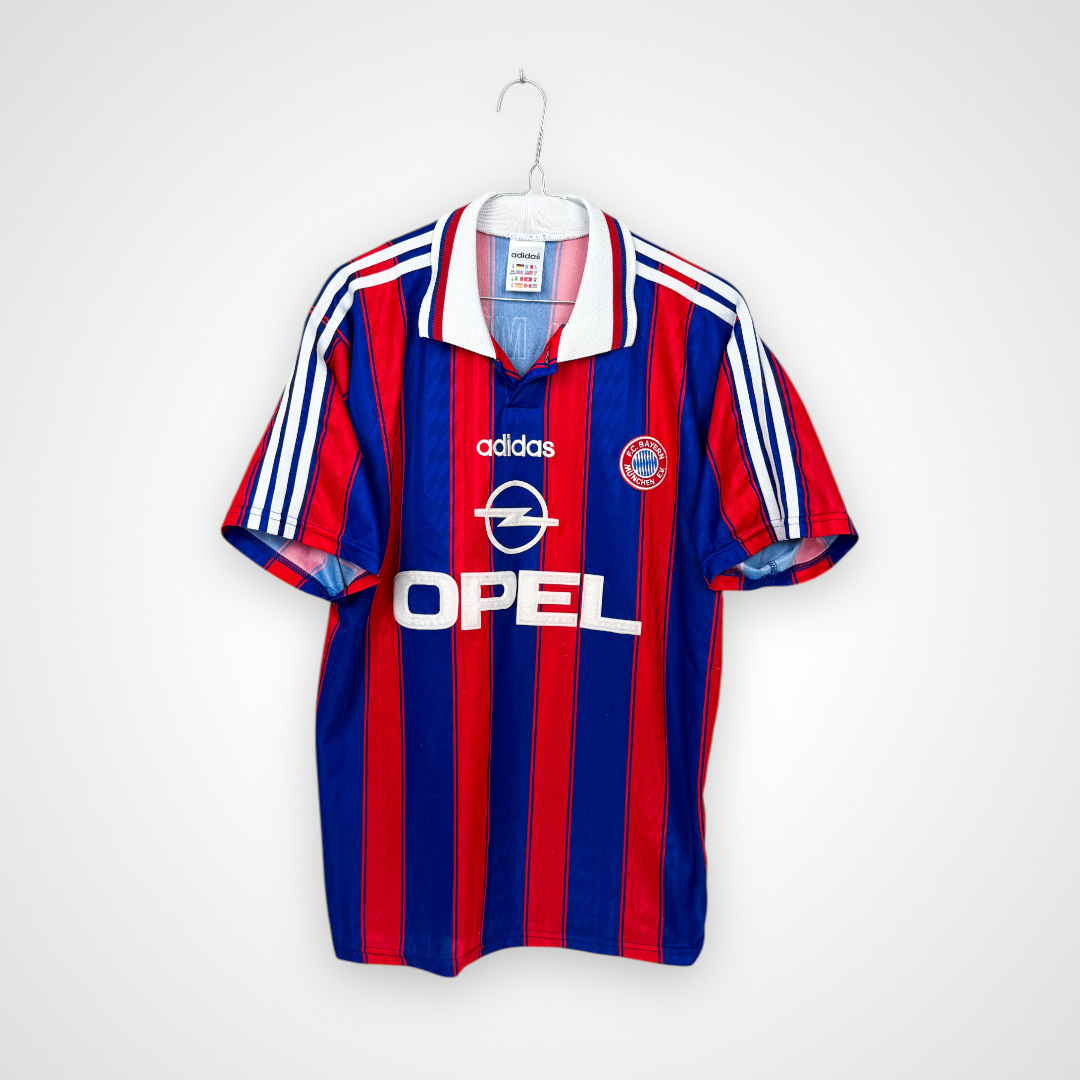 Ta oryginalna domowa koszulka Bayernu Monachium z sezonów 1995–1997, wyprodukowana przez Adidasa, to klasyczny model w charakterystyczne dla tamtej epoki pionowe czerwono-niebieskie pasy. Projekt dopełnia elegancki kołnierzyk w stylu polo z białymi akcentami, a na froncie znalazł się znak sponsora Opel, który przez lata pozostawał symbolem jednej z najbardziej rozpoznawalnych er w historii bawarskiego klubu.